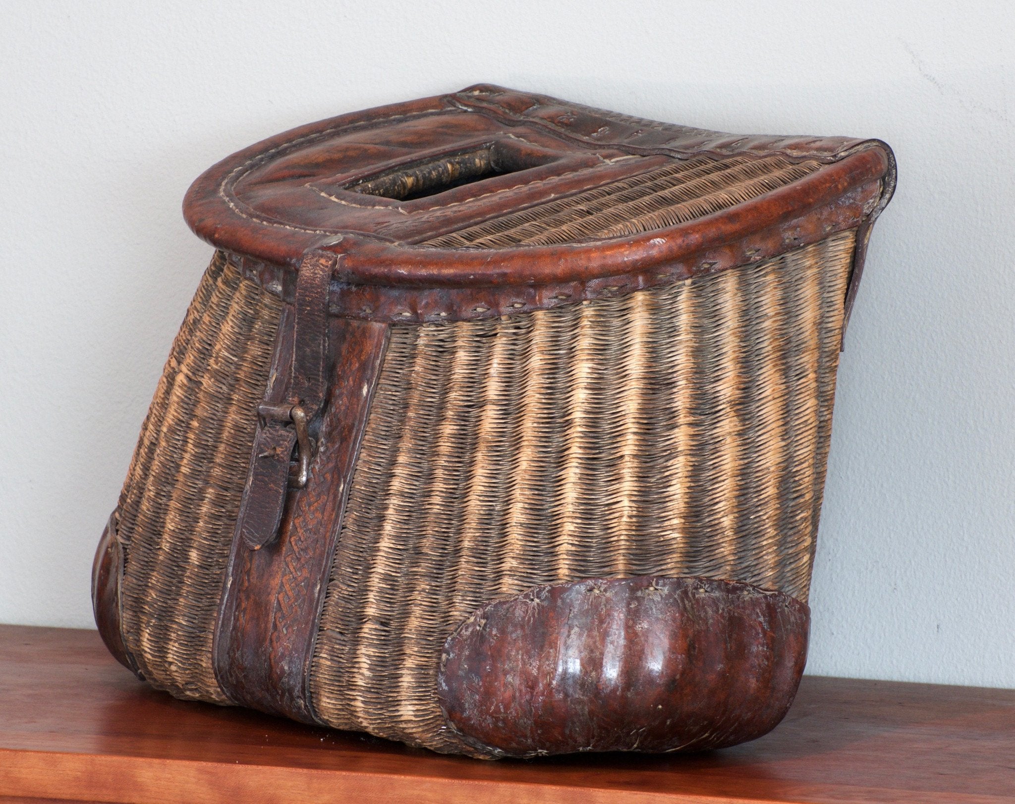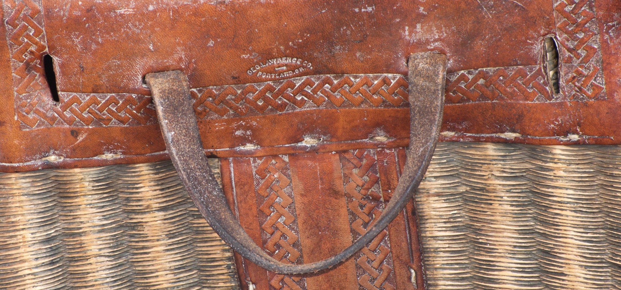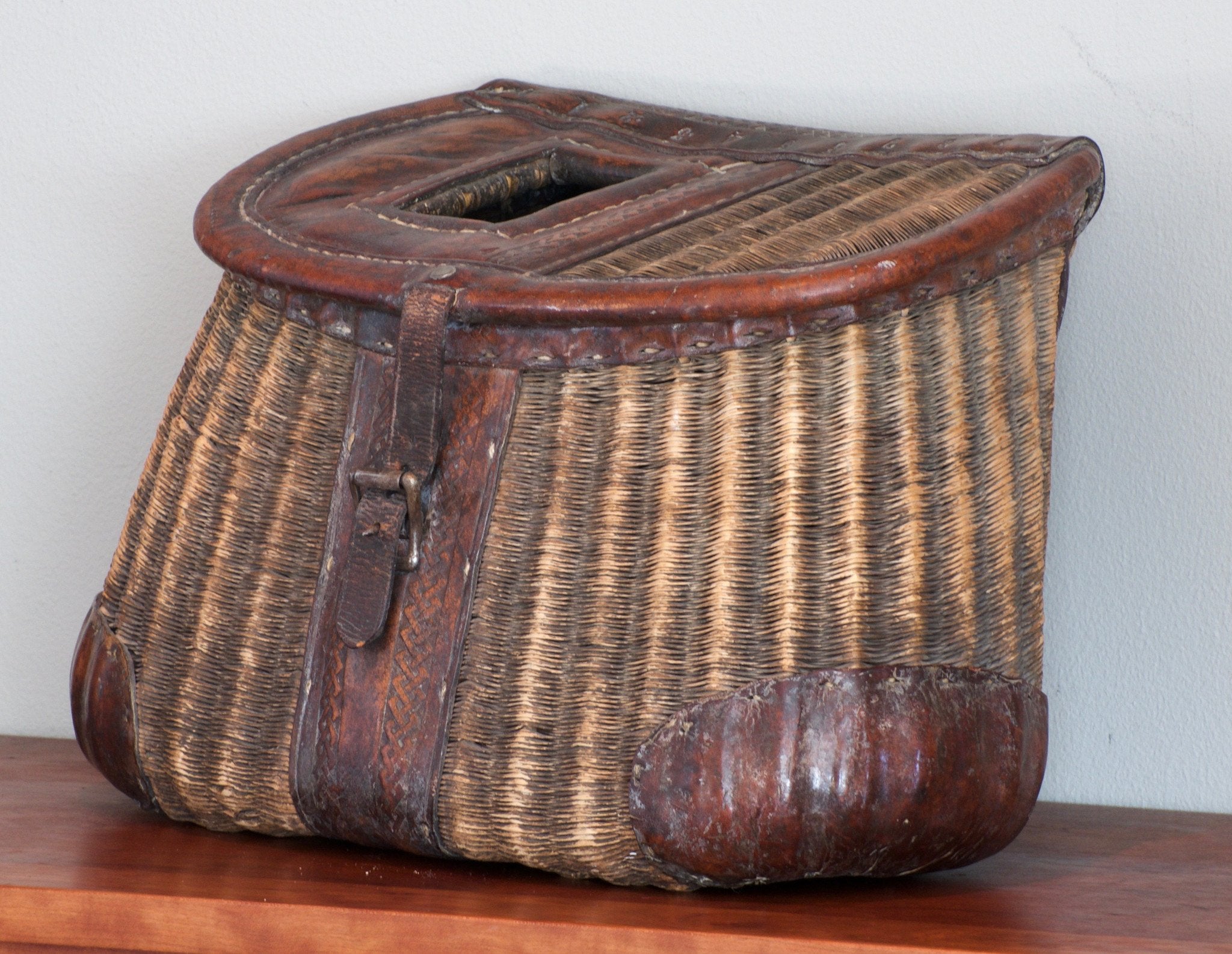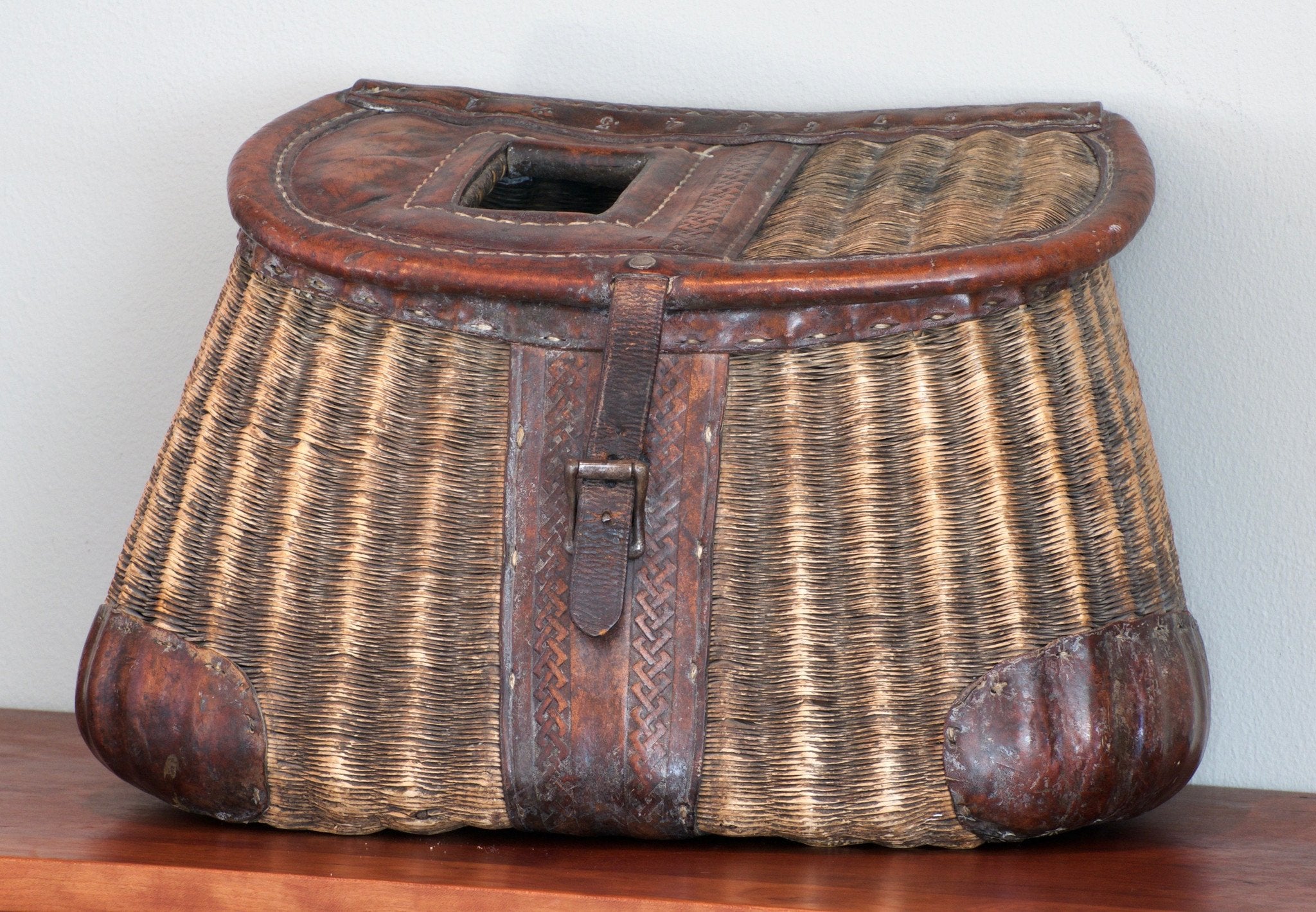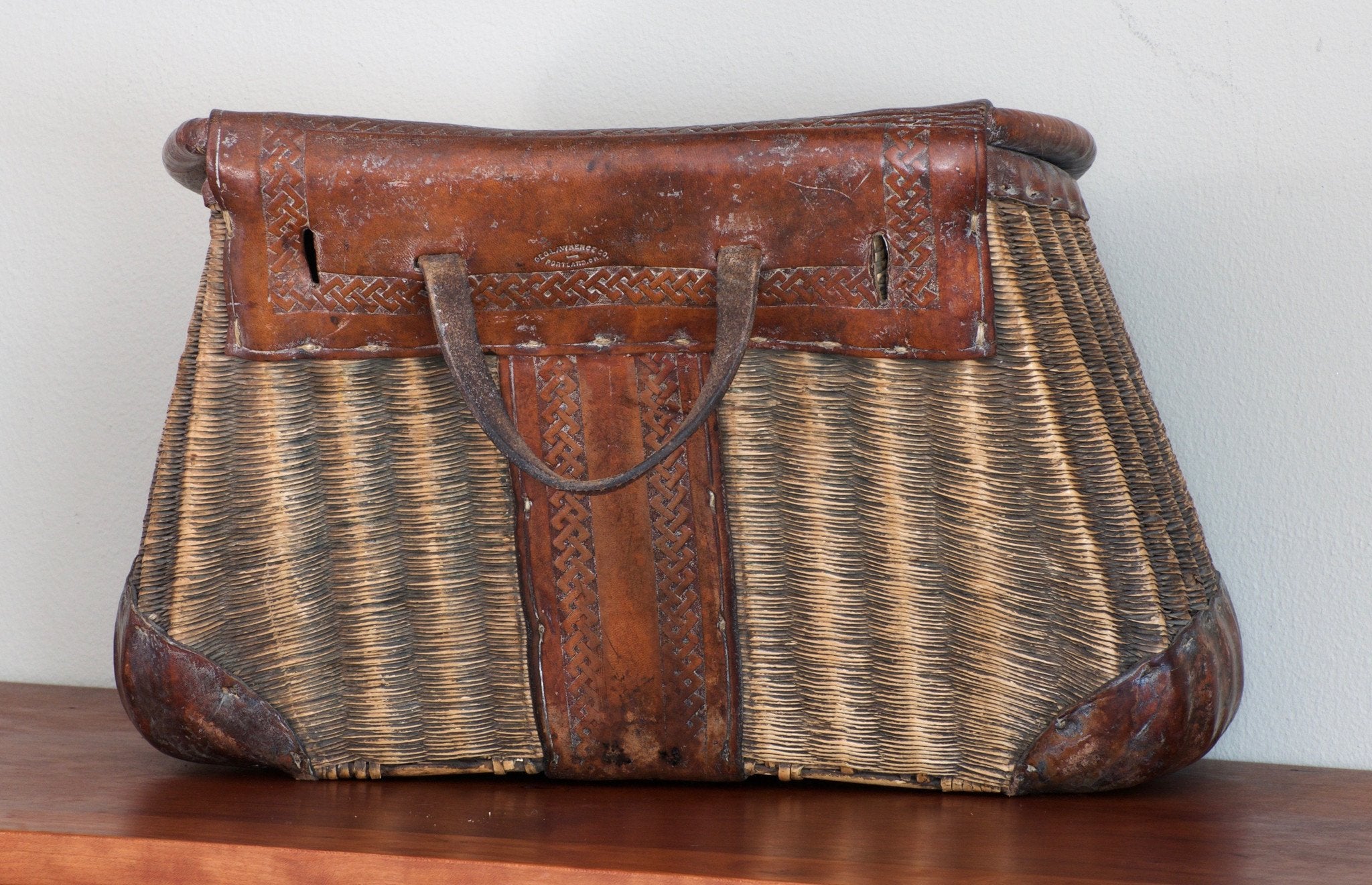 For sale here is a split willow leathered creel by The George Lawrence Company - Portland, Oregon. Model 4. It has a very beautifully and tightly woven split willow body and Supreme embossed leather. Overall the creel is in excellent condition. Outside dimensions: 15"+ in width, 9 1/2" in height, and roughly 7" deep.