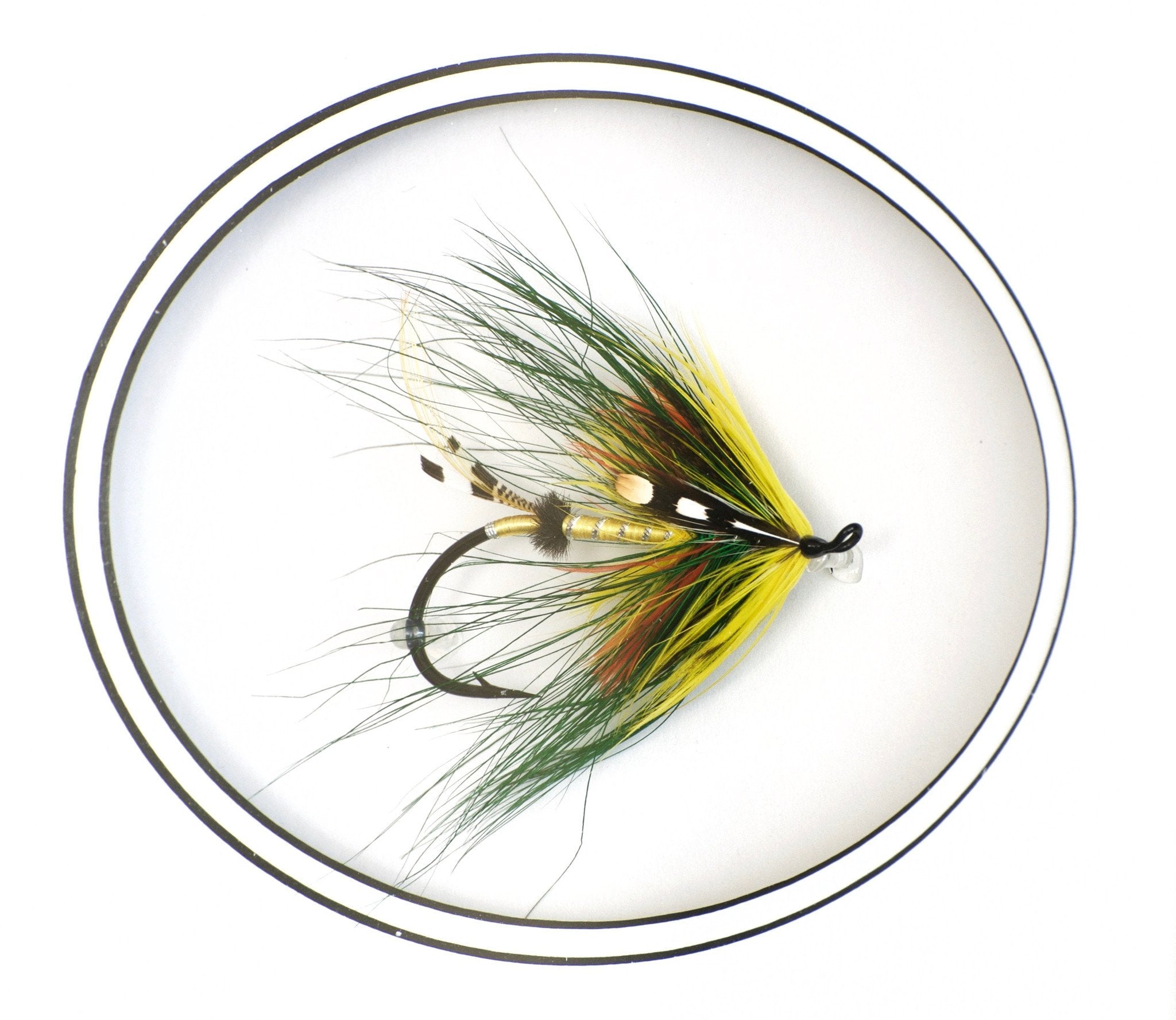 For sale here is a gorgeous Green Highlander spey-style fly tied by Marc LeBlanc of New Brunswick, Canada. A super high-quality job all around. The frame dimensions are 11" wide by 13" tall by 1 3/4" deep.