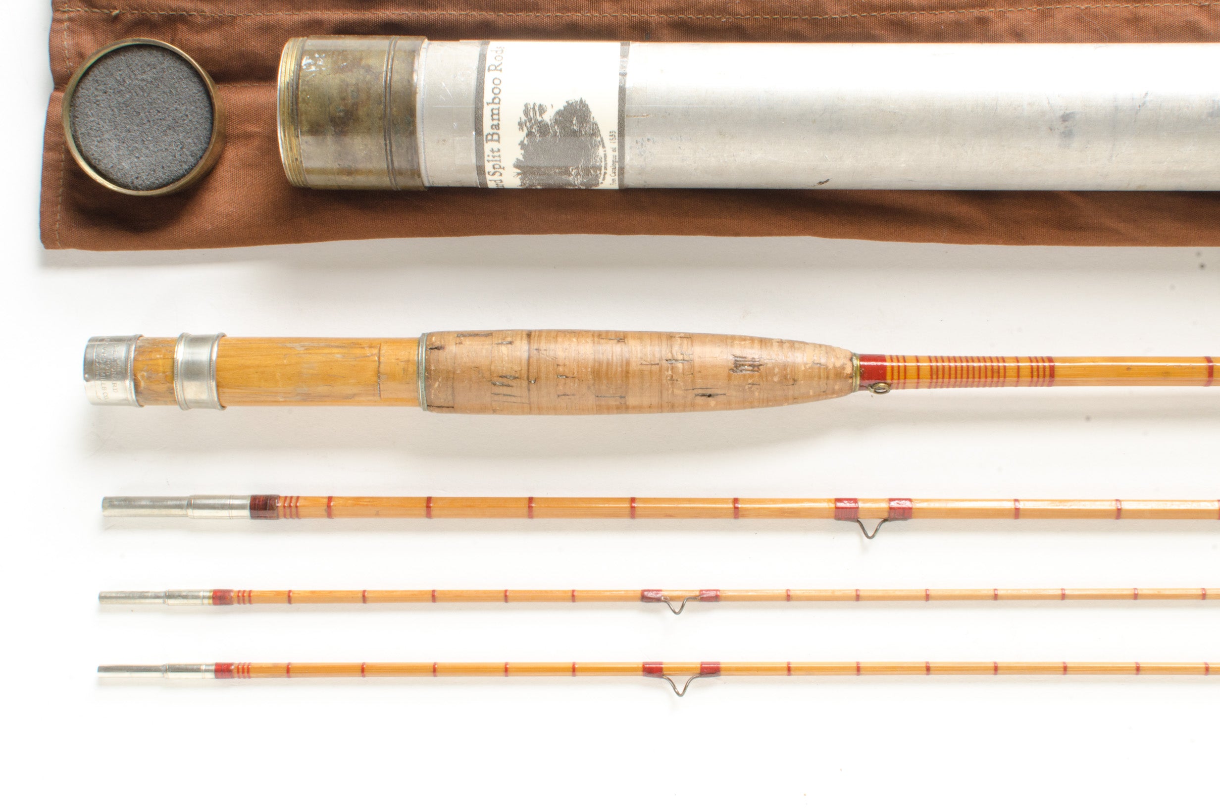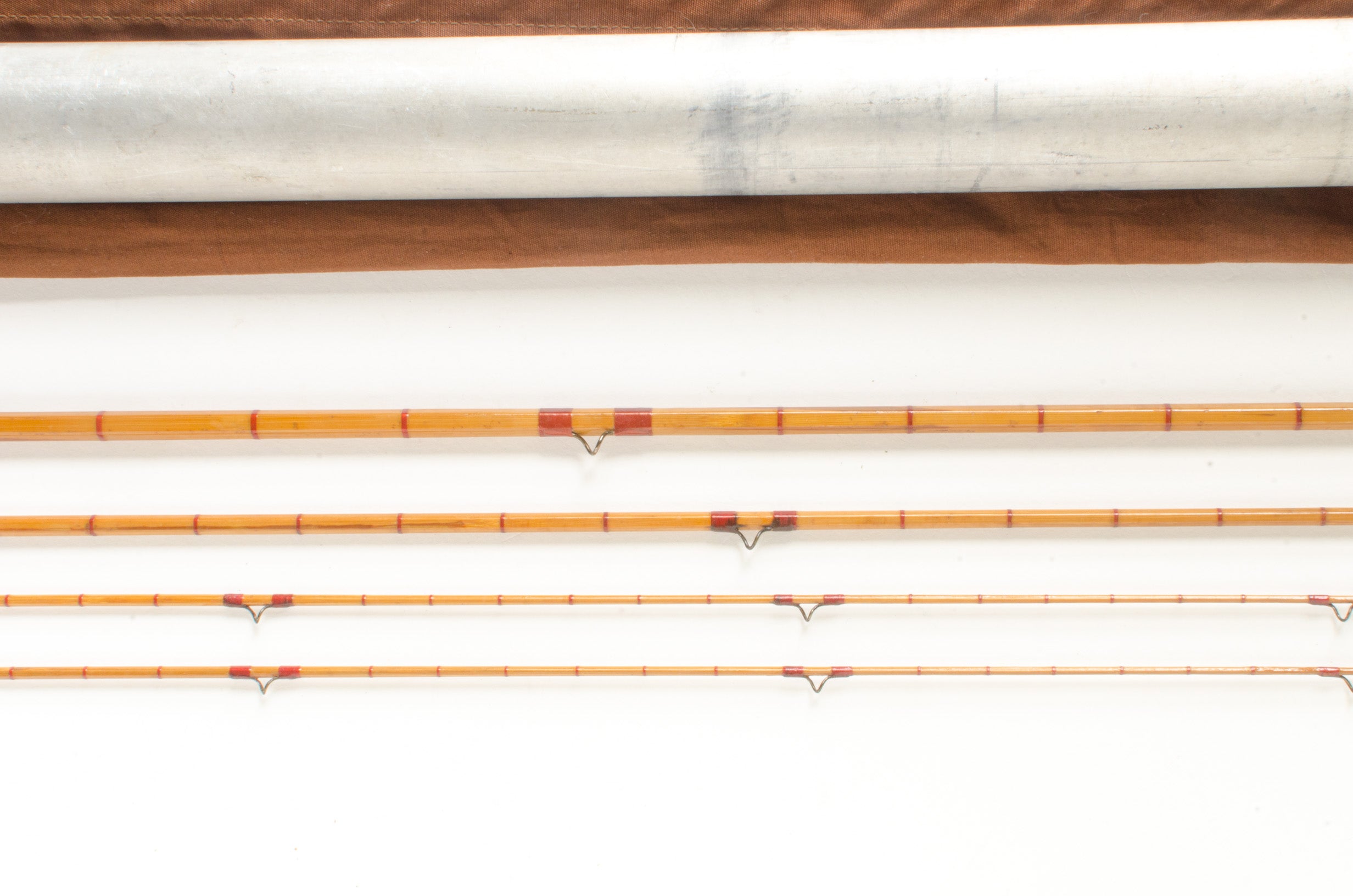 This rod is still very fishable for you silk line aficionados as the small size of the tip tops and upper reverse twist snake guides likely precludes modern plastic lines. How about a #3 silk for tricos? The grip is very short, 4 1/4" in a medium cigar shape. The reel seat is a slide band and cap and the varnished wood is white cedar. The cap is stamped "The, H. L. Leonard, Rod, Leonard and Mills Co, Makers". The rod comes in a dark brown poplin bag with no hang tag, but the aluminum and brass top tube is original. It is very rare to find one of these Catskills in such good condition.