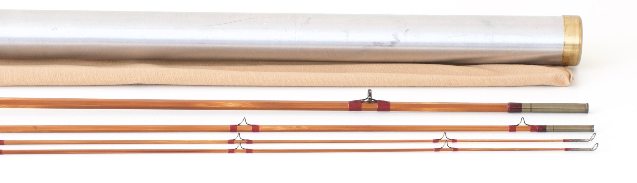 For sale here is a Maxwell era Leonard Hunt Model 49-5 bamboo rod -- 7 1/2 feet, 3/2, for a 5 weight line. Serial number 80142 indicates the rod was made in 1980, Maxwell left Leonard shortly thereafter. The rod is in excellent original condition. It has been fished but was cared for extremely well. All sections are full length and straight. Oxidized nickel silver fittings. Banded amber agate stripping guide. Original rose Gudebrod silks over medium flame tempered cane. Handsome swelled butt. Ring hook-keeper. Cigar grip is slightly soiled. Sculpted nickel silver winding check. Blued nickel-silver cap and ring reel seat with beautifully figured mortised tiger maple spacer.  Ferrules are size 15/64 and 9/64 with an excellent fit. Very smooth medium fast action. Rod includes original bag and original tube with fine brass fittings. Don't miss out on this fine rod from one of the most respected rod makers in recent history.
