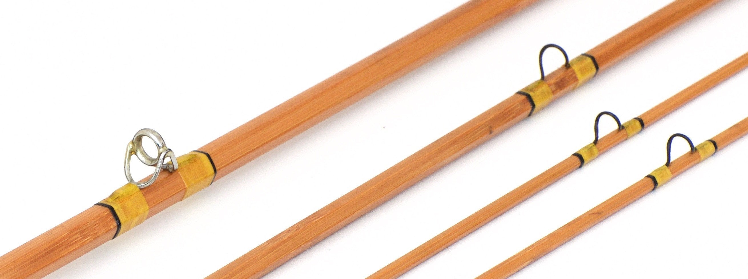 For sale here is an H.L. Leonard pre-fire Model 51 Tournament bamboo rod - 9' 3/2 6wt with a listed and actual weight of 5 3/8 oz. The rod is in excellent refinished condition. All sections are full length and straight. The rod features a straw colored, blonde blank with yellow wraps and black tipping. The winding check and male ferrules also feature black and gray jasper tipping on top of the black. Oxidized guides with the exception of the stripping guide. Handsome swelled butt. Ring hook-keeper. Classic cigar grip 5 7/8" in length. the grip is moderately soiled but free of ridging or other defects. Bright aluminum down-locking reel seat with a butternut spacer. The seat shows light wear to the locking ring. The bright nickel silver ferrules are size 11/64 and 17/64 with an excellent fit. Includes aluminum/cork ferrule plug for the butt section (made by a prior owner). The action is on the medium side of medium-fast with plenty of power the butt. Includes original bag with hang-tag intact and original tube.