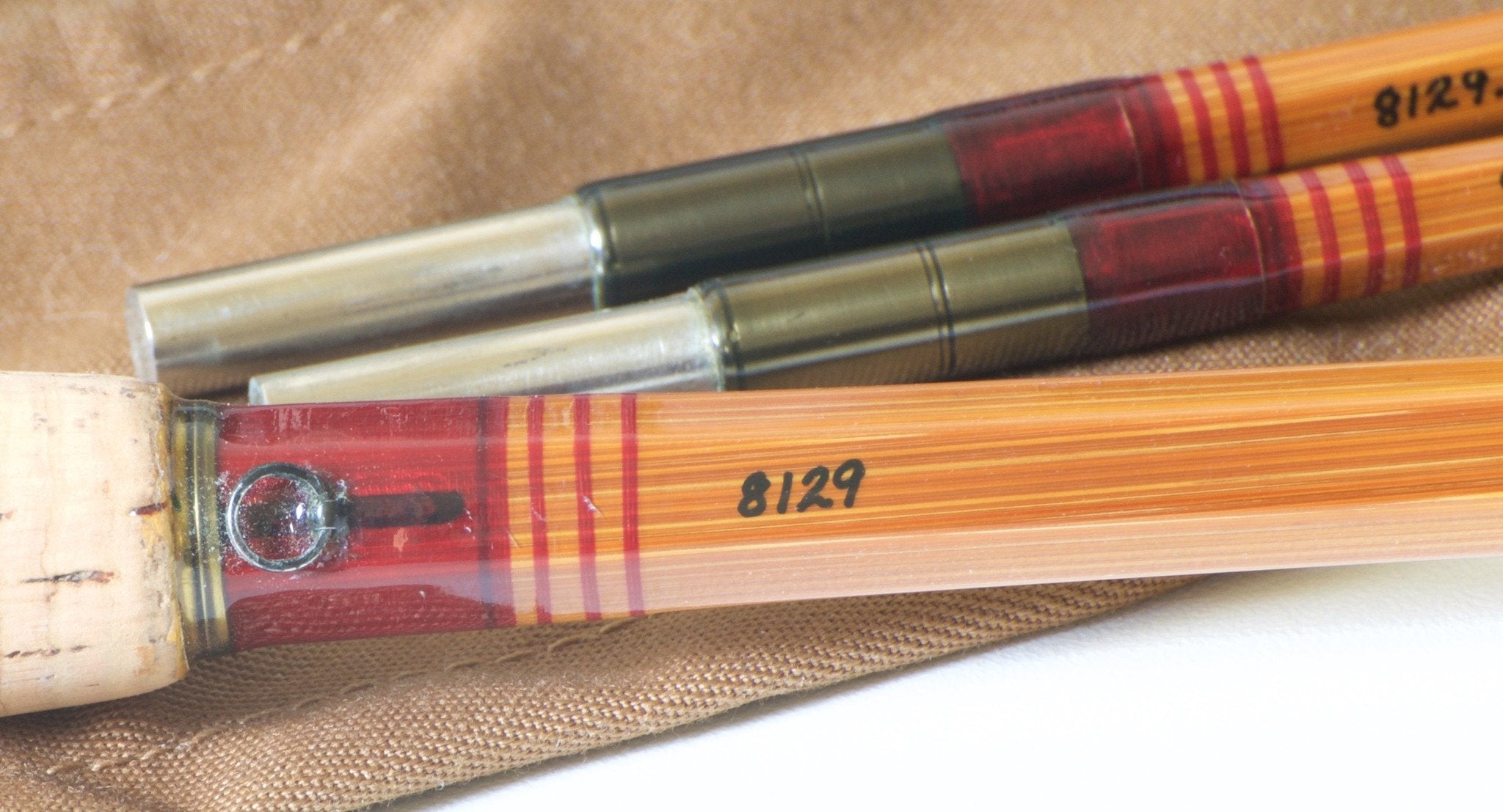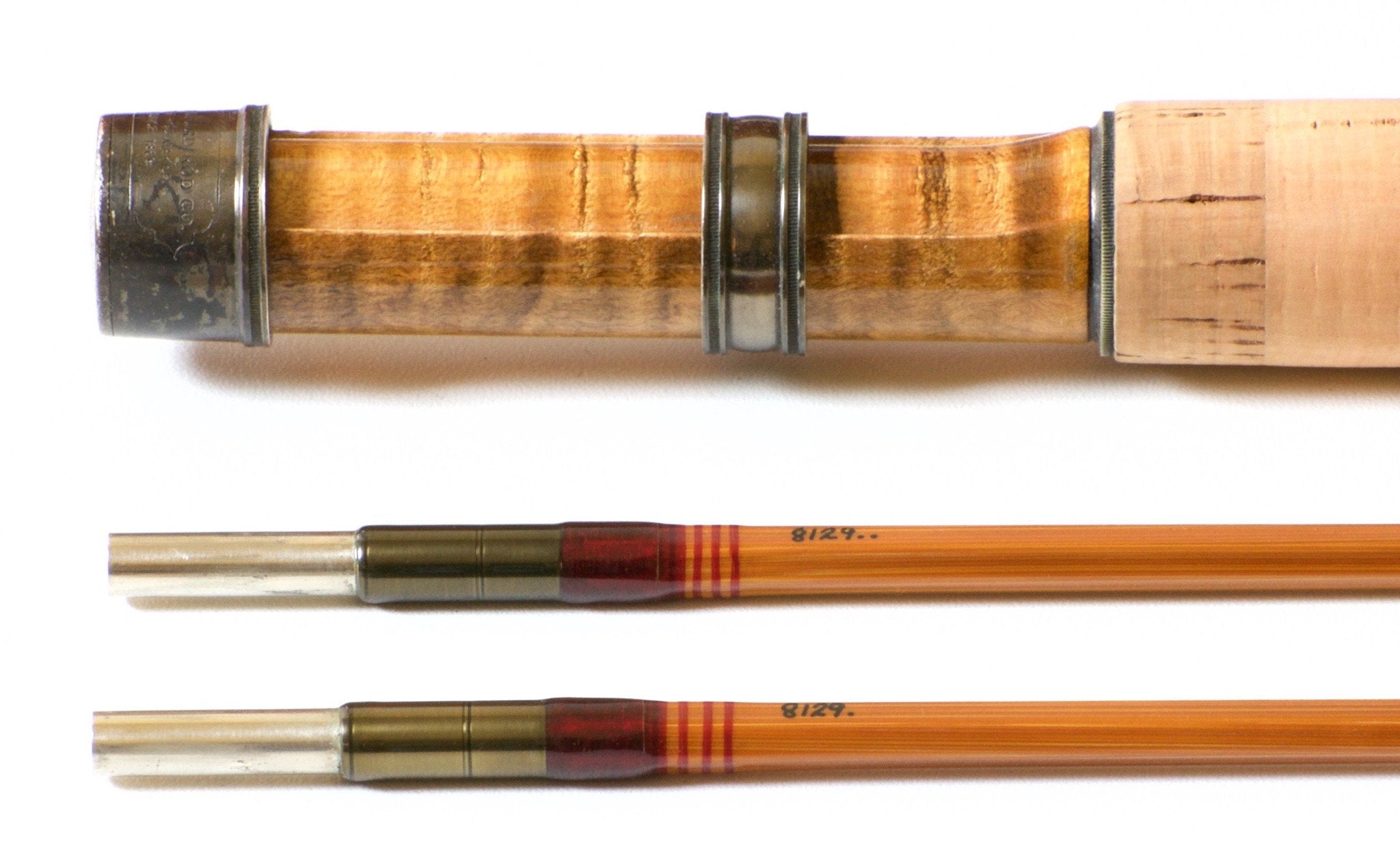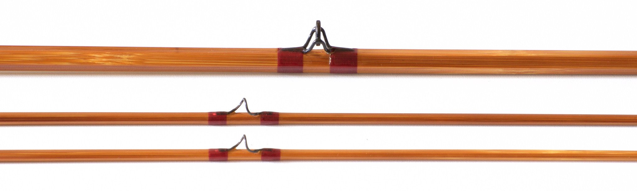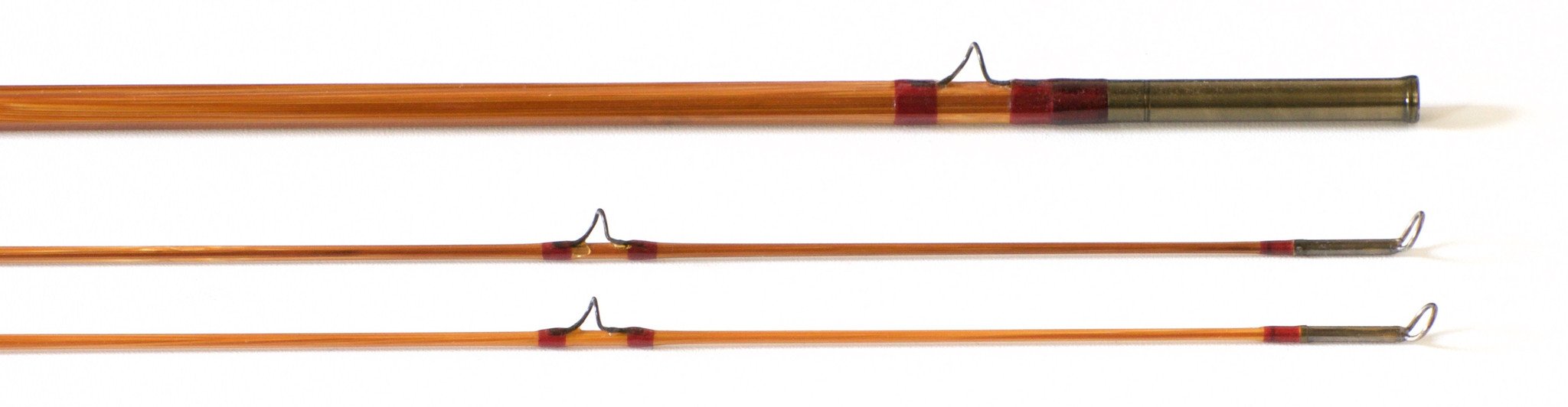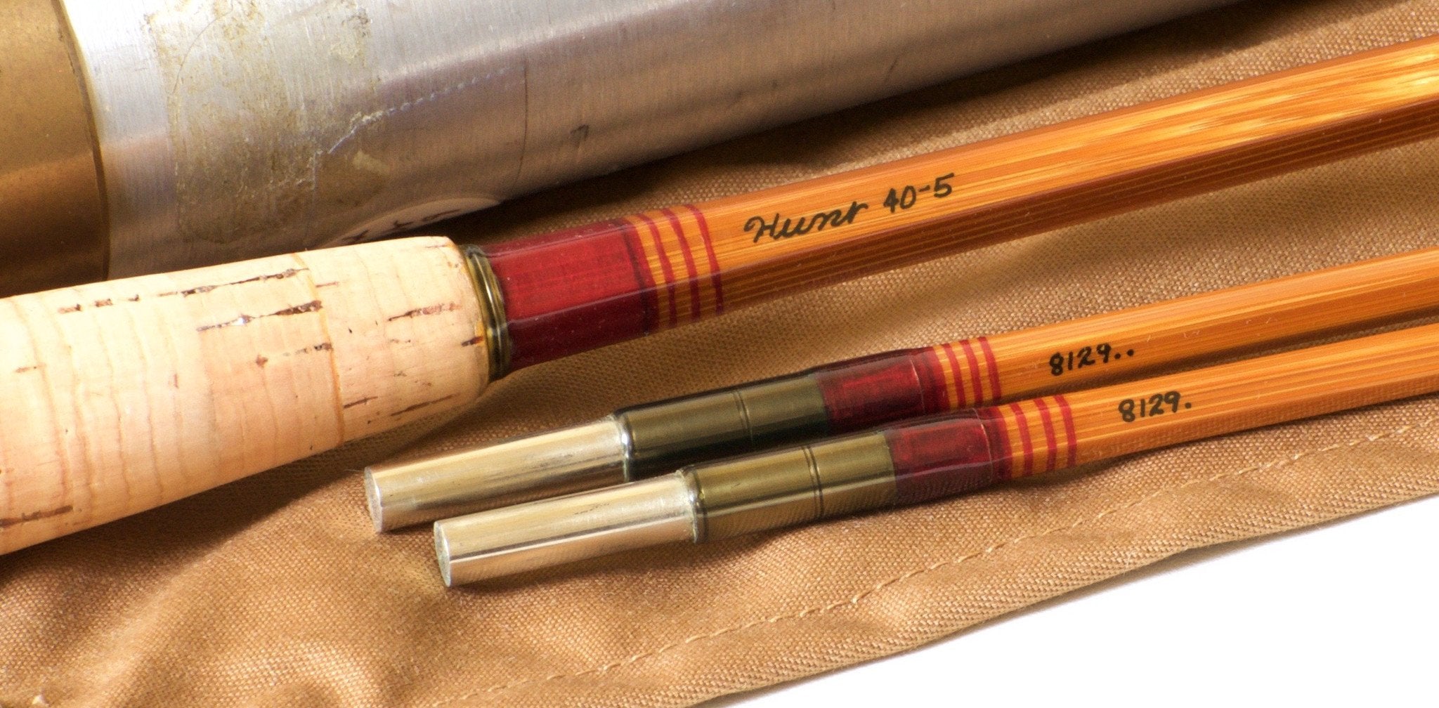 For sale here is an original and near mint condition H.L. Leonard Hunt Model 40-5 bamboo rod -- 8 feet 2/2 5wt. On the medium side of medium fast action. Weighs 4 1/4 oz. This rod comes from the end of Tom Maxwell's tenure at the Leonard Rod Co. All sections are full length and straight. Beautiful classic post-fire Leonard model with red wraps. Flawless varnish. Mildrum stripping guide. Blued german silver cap and ring reel seat and blued guides, ferrules, and tip tops. The size 14/64 ferrule fit is excellent. Includes original tan bag with stiffener and original aluminum tube with Hunt Model brass fittings.