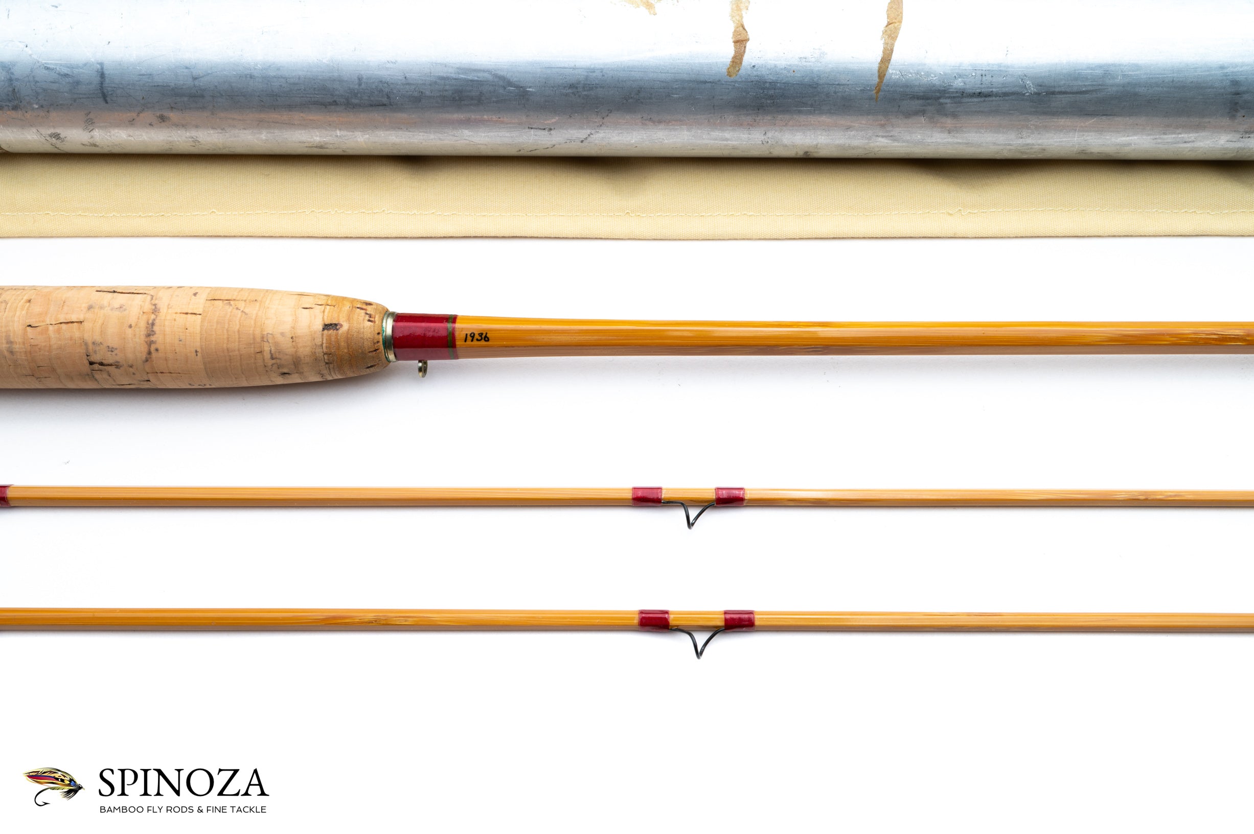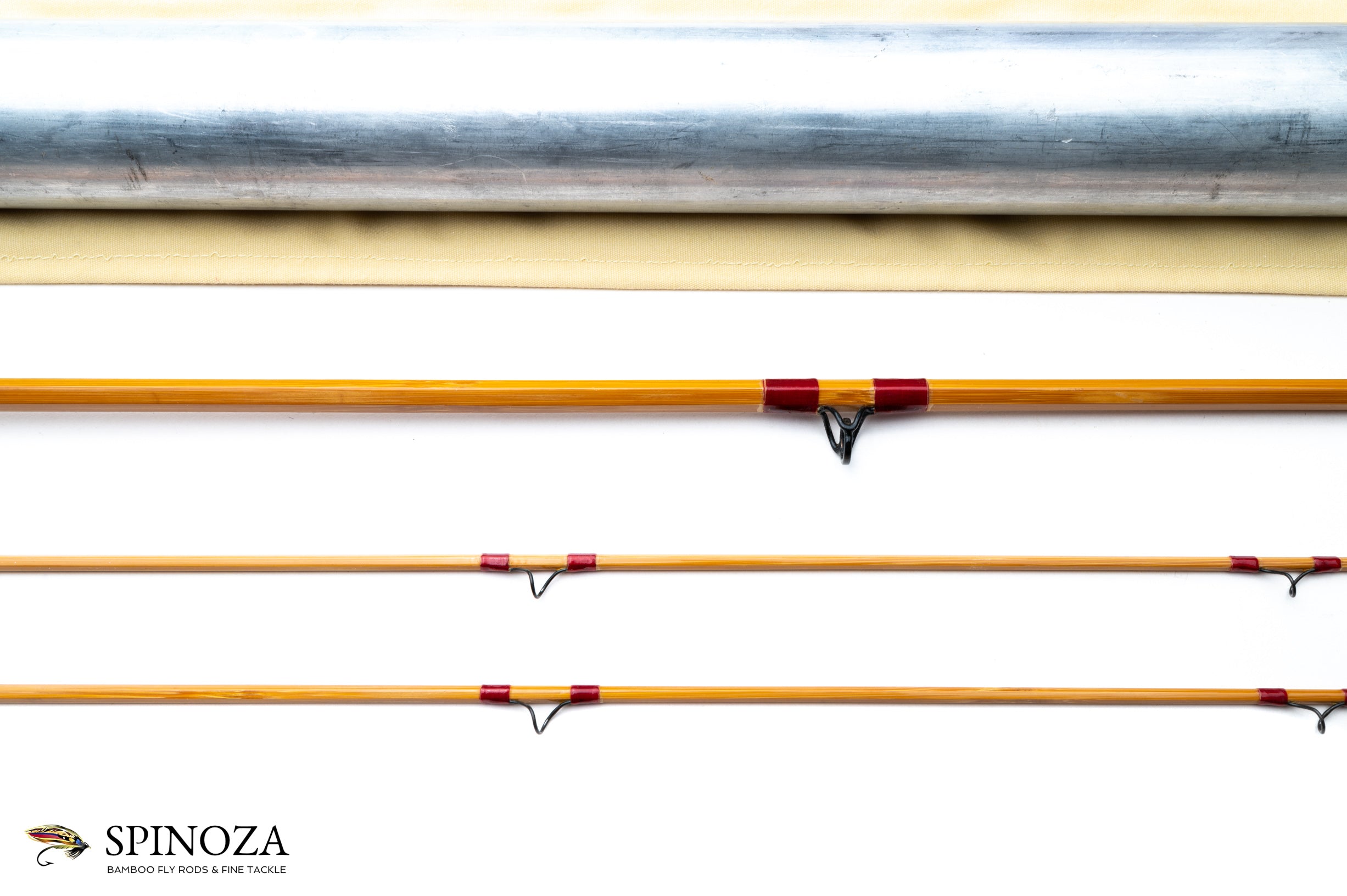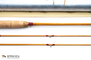 An HL Leonard model 39-5 bamboo fly rod, 7'6", 2-piece, 2-tip, and built for a #5 line. Serial #1936 with a manufacture date of 1974. 3.8 ounces. Excellent used condition with some modest cosmetic cracking at the ferrule wraps and wear to the inner snake guides. Medium action with what feels to me like a faster butt and more moderate tips. Blonde oven temper cane done in a three up node pattern. The wraps are 326 red with additional edges of green and maroon at the keeper and male ferrules. The step ferrules are polished and the fit is tight. The cork grip is 5 1/2" long and shaped to a medium-to-blunt cigar profile. The reel seat is a square thread aluminum downlock with a butternut spacer and a nickel silver pocket cap stamped "The HL Leonard Rod Co, Makers". The bag is yellow poplin with a stiffener sewn by Bob Taylor's mom. The aluminum tube has brass fittings and the data sticker 95% intact.