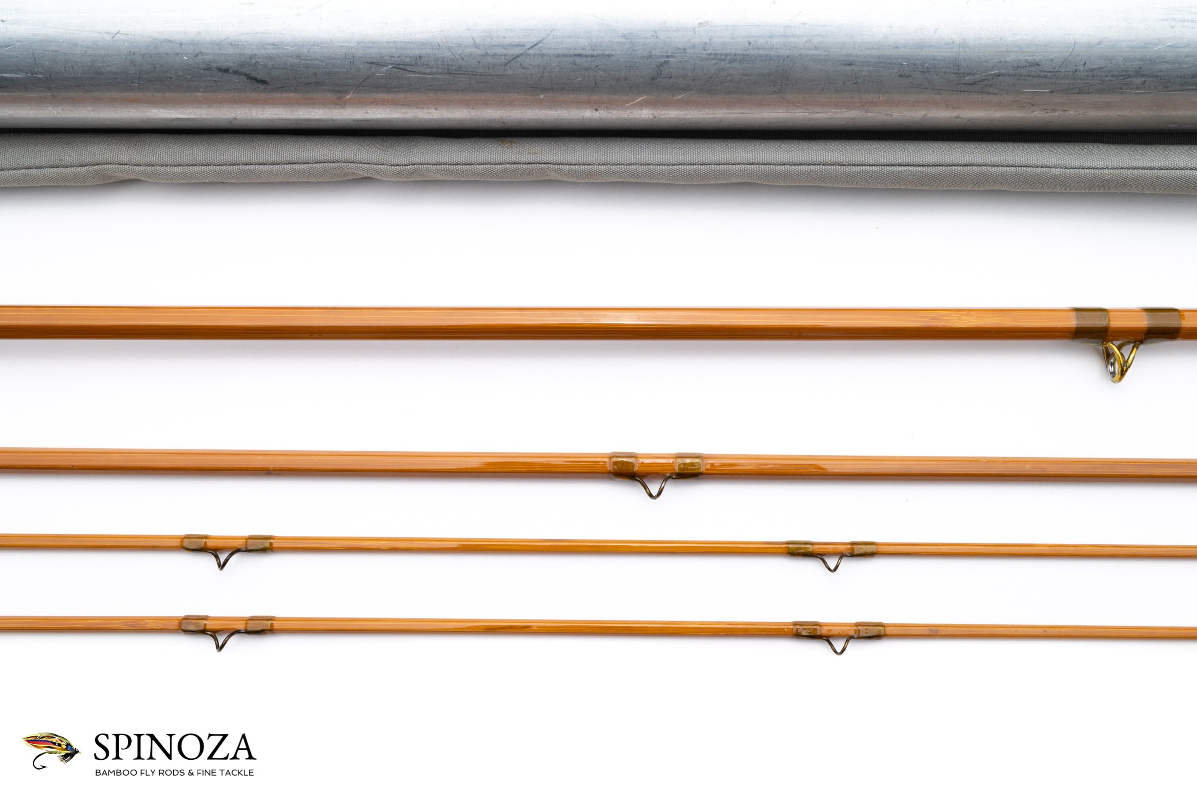A nice Leonard Tournament Model 50 1/2 bamboo fly rod, 8'6", 3-piece, 2-tips, and built for a #5 line. Light wheatstraw cane done in a three up node pattern construction. Medium full flexing action. Refinished condition. 4.7 ounces. The rod appears to have been very lightly used after the refinish. Re-wound in olive silk with a band of red and black at the keeper and male ferrules. The patent date has been buffed out on the female ferrule. Small stripping guide and small heavy wire reverse twist snake guides. The grip is original and styled to a 5" long medium cigar. The hook keeper is one flat right. The reel seat is a square thread downlocking screw lock with a nickel silver pocket cap and a butternut insert. The die stamp in the cartouche reads "The Leonard Rod, HL Leonard Rod Co, Makers" and under the cartouche "Reg US Pat Off". "Tournament" is stamped on the pocket. Original bag with the preserved hang tag. Original rod tube with a brass collar and top.