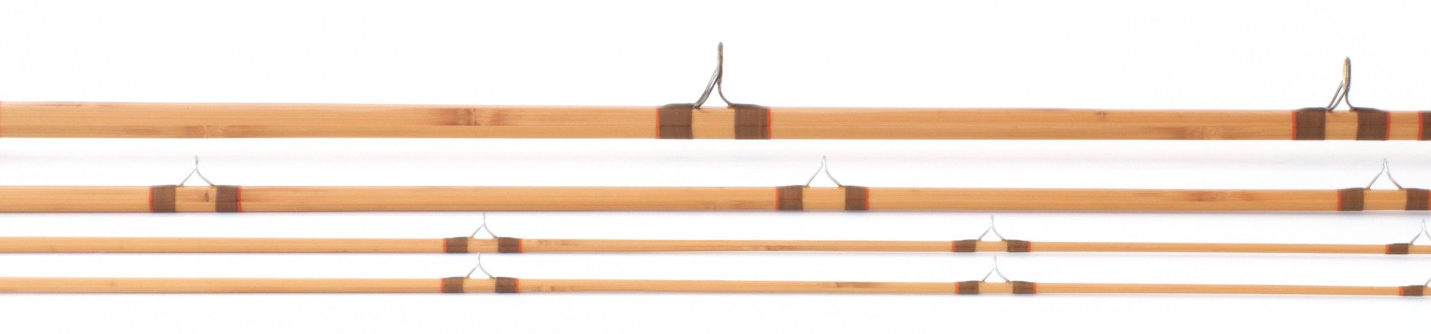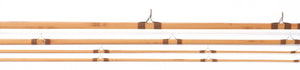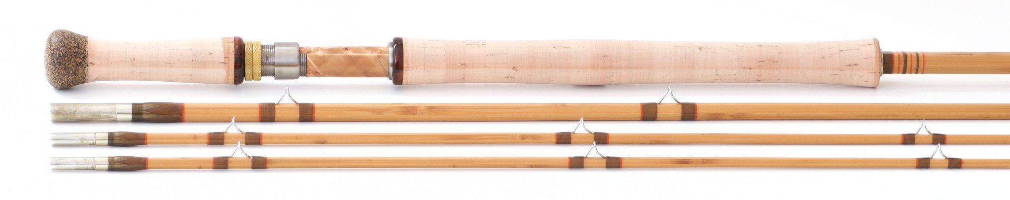 For sale here is a beautiful 11' 8wt two-hander from LH Design.Leen Huisman from The Netherlands has been making fly rods and reels for over 30 years. His designs and exquisite craftsmanship are very well-respected worldwide, and by reviewing the photos of this rod, you will see why. The rod is in mint condition. Plastic shrinkwrap remains on the grip and fighting butt. The rod features blonde cane with chestnut brown wraps and salmon colored tipping. There is an alternating banding pattern at the winding check. Bright guides. Bronze colored Swiss-style ferrules size 24/64 and 16/64. The fit is perfect. Includes with the rod are stunning burlwood/cork ferrule plugs. Sculpted nickel silver winding check. The grip is 11 1/2" in length in a full wells shape. At the bottom of the grip and the top of the fighting butt is a handsome walnut band. Aluminum up-locking reel seat with a highly figured mortised burlwood spacer. Rounded composite cork butt cap. The rod weighs 14 oz. Includes original bag with maker's label and fine leather tube with brass accents. This rod is ready and waiting to swing some flies.