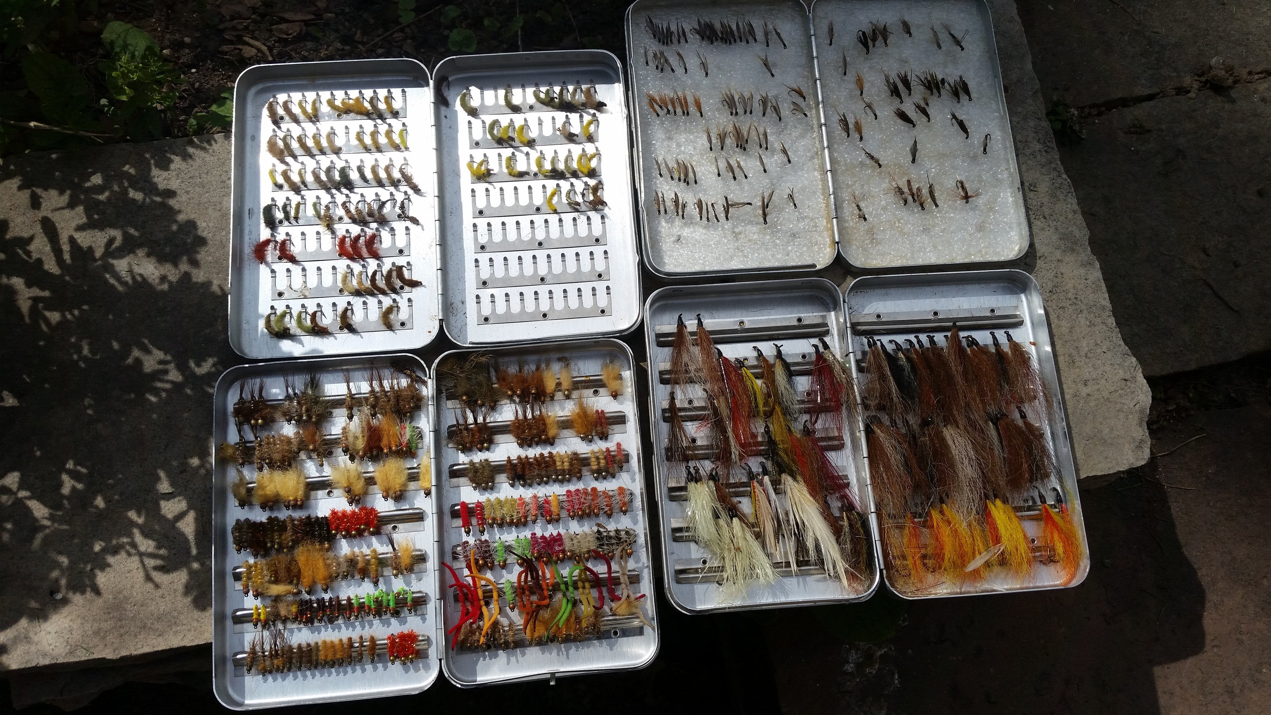 For sale here is a lot of 3 Perrine #96 fly boxes and 1 #90 filled with approximately +/-250 dries, streamers, and nymphs. The flies and boxes are all in excellent condition though the boxes do show normal fishing wear. The boxes measures 6" x 3 1/4" x 1" - the #90 is 3/4" deep. As stated above the boxes consist of dries, streamers, and nymphs ranging in size from #2-#16. The flies include but are not limited to - bead head nymphs, caddis nymphs, caddis adults, clousers, worms, and several more. Don't miss out on this cache of flies and vintage fly boxes at a great price.
