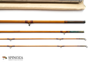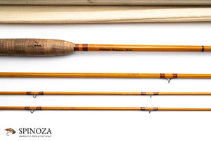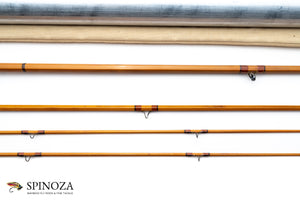 A Lyle Dickerson / Ray Bergman 861711 bamboo fly rod, 8'6", 3-piece, 2-tip, and built for what feels to me like a #5 or #6. The rod weighs 4.9 ounces on my scale. Fair to good condition. Fast action. Good because the inner snake guides show modest wear. Fair because the varnish has issues with chips and bag adhesion, especially in the upper tips, which has been compounded by a rod bag with an internal fuzzy nap to it, some of which still clings to the varnish. The ferrule wrap on the mid female and one tip top look to have been replaced. The rod sections are in good condition with no hook digs and are full length. Except for the aforementioned wraps the rest appears original as does the lettering. A bit of professional attention could put this rod back in tip top shape. The ferrule fits are still good and the step ferrules are oxidized with various degrees of preservation. The grip is 5 3/4" long and shaped to a bluntish cigar. The reel seat is the typical downlocking aluminum screwlock with a nickel silver pocket cap and wood spacer. I would swap in a different bag than the aforementioned one. The rod packs into an aluminum tube with brass fittings.