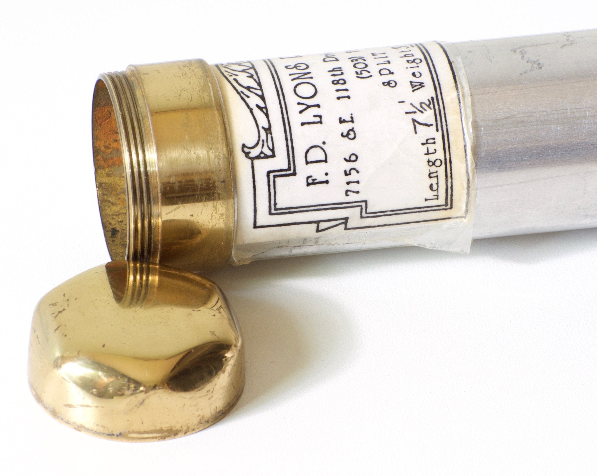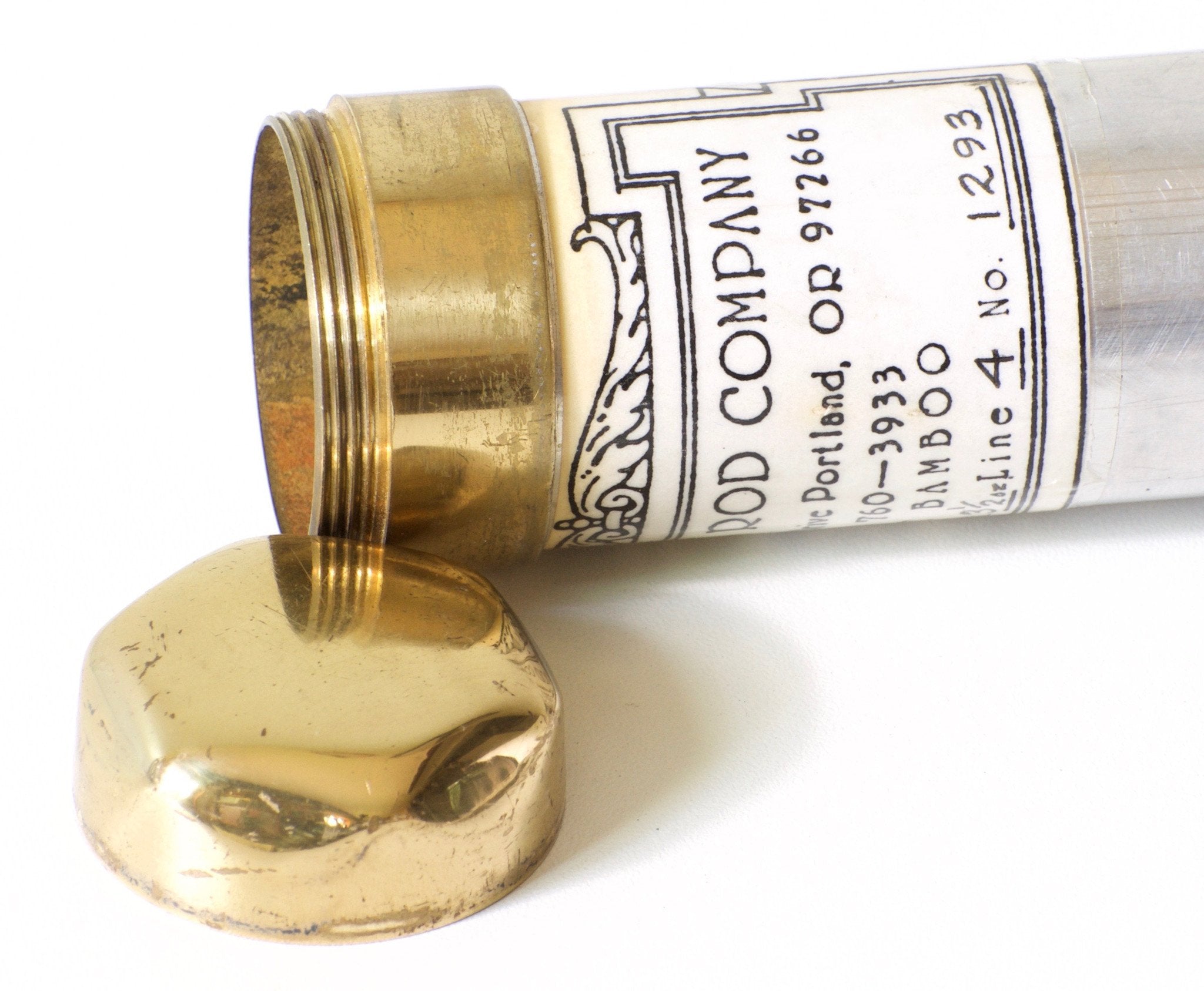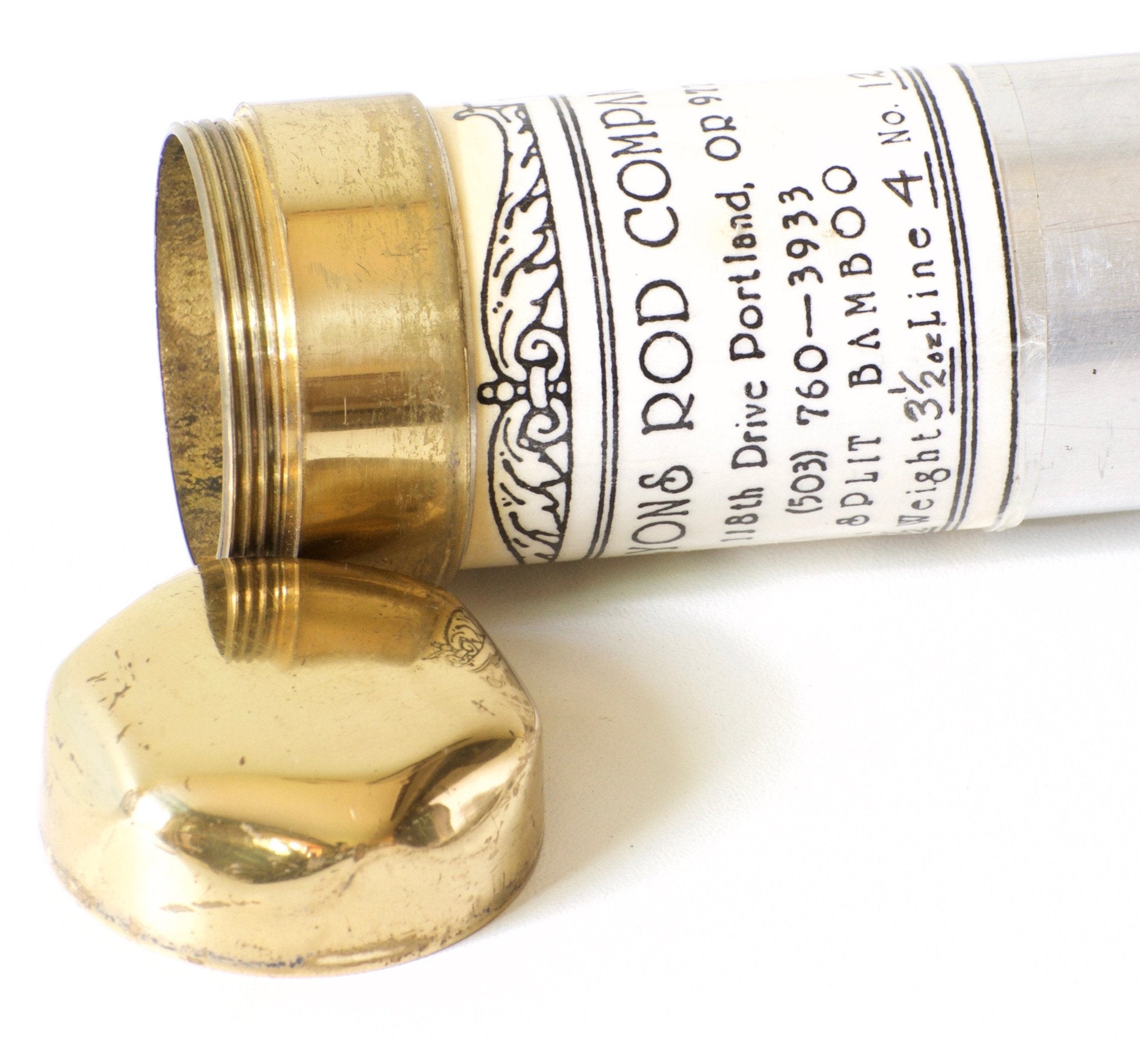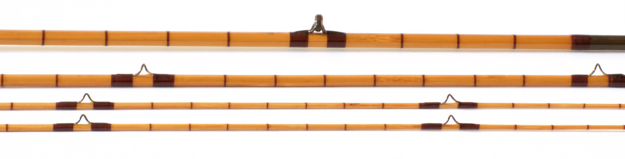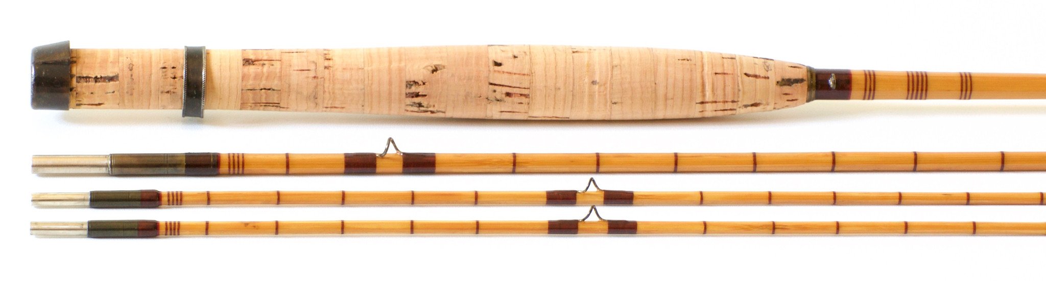 Three-piece with two tips. Serial no. 1293. The rod is in excellent+ condition. Blonde, straw colored cane with deep rust colored silks and full intermediates. Ring hook keeper, oxidized hardware, agate stripping guide and vintage reverse twist English style guides. Slightly swelled butt. Cigar grip, cap and ring reel seat over a cork spacer. Ring features fine knurling at the edges. Ferrule sizes 9/64 and 13/64, nice fit. The rod has a medium action to go along with its aesthetics, keeping true with a rod from the early 20th century. The rod weighs 3 1/8 oz. Included are original bag and tube with label and unique hexagonal brass fittings.