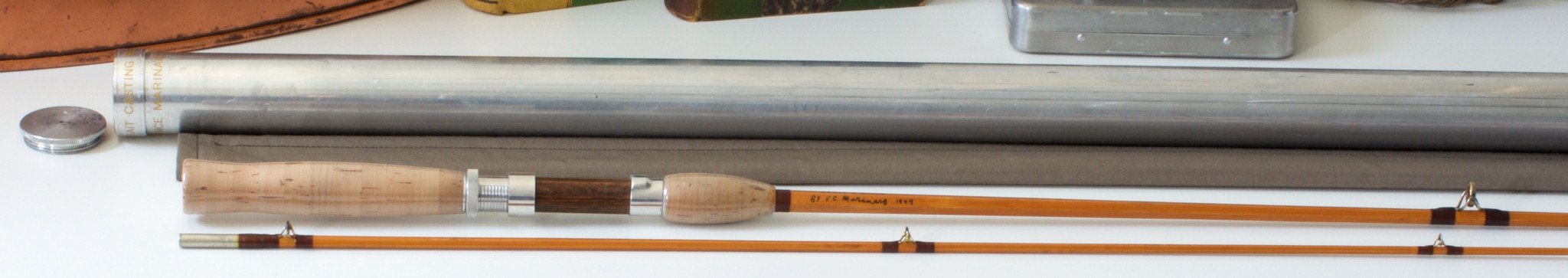 For sale here is a Vincent Marinaro bait casting bamboo rod. 6 1/2 feet long, one tip. Weighs 5.1 oz. Stamped Super-Z ferrules are size 15/64. Near mint original condition with plastic on the grip. The tip has a casting set in it. The blanks were made by Marinaro but the rod was finished by someone else. Comes with an appropriately fitting rod bag and tube.