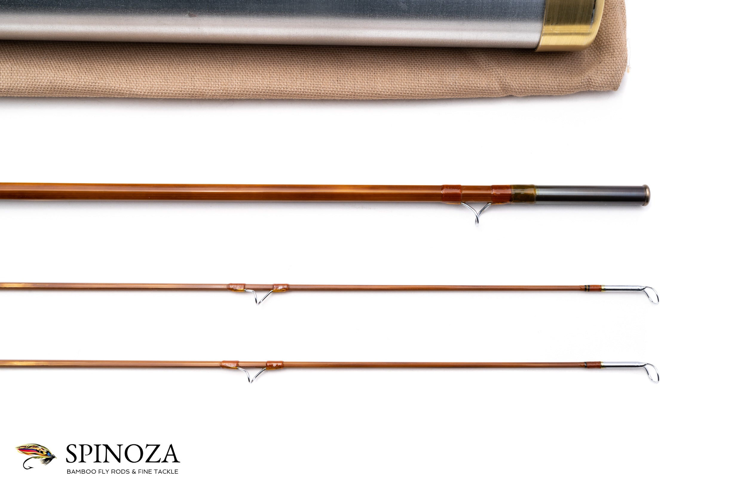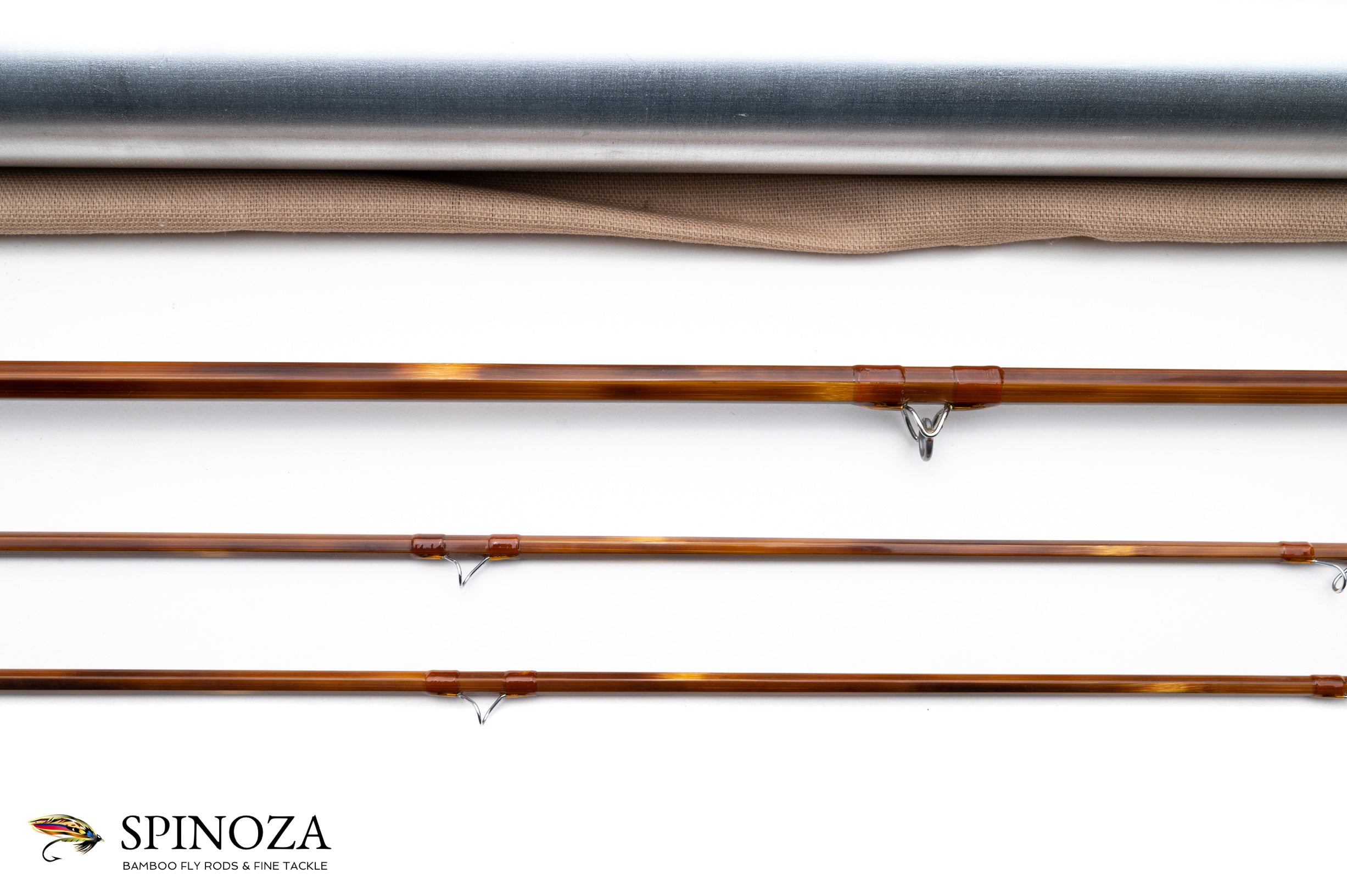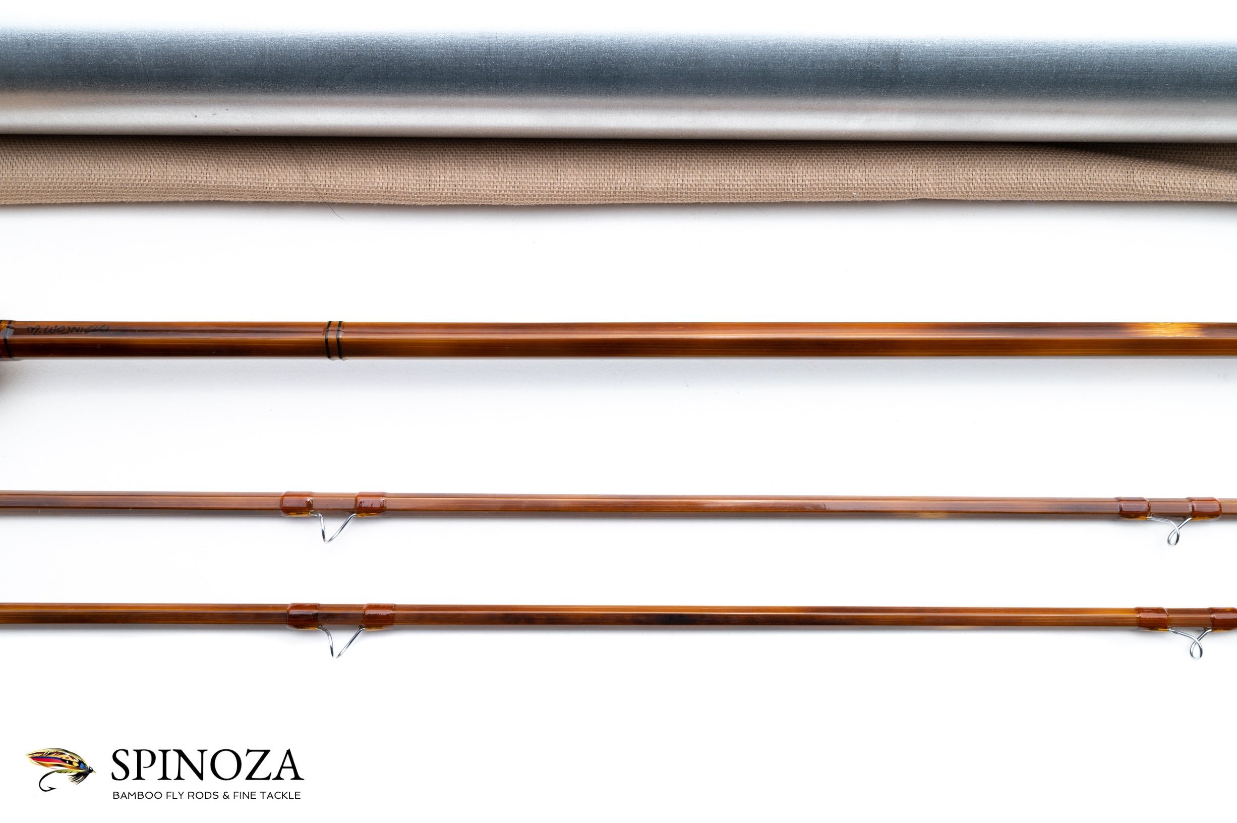 A Mario Wojnicki Model 251F4 fly rod, 8'3" (251 cm to be precise), 2-piece, 2-tips, built for a #4 line. "M. Wojnicki" inked on the butt section as well as "251F4 #8216". Pleasing medium fast full flexing action. The rod is straight and the ferrule fits are good. Mint condition. Mottled light and dark flamed cane and the rod is done in a two-opposed node construction. Nice varnish throughout. Very light apricot almost translucent colored wraps with black tipping at the grip, signature wrap, male ferrules, and tip-tops. The serial number is inked just above the males on the tips. Slightly truncated and oxidized ferrules. 6 1/2" long powell style grip with a large flare at the top. Dual slide band reel seat over a varnished matte wood spacer with a cork and composite button on the very bottom of the rod. Comes packed in a light tan bag and an aluminum tube with gold-anodized fittings with "251F" stamped into the top and "M Wojnicki, Maker" on the tube itself.