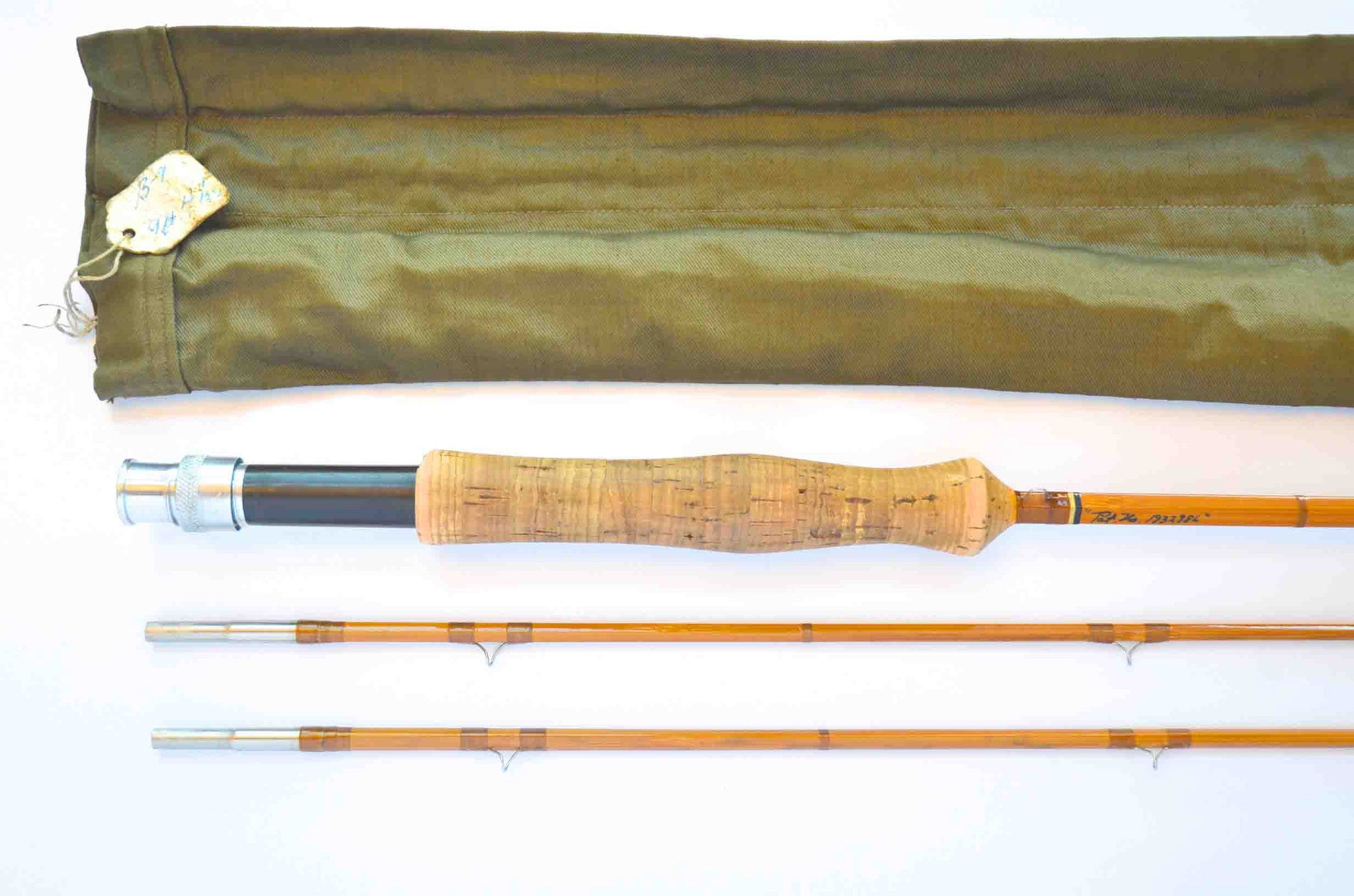 A powerful 9' 2/2 for a #5/6 hollow-built Powell made by Tony Maslan. This rod has an uplocking screwlock over a black plastic (delrin?) spacer. Half wells grip. The rod is marked "pat# 1932986, E.C.Powell Rod co., Marysville, Calif". The wraps are gold with high arch chrome guides. Two opposed node pattern. The original varnish is in excellent condition. There is some minor soiling and erosion of the grip near the hood (pictured). Medium to slow action. Comes with a bag and aluminum tube.