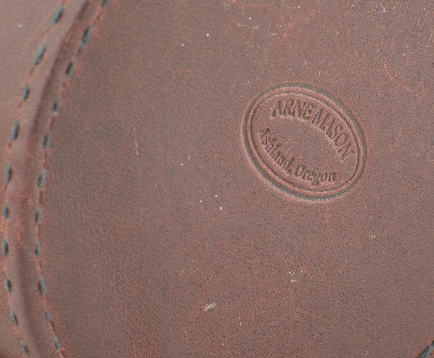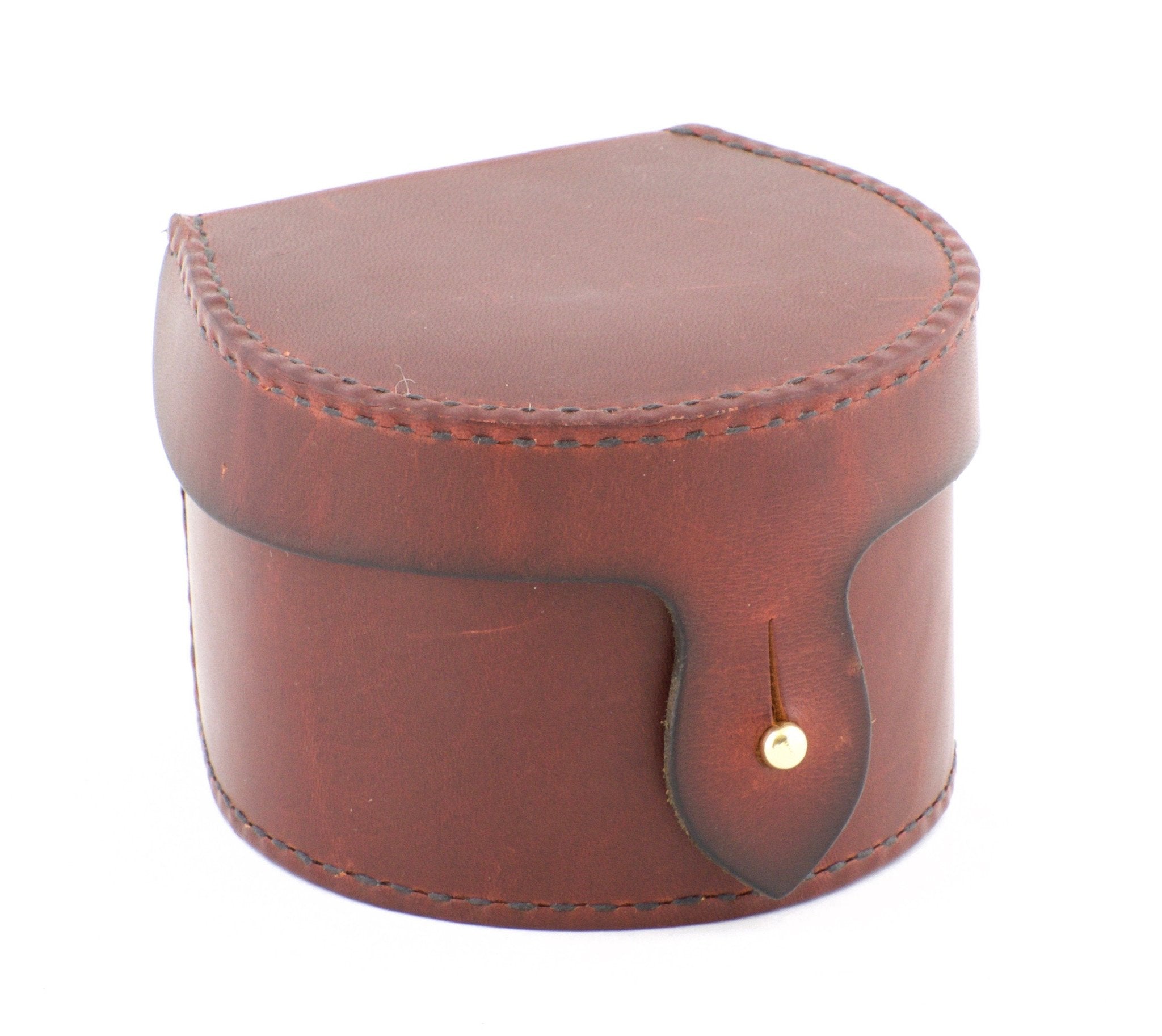 For sale here is an Arne Mason leather reel case made to fit small sized reels. The case fits reels up to 2 7/8" dia. x 2 1/2" width (measure width from the widest point on the backplate to the end of the handle knob on the faceplate). Full 10 oz. leather thickness and genuine sheepskin fleece lining with traditional solid brass stud and slot closure.