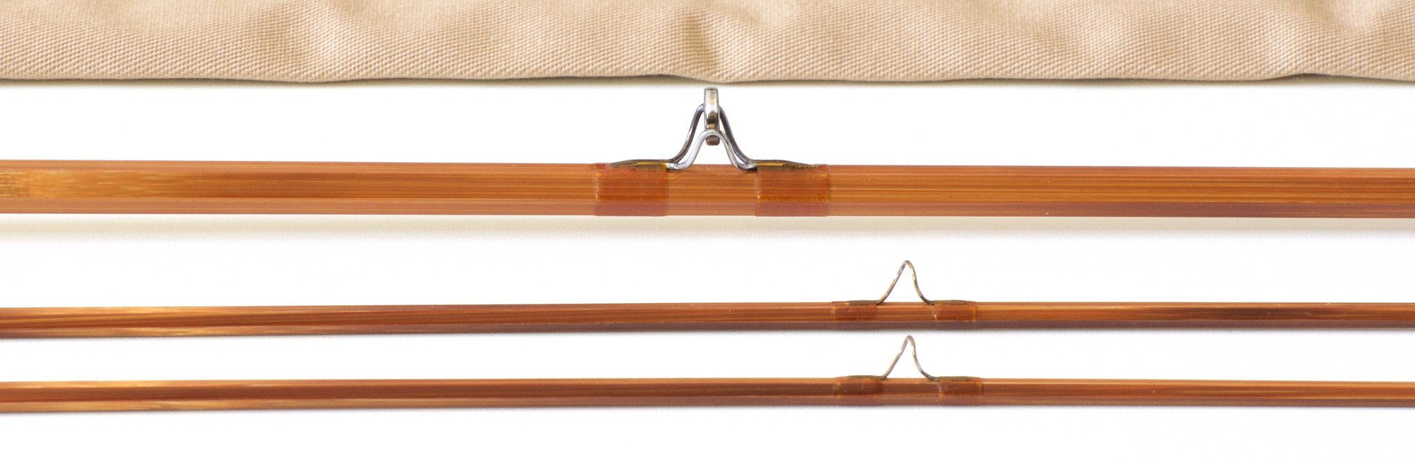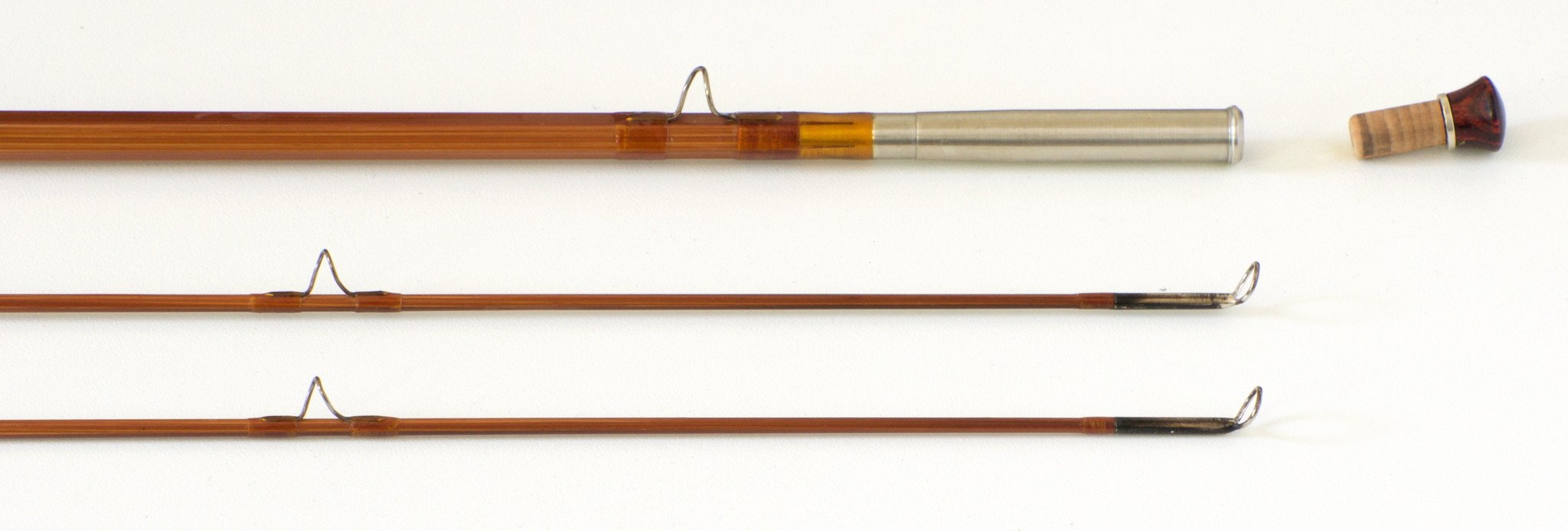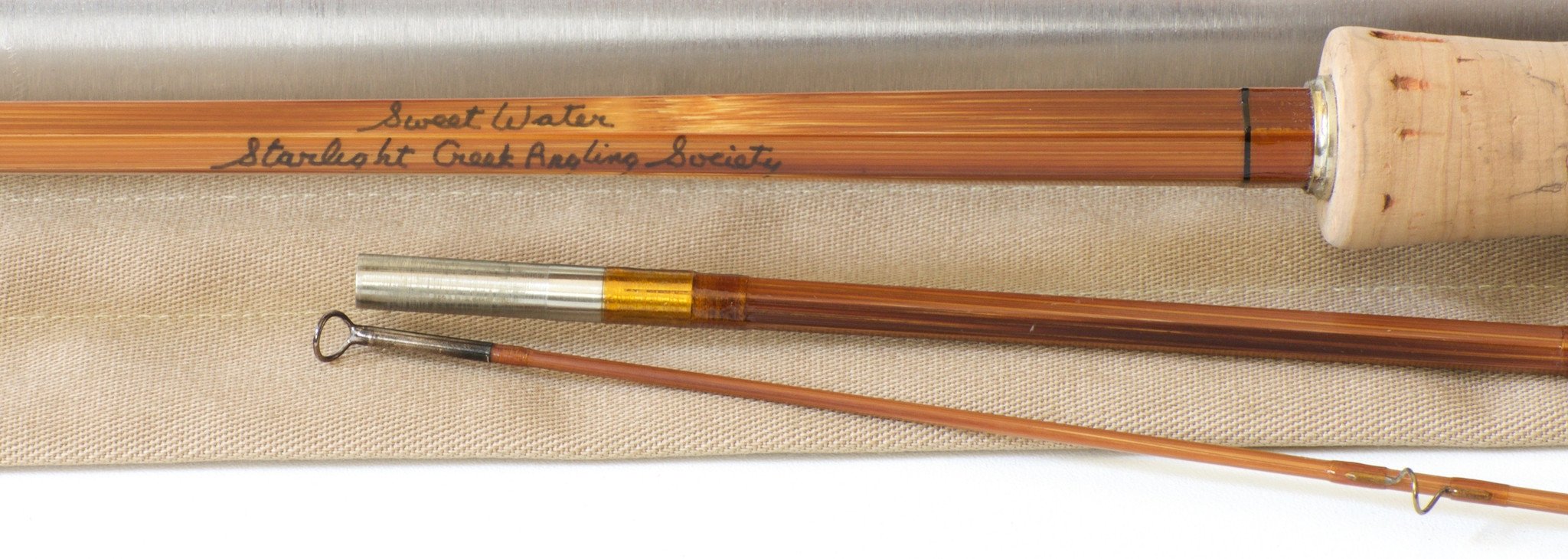 For sale here is a George Maurer bamboo rod. This model was dubbed "Harry's Rod", paying homage to Harry Middleton and the Starlight Creek Angling Society. The Starlight Creek rods were favorites of Harry Middleton. 8' 2/2 for a 5 weight line. From the Sweetwater rod catalog, "This rod handles the widest possible range of streams, rivers, conditions, fish and flies. A blend of the exceptional Payne and Granger 8' tapers and a joy to fish." Near mint condition. All rod sections and straight and full-length. Down-locking reel seat. Half wells grip. Ferrule plug. The rod weighs 4 3/4 oz. with size 14/64 Super-Z type ferrules. Medium fast progressive action. A delightful rod from a great maker who unfortunately is no longer with us.