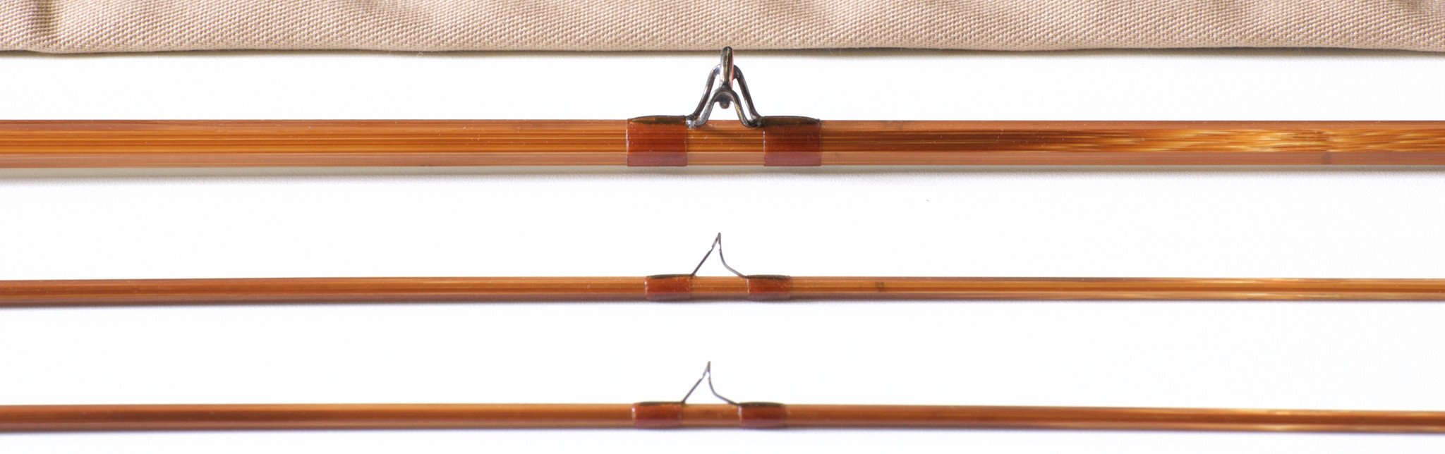 For sale here is a George Maurer bamboo rod. This model was dubbed "Queen of the Waters". According to Maurer's catalog, the rod is "A crisp caster with the reach and backbone to handle larger fish, this is the rod that Len Codella said was 'the best 8' 4wt made.' Many people asked me for a longer version of the Perfectionist taper. This is it. Will fish anything." 8' 2/2 for a 4 weight line. Near mint condition. All rod sections and straight and full-length. Oxidized cap and ring reel seat over a gorgeous wood spacer. Cigar grip. The rod weighs 4 1/8 oz. with size 14/64 Super-Z type ferrules. Medium fast parabolic action. A delightful rod from a great maker who unfortunately is no longer with us.
