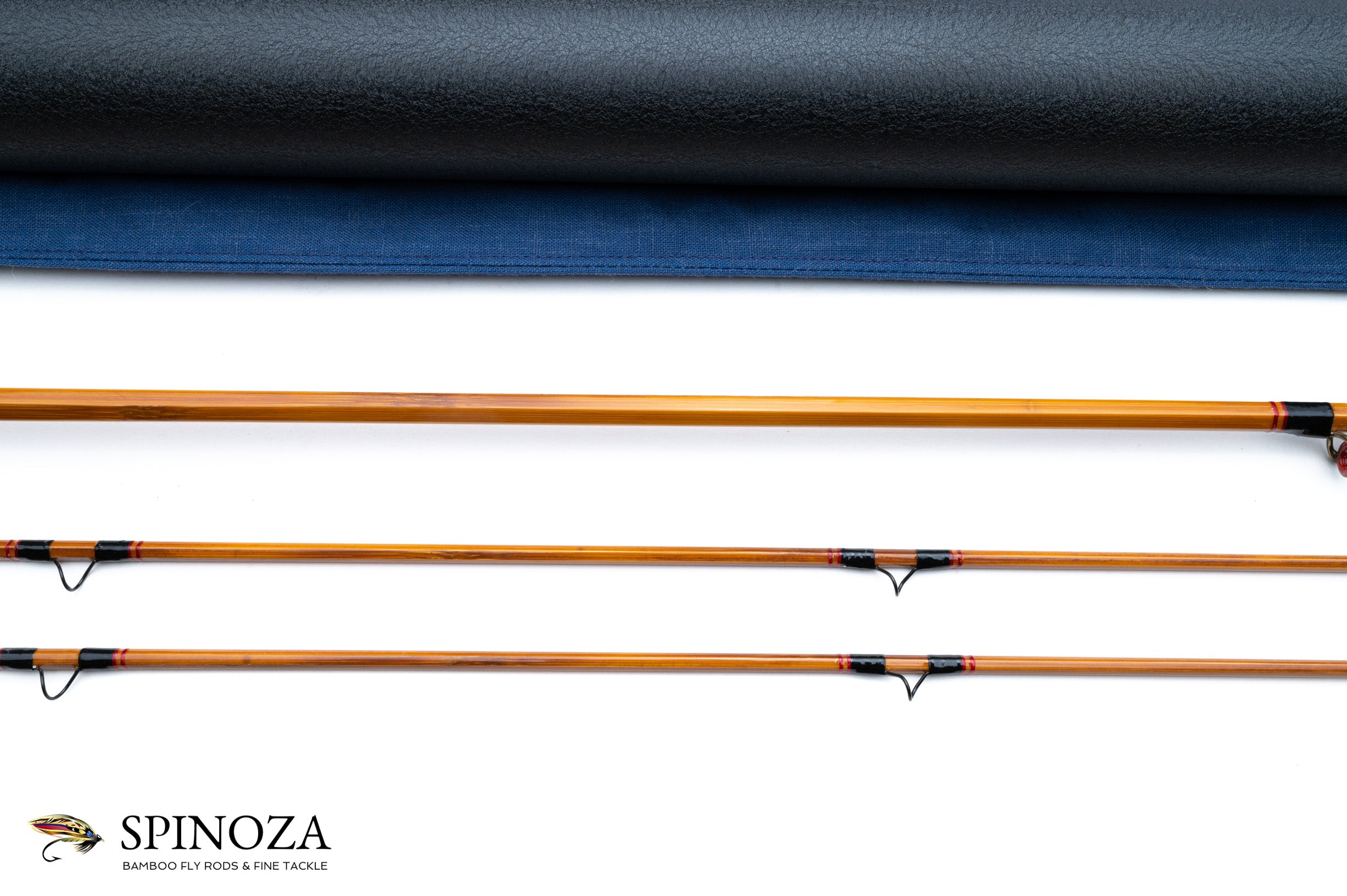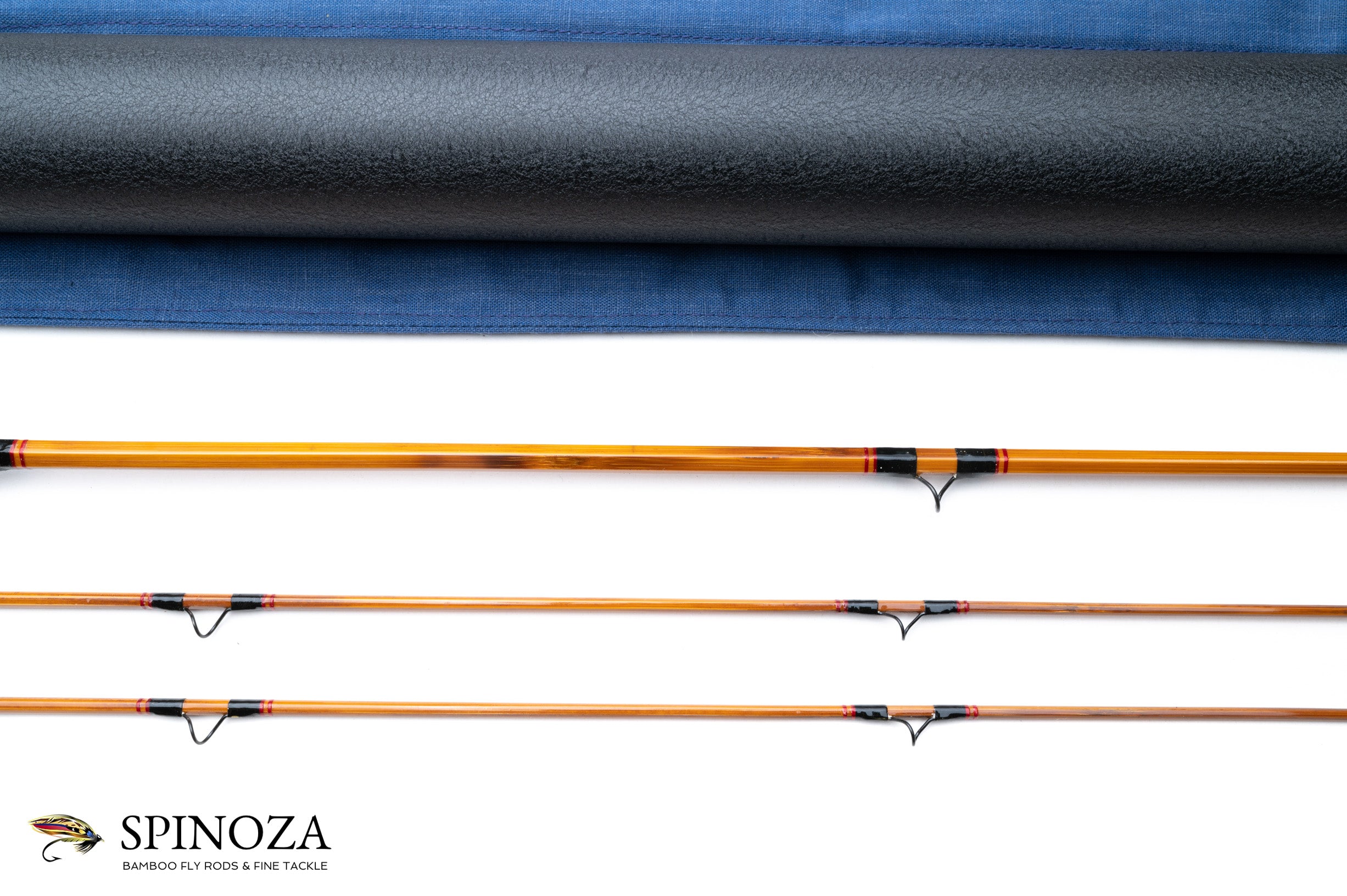 A Mike Clark (South Creek Limited) bamboo fly rod, 7', 2-piece, 2-tip, and built for a #3 line. Serial #002. The rod weighs 3.8 ounces. Medium fast action. Mint condition with no brassing to the inner snake guides. Spiral node pattern with the bamboo stained to a medium brown and varnished. The main wraps are black with red edges and red windaways. Red agate or agateen stripping guide and black snake guides. Super Z style swiss ferrules that are oxidized gray. Both tips do need some straightening. The grip is 6" long and shaped to a large blunt cigar profile. The grip has a little bit of pitting from chisel turning. The reel seat appears to be some kind of bone (white) and the nickel silver cap and ring and rear cork check have a rope knurl and are oxidized gray. The rod bag is a blue cloth and the aluminum tube is black crackle painted with brass hardware.