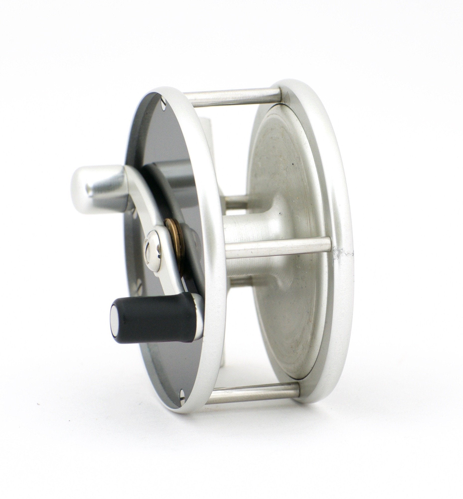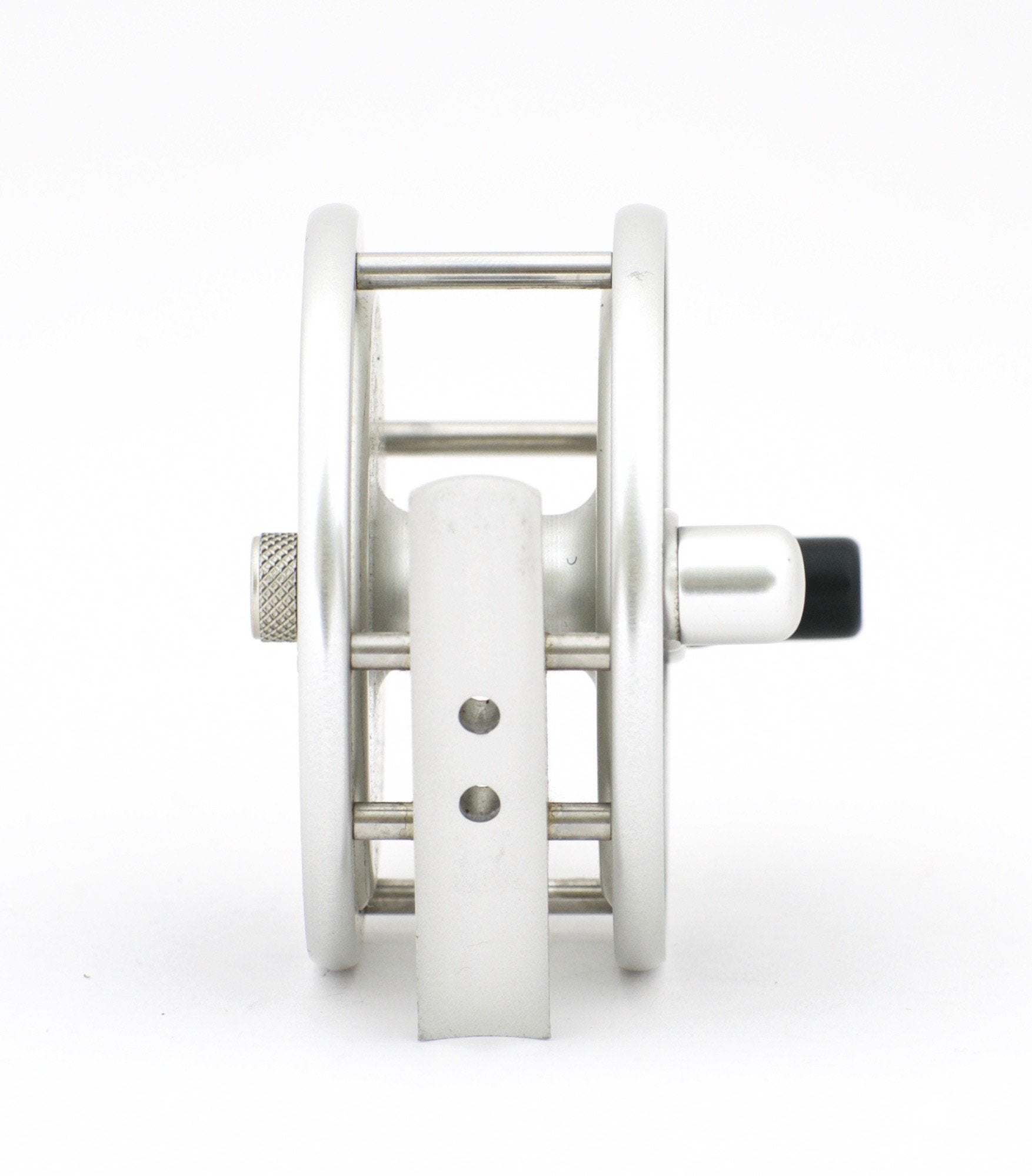For sale here is a Bo Mohlin "Medium Trout Wide" fly reel. Right hand retrieve. Solid front plate. Made to accommodate a 6 or 7 weight line plus backing. The reel weighs 5.8 oz. Frame diameter is 3.2" and the spool width is 1". The reel has a very smooth click drag with the perfect amount of spring tension. The reel remains in excellent++ condition with some super tiny marks in the anodized sideplates and evidence that the reel foot has been mounted on a rod.