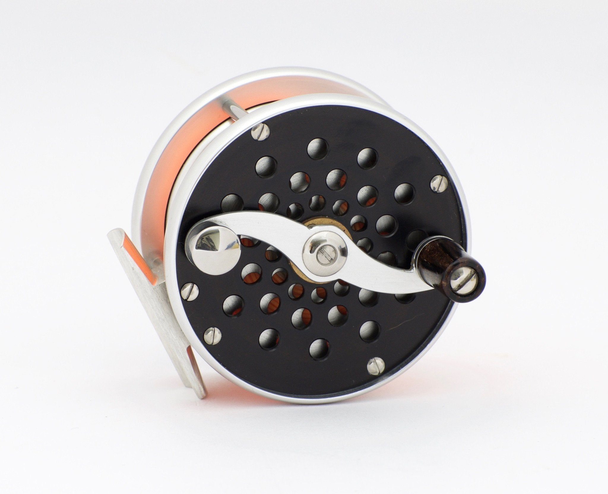 The reel is in mint condition. RHW. The frame is made of semi-matte aluminum and the side plates anodized black aluminum. S-style handle. Inscribed on the side plate is "Mohlin of Sweden" "No. 0375". The reel weighs 3.85 oz. with the included 2wt line and backing. The line is in mint condition. The reel comes in a very handsome leather case with a green felt lining and brass clasp. Stamped on the lid is "B" and "M" with a trout in the middle.