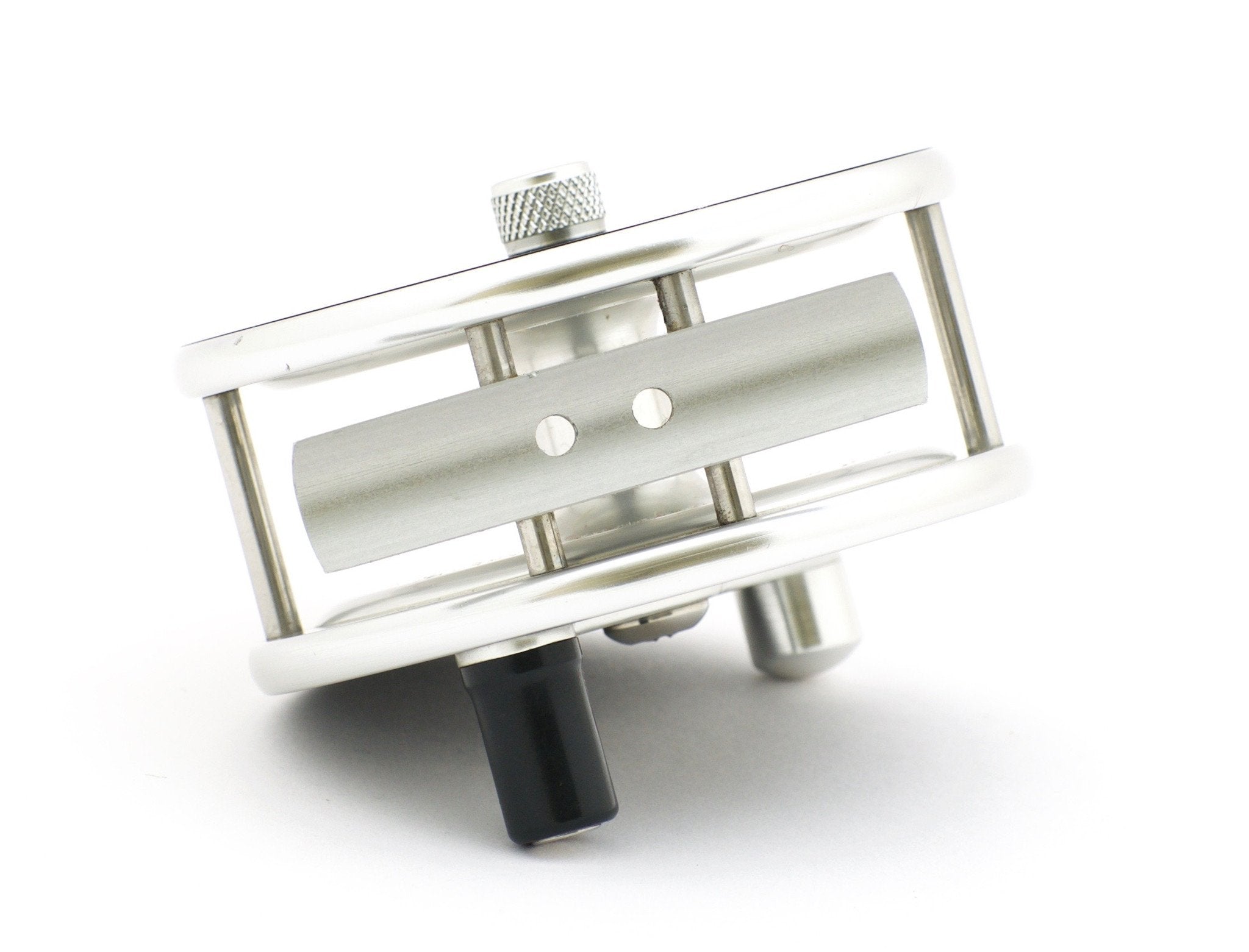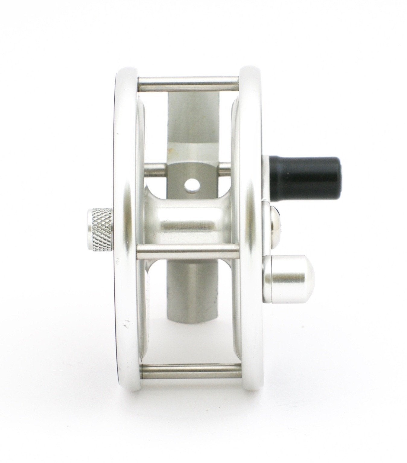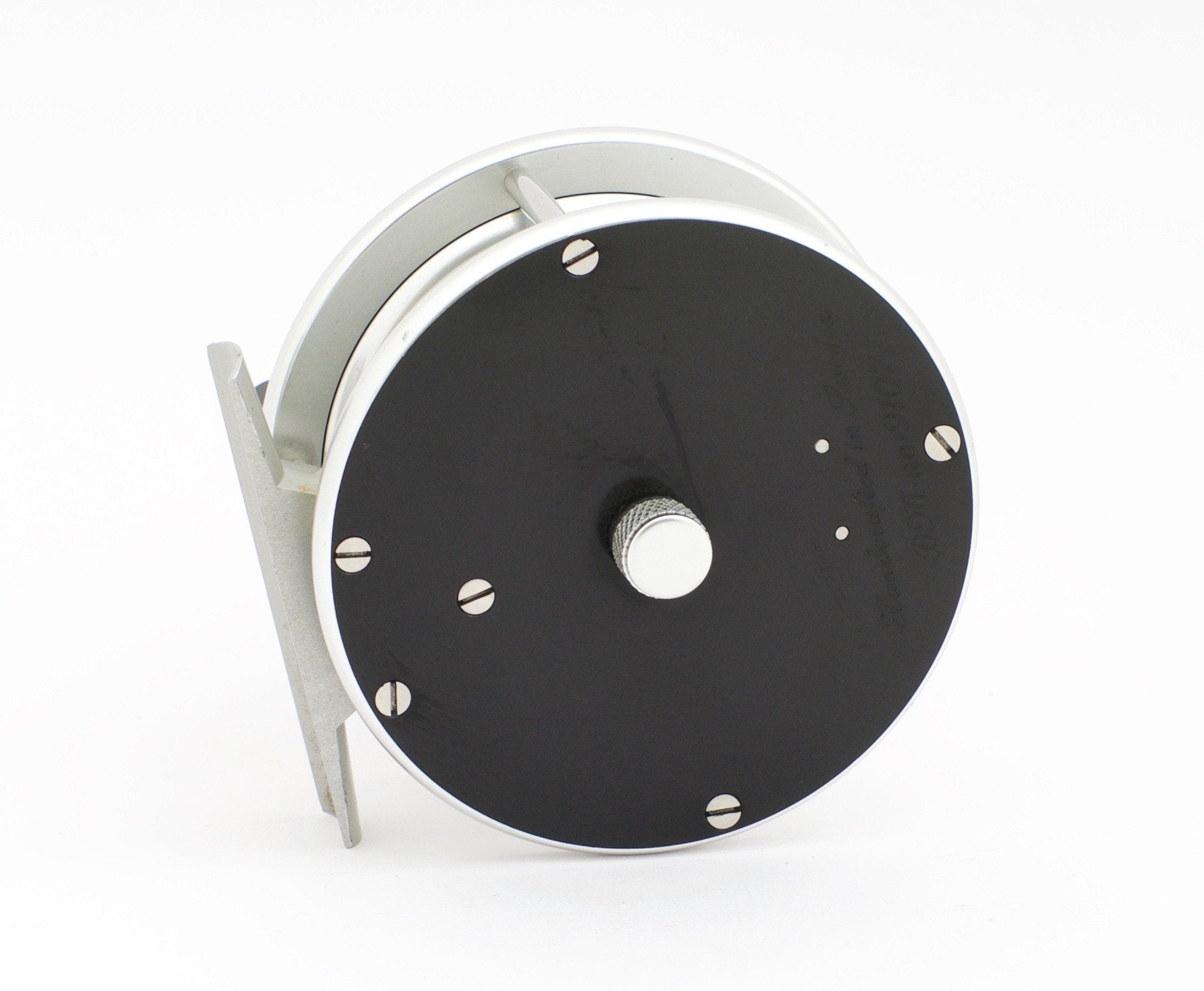 For sale here is a Bo Mohlin Trout reel. Left hand retrieve. The reel weighs 6.35 oz. Frame diameter is 3.30". Spool width (inner) is 0.85". Pillar length is 1.00". Glossy black anodized aluminum sideplates and aluminum rings. Made to hold a 5 to 7 weight line plus plenty of backing. The reel has a classic fixed click check, audible both ways. The reel remains in excellent condition, having been used sparingly and having a few marks in the anodized finish on both sideplates. Mr. Mohlin makes a wonderful classic-styled reel at an affordable price. Comes with an extremely nice hand-made leather reel case as well.
