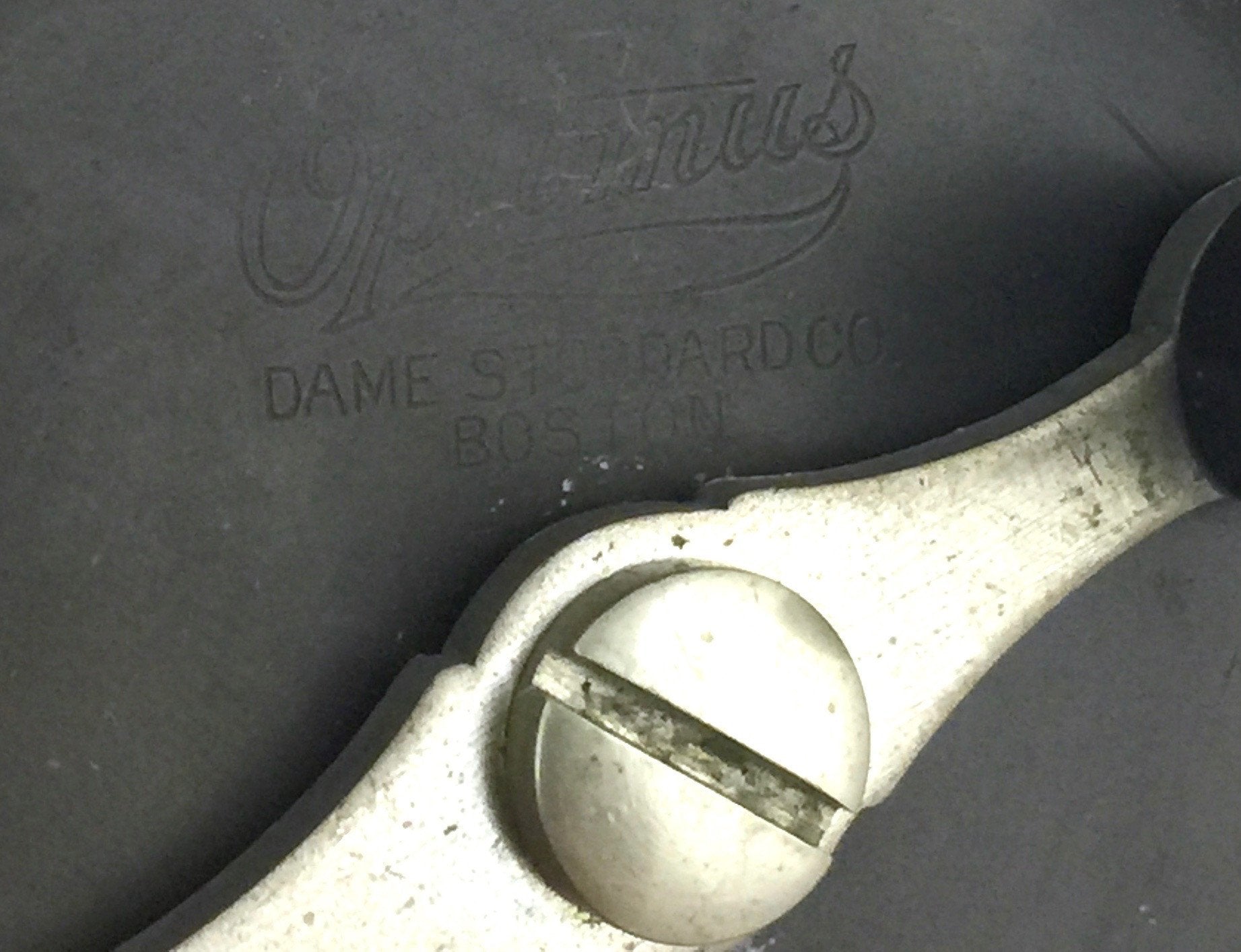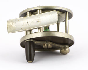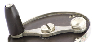 For sale here is a very nice "Optimus" trout reel made by Montague in the early 20th century for retailer Dame Stoddard of Boston. Made of German silver and hard rubber. The diameter of the reel is 2 1/8" and the pillar length is 1 1/16". The reel will hold a five-weight line plus backing. The clicker drag mechanism works flawlessly, as does the sliding click switch. All screw heads are in fine condition with a few showing slight marks. No cracks or chips exist in the ebonite sideplates although there is slight circular scoring to the front plate from the handle arm rubbing at some time in its life (it doesn't currently rub). The rims are in very fine condition as well. The reel foot is full length and includes the "60 yd" capacity designation.