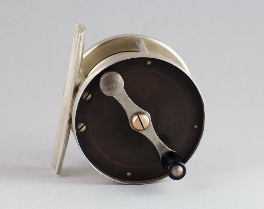 For sale here is a nice vintage hard rubber Montague fly reel, marked 'Trout' on the face plate. The spool, pillars, and foot are nickel silver. Handle is a well-fitting replacement and looks much like the original. Clicker is nice and strong the reel is in good working condition. It is marked '60' on the bottom of the full-length foot, for 60 yard capacity. 2 1/4" diameter. No cracks in the hard rubber.
