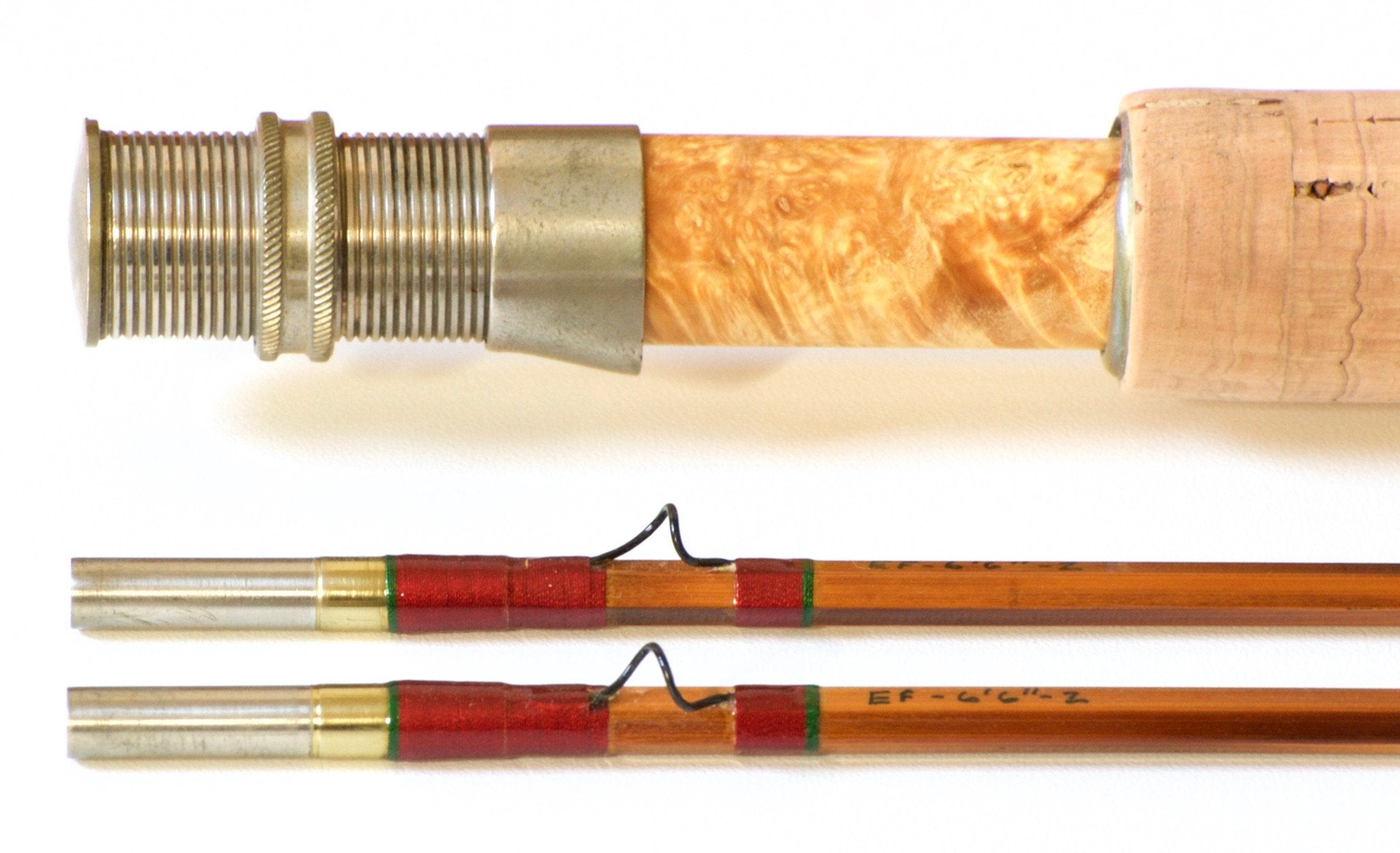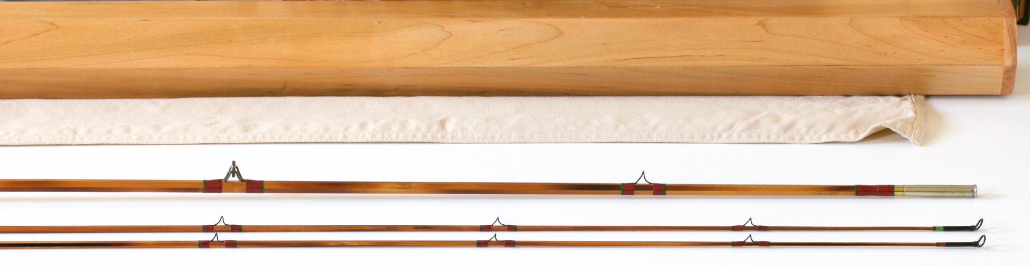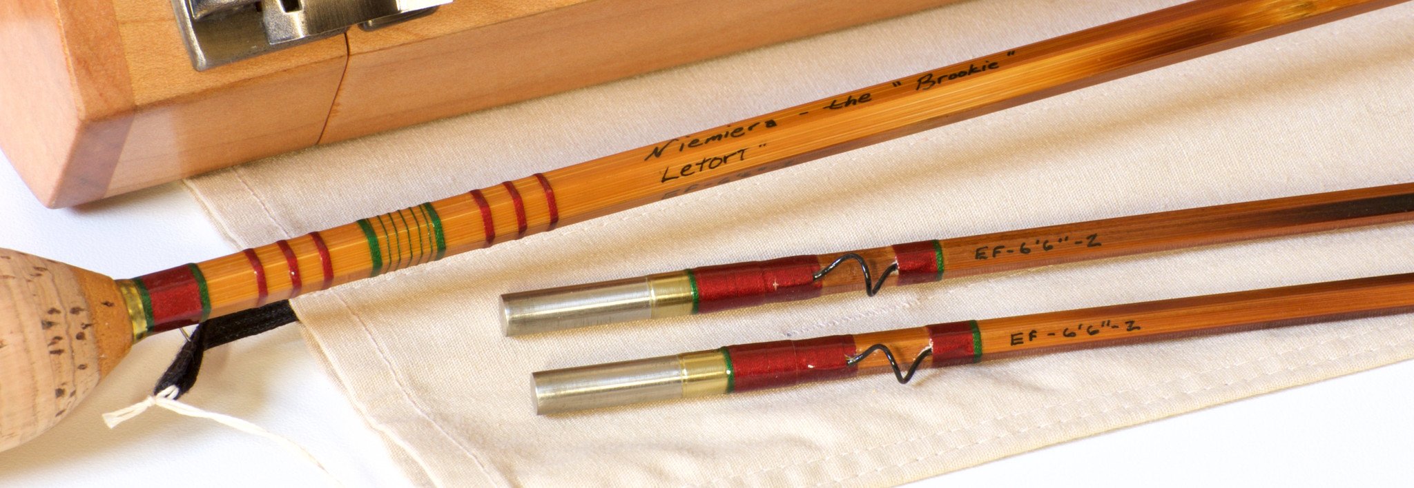 For sale here is a John Niemiera rod dubbed "The Brookie". 6 1/2 feet for a 3 weight line. Excellent original condition. Uplocking nickel silver reel seat. Ruby red wraps with green edges. Oxidized hardware. Garrison-style cork grip. The rod weighs 4 3/8 oz, most of the weight distributed by the grip due to the nickel silver reel seat fittings. The ferrules are Super-Z style 13/64 with a good fit. The action is fast.