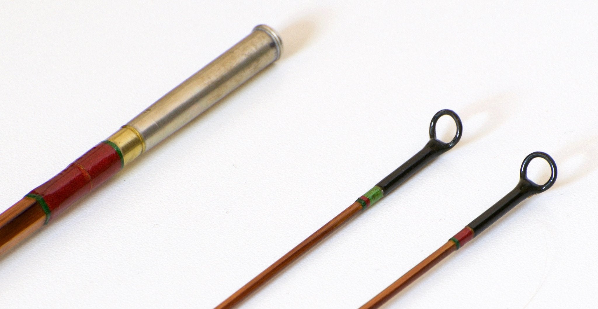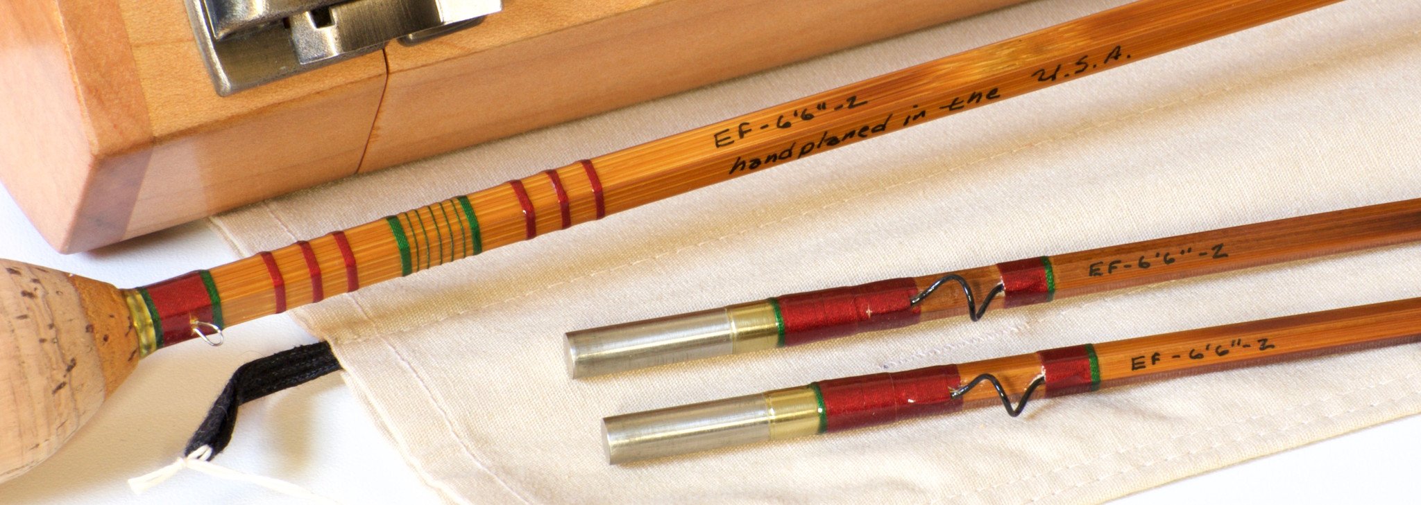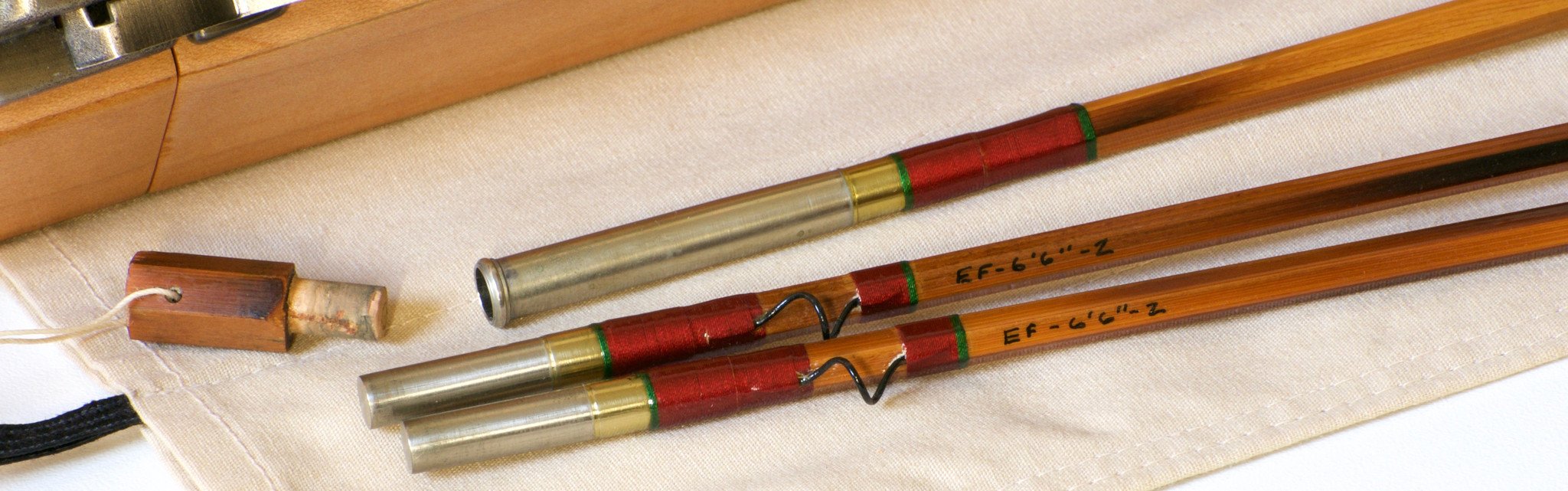 For sale here is a John Niemiera rod dubbed "The Brookie". 6 1/2 feet for a 3 weight line. Excellent original condition. Uplocking nickel silver reel seat. Ruby red wraps with green edges. Oxidized hardware. Garrison-style cork grip. The rod weighs 4 3/8 oz, most of the weight distributed by the grip due to the nickel silver reel seat fittings. The ferrules are Super-Z style 13/64 with a good fit. The action is fast.