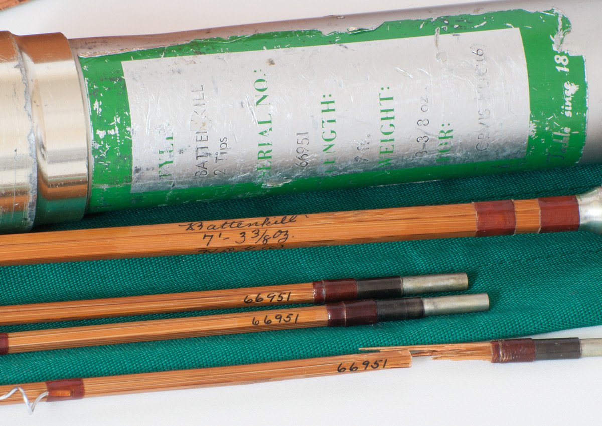 For sale here is a 7' impregnated Orvis Battenkill bamboo rod. 3 3/8 oz. 2/2 originally. Rated for a 6 wt but throws a 5 best in my opinion. Smooth medium action. Serial number 66951 made in 1972. Green bag, aluminum tube with silver and green label. The rod is in excellent condition overall. The ferrules are 11/64 and the ferrule fit is excellent. The rod comes with three tips. One of the tips was broken at the male ferrule and another tip was made by Orvis. The stripping guide is slightly bent as well, but not loose.