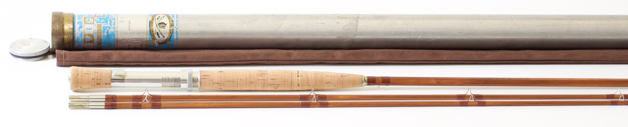 For sale here is an impregnated Orvis Battenkill 9' bamboo rod - serial #18524. Made in January of 1956 by Wes Jordan. The rod is in excellent condition. All sections are full length and straight. All script remains on the blank. Browntone cane with honey colored silks. Cigar grip is clean with very minor ridging in places. Aluminum down-locking reel seat, cork fighting butt with aluminum butt cap. Ferrule size 16/64, the fit is excellent. The rod weighs 6 3/8 oz. Medium fast action that is better suited for an 8wt line, though the tube recommends a 9wt. Rod comes with original brown bag and original tube with the blue and gold label. This would a great rod for steelhead, light salmon, bass, and even some saltwater species. A versatile heavy line rod.