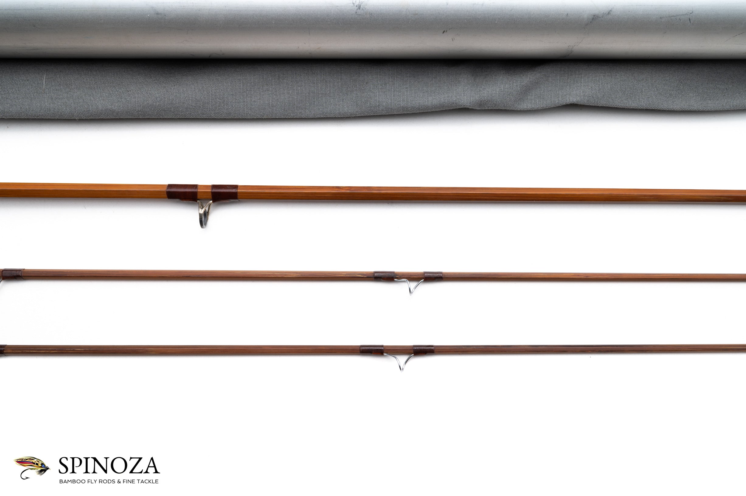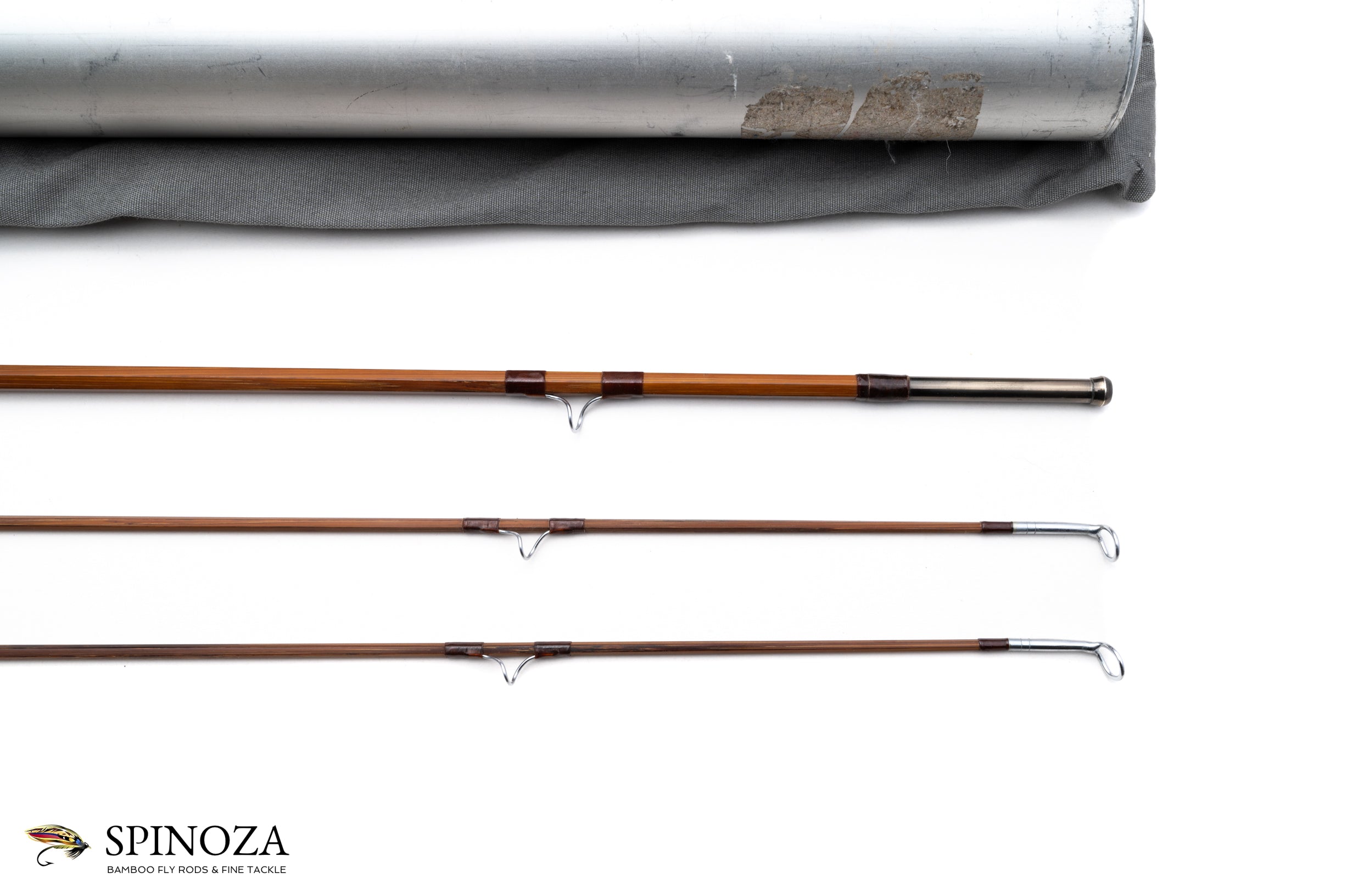 An Orvis Battenkill bamboo fly rod, 7', 2-piece, 2-tip, and built for a #6 line. Serial #60272. The rod weighs 3.5 ounces on my scale. Good used condition with some grip soiling, cosmetic casting cracks at the ferrule wraps, but no major defects that I could find. Dark temper cane with resorcinol glue Chrome snake guides with brown wraps and a carbide stripper. Oxidized step ferrules. The well soiled grip is a medium cigar profile that measures 6" in length. The reel seat is a downlocking aluminum screw lock and pocket cap with an unvarnished walnut spacer. The rod packs into a gray cloth bag and the aluminum tube is in excellent condition with the data sticker 99% intact.