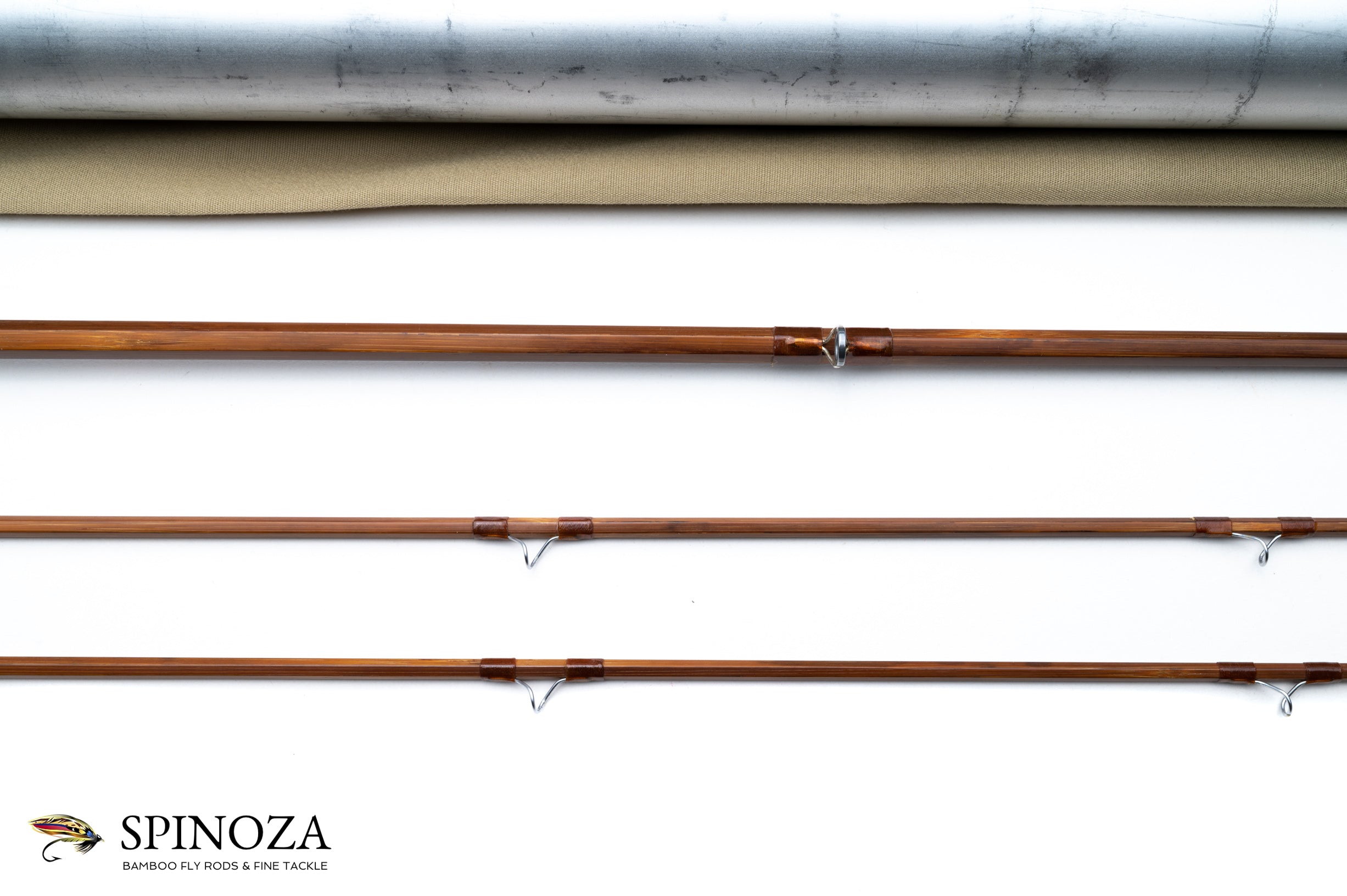 An Orvis Battenkill fly rod, 8', 2-piece, 2-tip, and built for a #8 line. 4.5 ounces. Serial #49677. Fair used condition with some surface scratches on the cane. Medium action. Dark oven treated cane that's impregnated. The main wraps are brown with a carbide stripper and chrome plated snake guides. The ferrules are step down and are oxidized. The grip is a slim cigar that's 6" in length. The reel seat is an aluminum downlocking screwlock with a pocket cap over a walnut spacer. The rod packs into a tan bag and aluminum tube which retains 100% of the original data sticker.