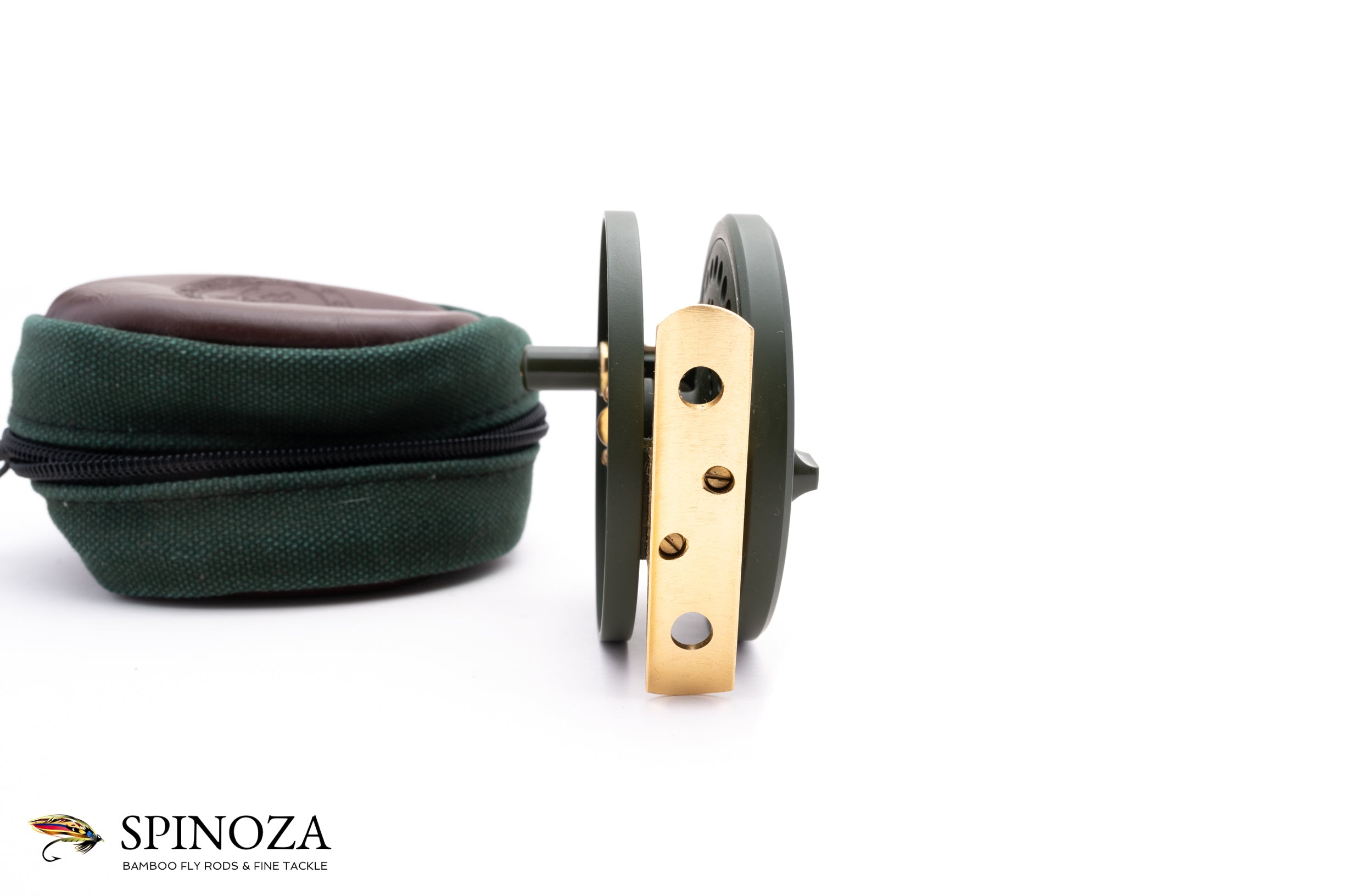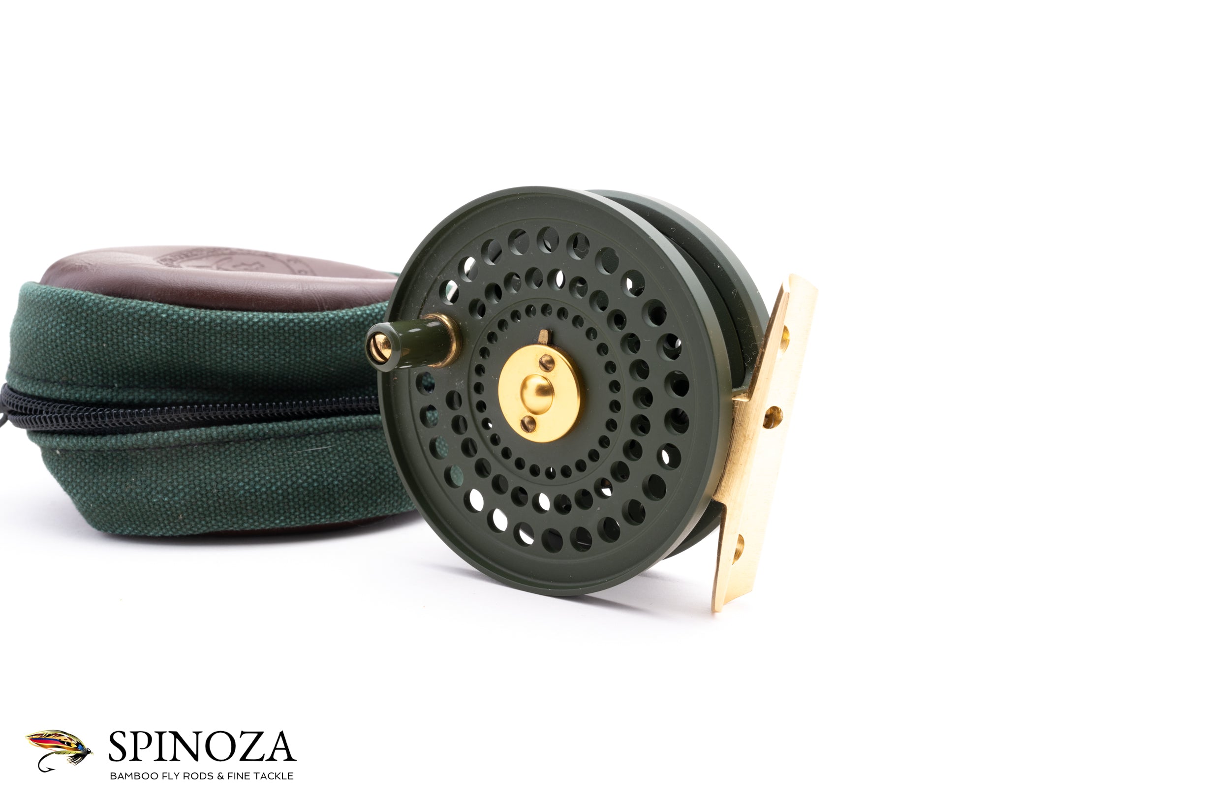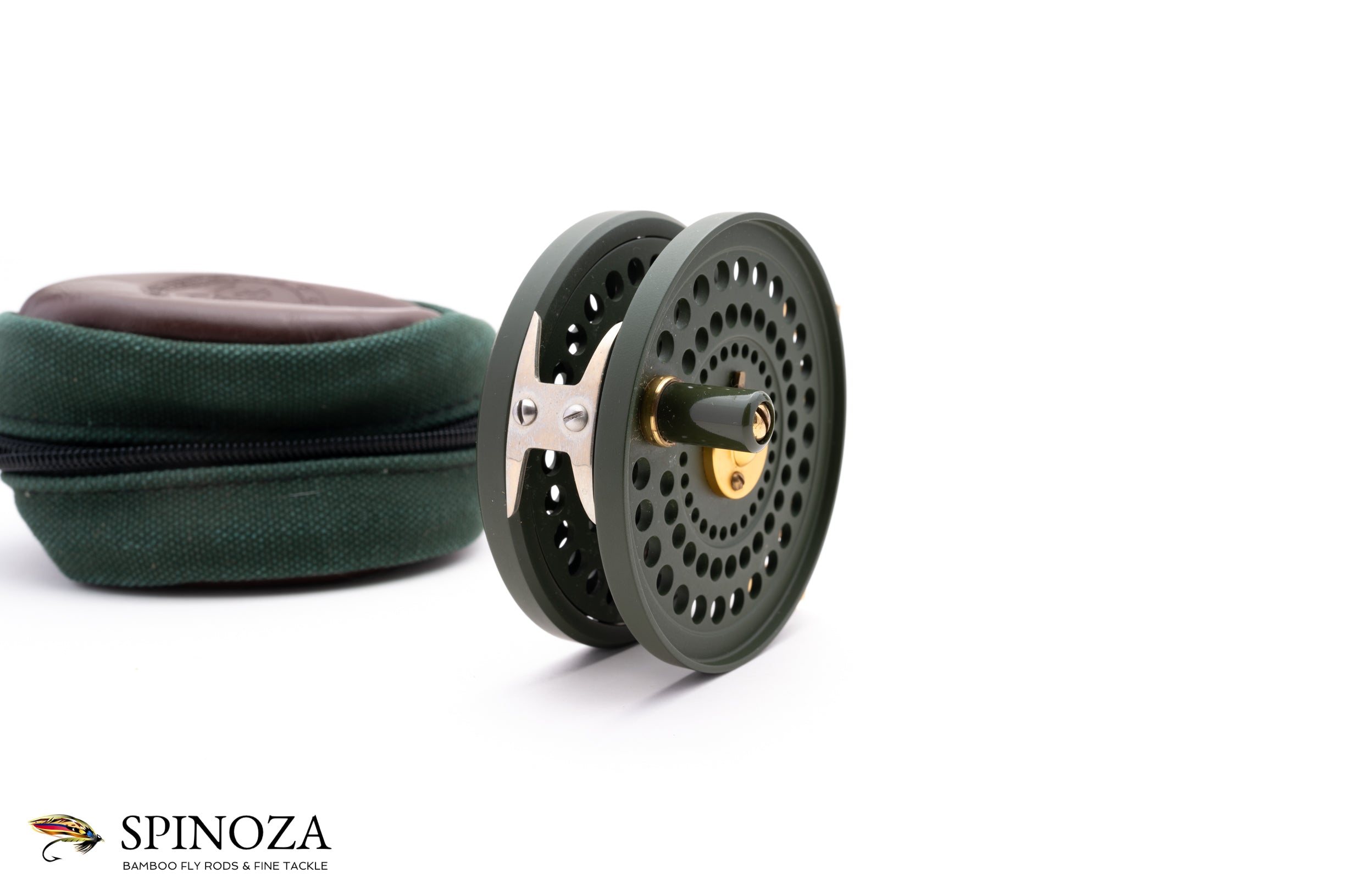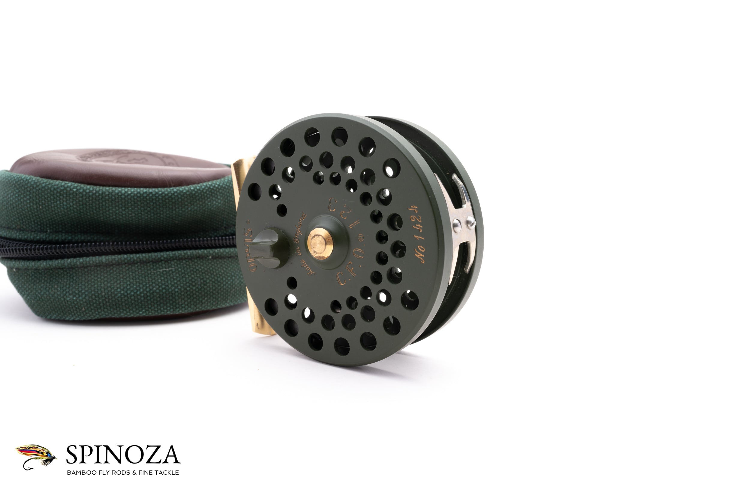 A very nice Orvis CFO 123 limited edition fly reel. Made in England for Orvis by Hardy in the late 80's or early 90s. Approximately 2 7/8" diameter and currently set up for LHW though easily reversible. Near mint condition bordering on true mint. There are a few marks on the foot but I could find no sign of wear anywhere on the rest of the reel. This is #1424 of the limited edition run. Olive frame and spool with gold accents. The reel packs into the original leather and canvas reel pouch.