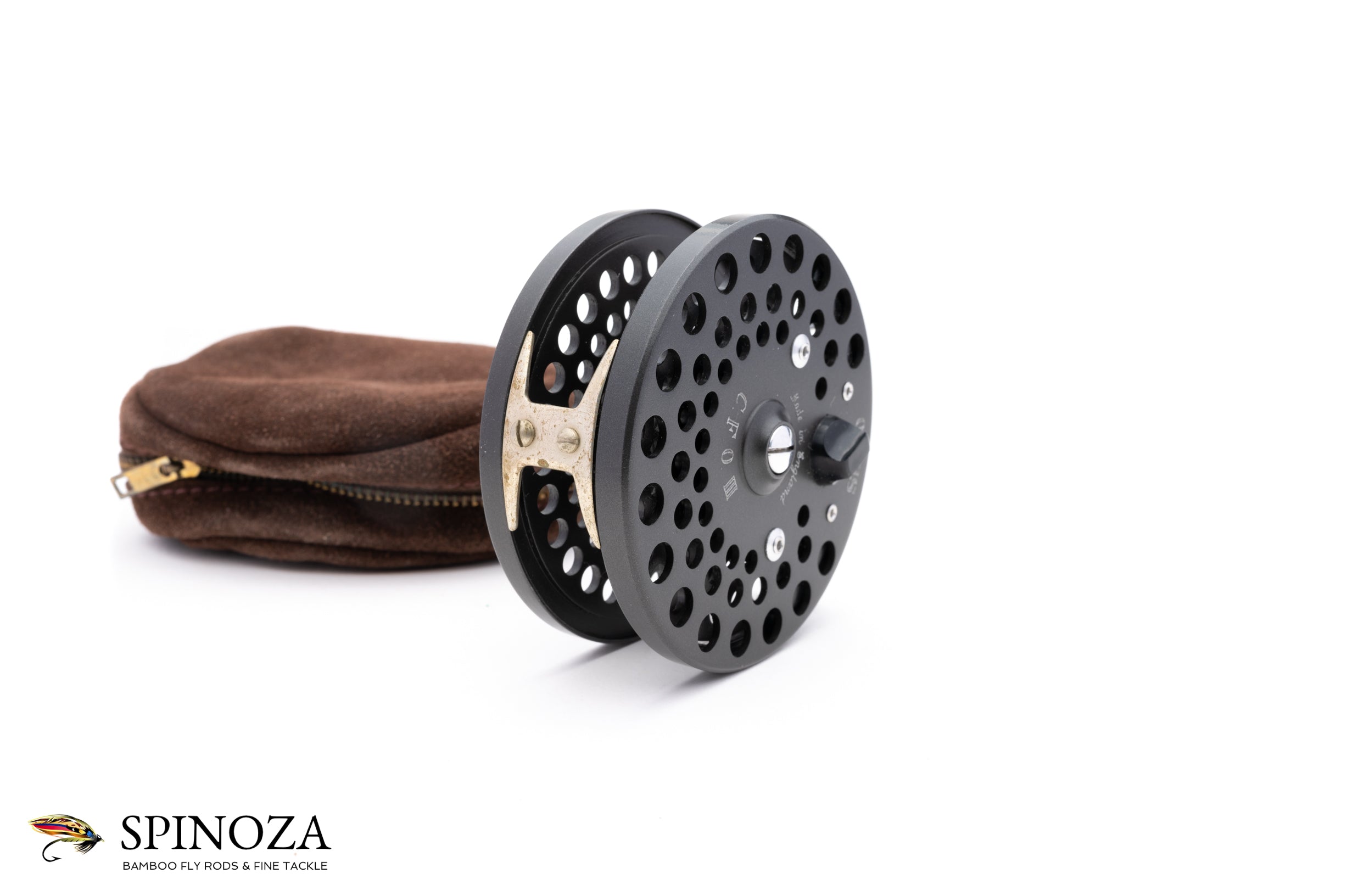 A nice Orvis CFO III screwback fly reel, 3" diameter and set up for either LHW or RHW wind. Near mint condition with some mounting marks on the foot being about the only sign it's ever been on a rod. Early screwback model. Designed to hold up to a WF6 line + 50 yards of 20# backing. The reel packs into a brown zippered suede case.