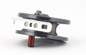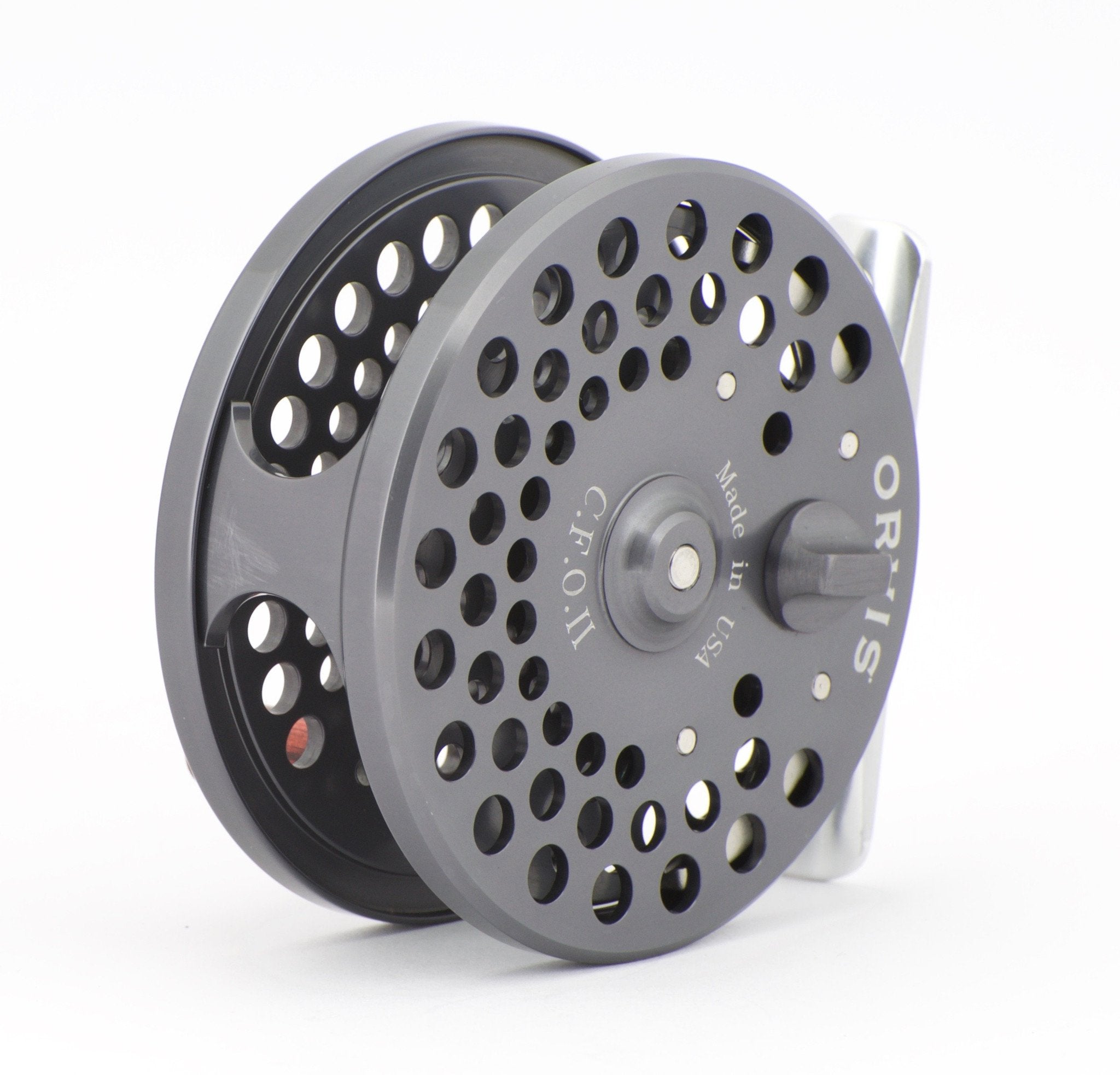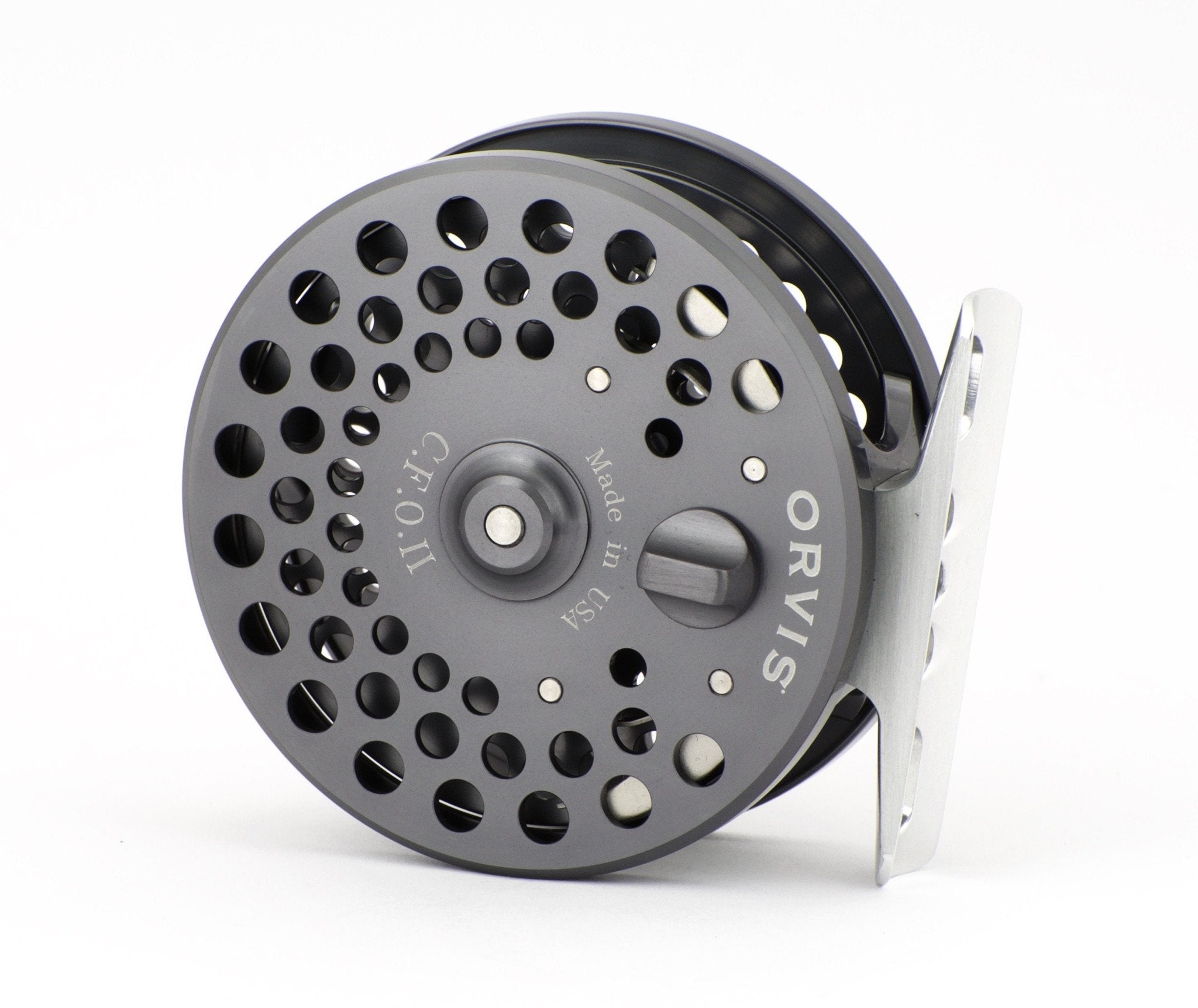 For sale here is an Orvis CFO II fly reel in near mint condition. The only cosmetic mark is a smudge in the anodization on the pillar. Made in the USA by Abel to exacting standards. The finish is a lovely gunmetal color. Adjustable spring-and-pawl drag system. Easily converts from RHW to LHW. One-sided frame that allows for easy and quick spool changes. Exposed rim for palming. Intended for line weights 3-5. Reel weighs 3.3 oz. Diameter is 2 7/8". Included with reel is original box, manual, and neoprene Orvis reel pouch.
