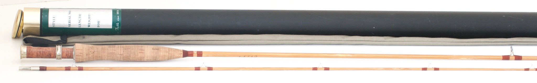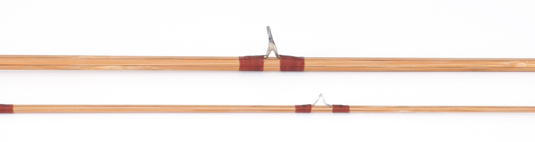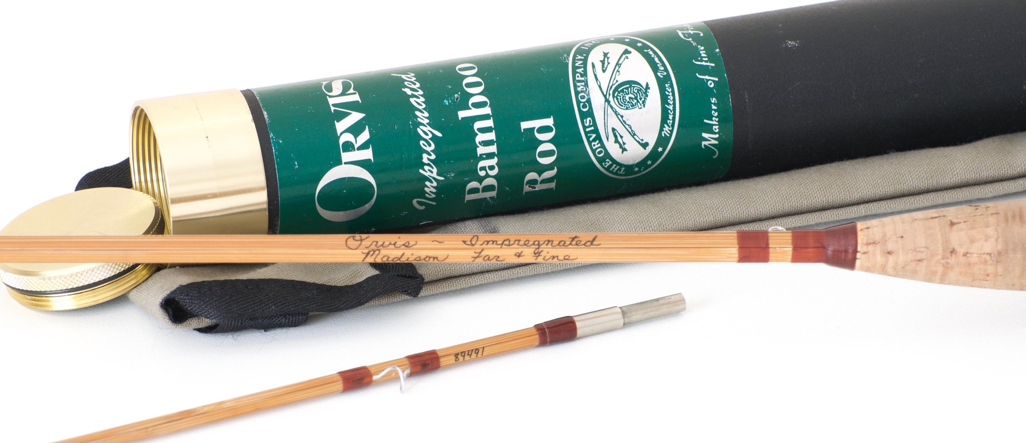 For sale here is an impregnated Orvis - Far and Fine Madison 7'6" 5wt 2/1 bamboo rod. Serial no. 89491. Made in 2000. The rod is in excellent original condition, made with one tip. Both sections are full length and straight. The rod features light straw colored cane with dark amber wraps and bright guides. The script on the rod remains as clean and bold as the day it was written. U-shaped hook-keeper. Reverse half-wells grip is somewhat soiled but free of ridging, hook gouges, or any other defect. Fine nickel silver, up-locking cap and ring reel seat with a beautifully figured, mortised burlwood spacer. Nickel silver buttcap with a fine knurled edge. The bright, step-down, nickel silver ferrules are size 11/64, the fit is perfect. The action is on the medium side of medium-fast. The rod weighs in at 4.15 oz. Includes original grey bag and tube with green and silver label. Don't miss out on this versatile, dependable rod from one of biggest and longest lasting names in fly fishing.