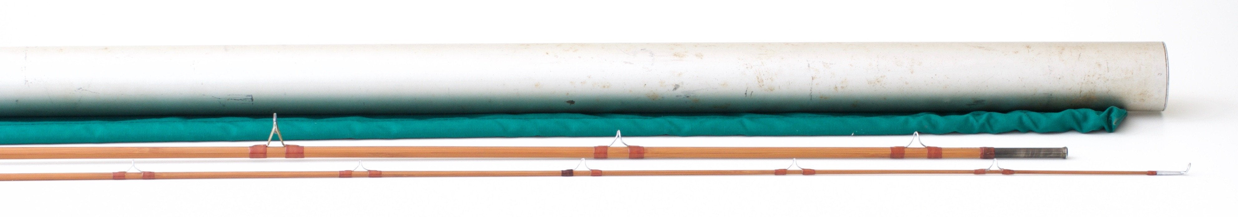 For sale here is an impregnated Orvis Madison 8'9" 2/1 8-9wt bamboo rod with a labeled weight of 5 7/8 oz. Serial no. 67819. Made in 1972. The rod is in excellent original condition. It has received a light varnish overcoat on the guide wraps and over the script and one of the wraps on the third guide from the tip-top has been rewrapped. It is otherwise all original. Both sections are full length and straight. The rod was made with the butt section 3 3/8" shorter than the tip. Rust colored wraps. Bright guides. The script is suffering from a bit of ink loss but it is still legible. U-shaped hook keeper. Aluminum winding check. Classic cigar-style grip 6 1/2" in length. The cork is moderately soiled and ridged toward the top. Bright aluminum down locking reel seat with a lightly varnished walnut spacer. The blued step down ferrules are size 16/64 with a pleasing fit. The actual weight of the rod is 5.95 oz. The action is medium-fast with plenty of power in the butt. The tip is delicate enough to allow for casts requiring more finesse and also provides tippet protection. Though the rod is labeled as a WF10 on the tube and rod, an 8 or 9wt line will fish much better. I cast the rod with a WF8 Rio Bonefish line that felt perfect. The rod includes the original green bag and original tube with green and silver foil label.