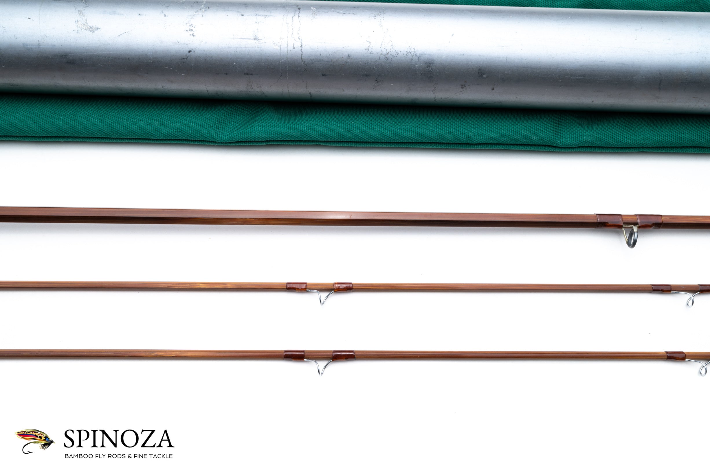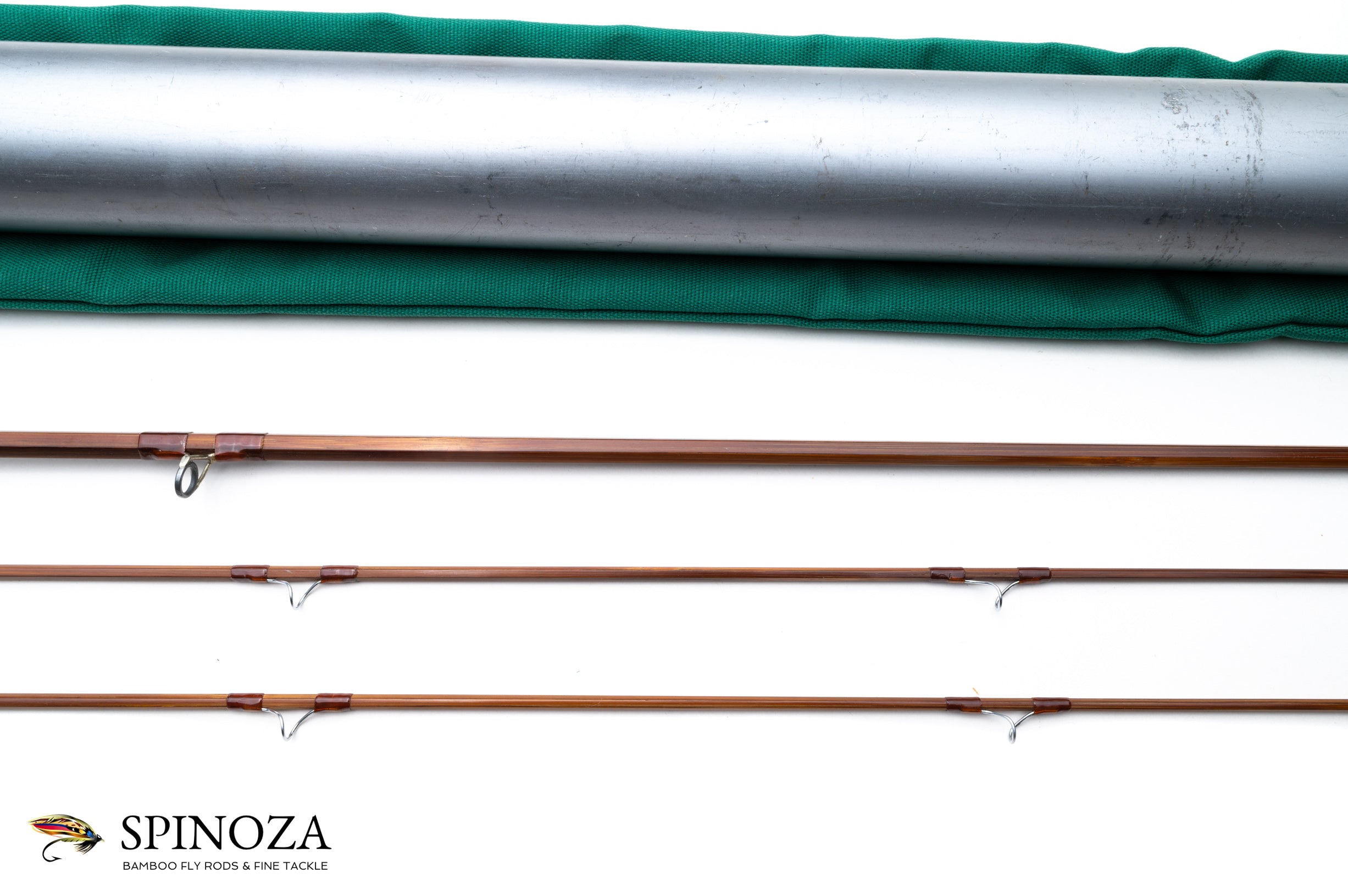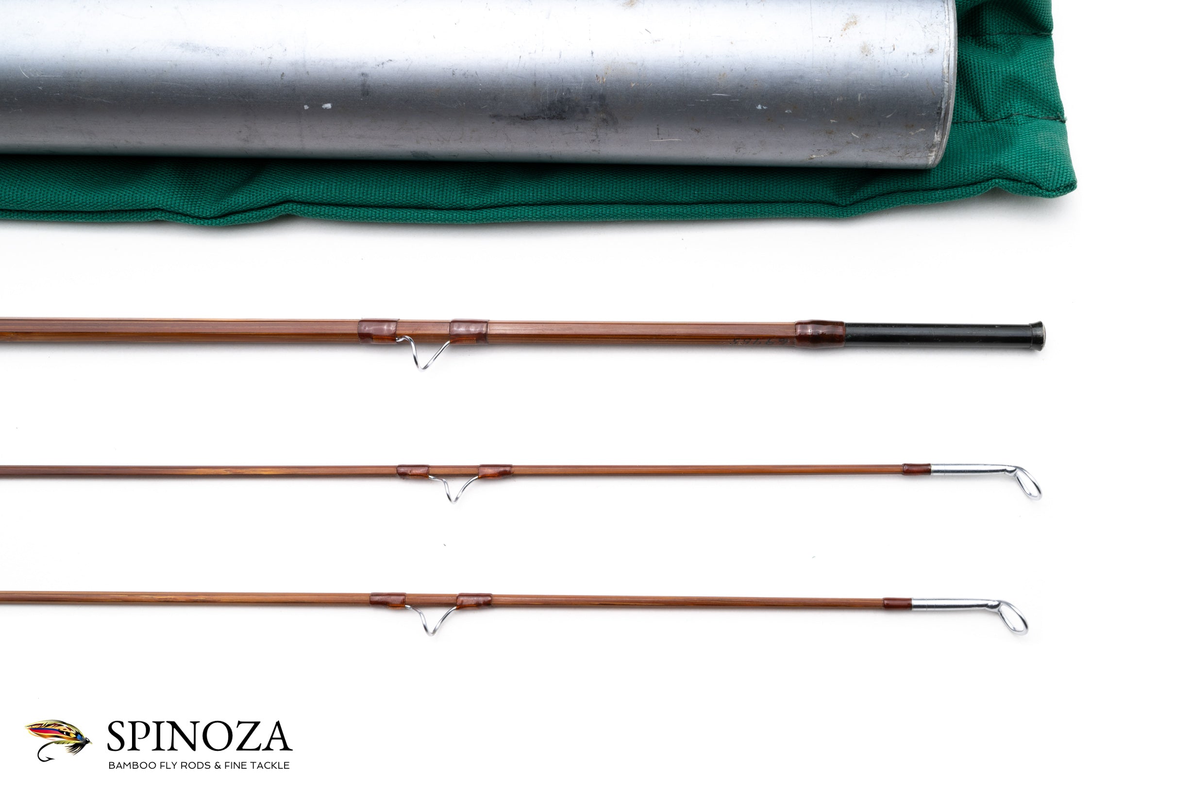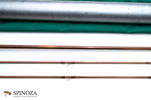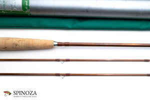 A nice Orvis Midge bamboo fly rod, 7'6", 2-piece, 2-tip, and built for a #5 line. Impregnated model. Serial number 69755, built in 1973. The original owner's name is inked on the rod along with the basic rod information. Medium dark cane done in a three up node pattern. Medium action. Excellent very lightly used condition. Apricot wraps throughout with chrome guides and tip tops. Oxidized ferrules. Hook keeper. 6" grip with a medium cigar profile that has a fairly strong taper to front. Aluminum downlocking screwlock reel seat over a varnished walnut spacer. The rod packs into a green cloth bag and an aluminum tube with the Orvis data sticker affixed to it.