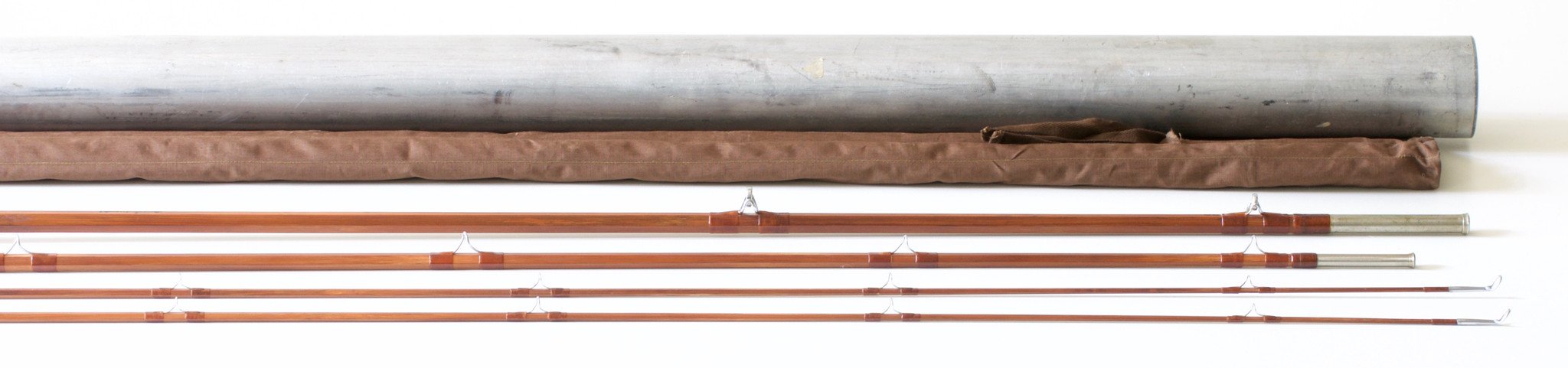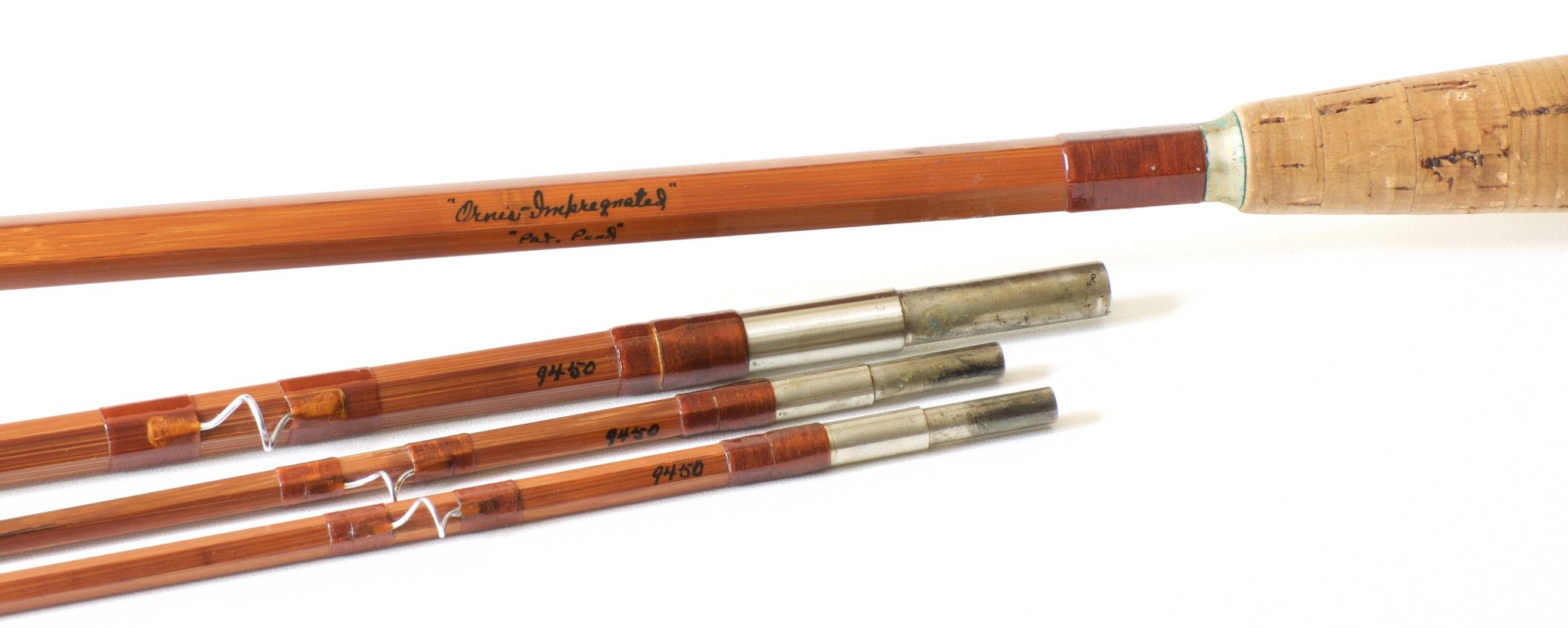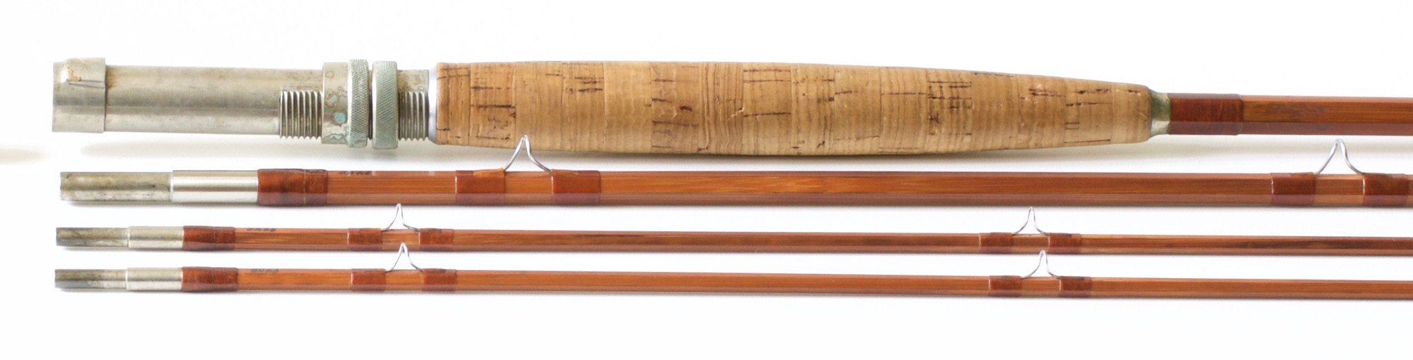 For sale here is an Orvis Salmon 10' 9wt 3/2 bamboo rod with detachable extension/fighting butt. Serial #9450 made in 1950 by Cal Skinner. The rod is in excellent original condition with the exception of the mid section being down 1 3/8". The rod was repaired by Orvis most likely at the female ferrule. Orvis did an outstanding job as without the rod being down a bit one could never tell. Thread color matches perfectly. The rod features classic browntone cane with chestnut silks. Cigar grip with light soiling. Down-locking nickel silver reel seat. The cork check between the grip and reel seat is slightly loose. The fighting butt/extension is 5 1/2' in length. The cork has some soiling but is in excellent condition. The rubber butt cap is also in fine shape, not at all dry or cracked. Ferrule sizes 13/64 and 20/64. Rod weighs 8.55 oz. without extension and 11.10 oz. with. Original brown bag with extra section for the extension. Replacement tube with brass collar and aluminum cap.