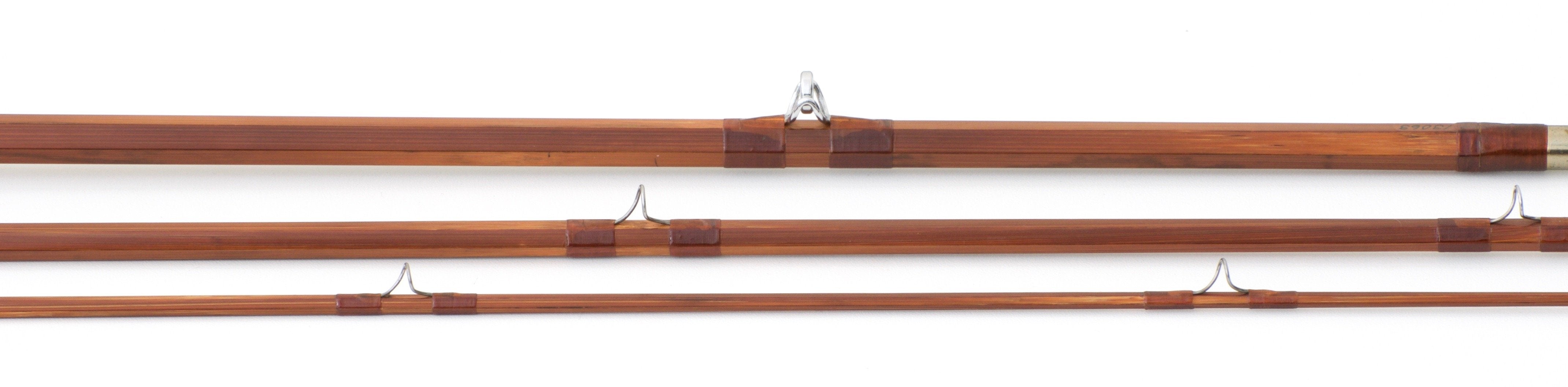 The rod features handsome, darkly tempered cane with chestnut wraps. Bright guides. The script remains clean and bold. Aluminum winding check. Cigar grip 7 1/2" in length. Though soiled, the grip is void of any major defect. Aluminum down-locking reel seat. It appears that the rod accepted a fighting butt originally but has since been lost. The current butt cap is stuck in place. The ferrules are size 19/64 and 13/64 with a great fit. The rod weighs 7.80 oz. The action is medium-fast.