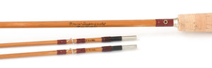 The rod features straw colored cane with cinnamon colored wraps. The original info's scripted is on the flats as well as the original owner's. Bright guides. Ring hook keeper. Aluminum winding check. The cigar grip measures 6 3/8" in length. Aluminum down-locking reel seat over a handsome walnut spacer. The butt cap also features the original owner's name on the bottom. The blued step-down ferrules have an excellent fit. The rod weighs in at 4.10 oz. with a labeled weight of 3 7/8 oz. The action is a wonderful medium-fast that finds a great balance between finesse and power. Though marked for a 6wt most Orvis rods do best with a line size down. A very versatile rod ready for just about any trout situation.