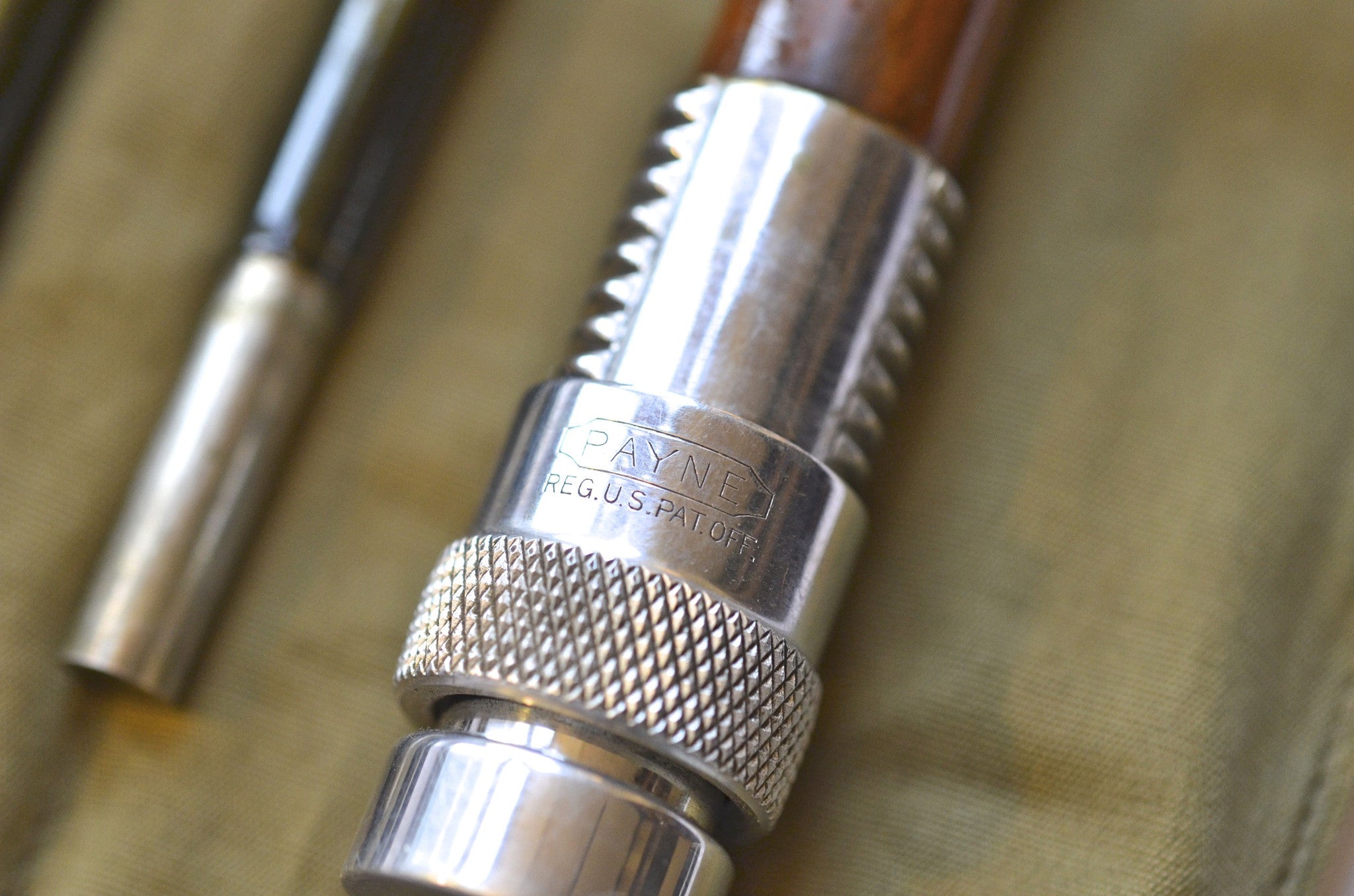 An E.F. Payne 9'6" 3pc light salmon rod for a #7 line with two mids and two tips. This medium action rod was one of those sold by Abercrombie and Fitch. This rod also appears to have been originally sold with two tips and two-mids since the bag (original) has all five sections. Each section is full length and original. This rod has an uplocking screw-lock with Payne's standard Spanish cedar spacer. The wraps are brown with purple edges and the rod has an agate stripper. Supplied in original Payne tube with tan canvass overbag with fighting butt pocket. The negatives are as follows: as with many Paynes of this vintage the varnish has bag imprints in areas and there are no ferrule plugs and no plug for the bottom of the reelseat when the fighting butt is not in use. There is also a small clear wrap 1/2 inch in length below tip top. All in all, however, a great fishable rod from one of the supreme masters of the craft, one that's ready to head straight up to the Grand Cascapedia.