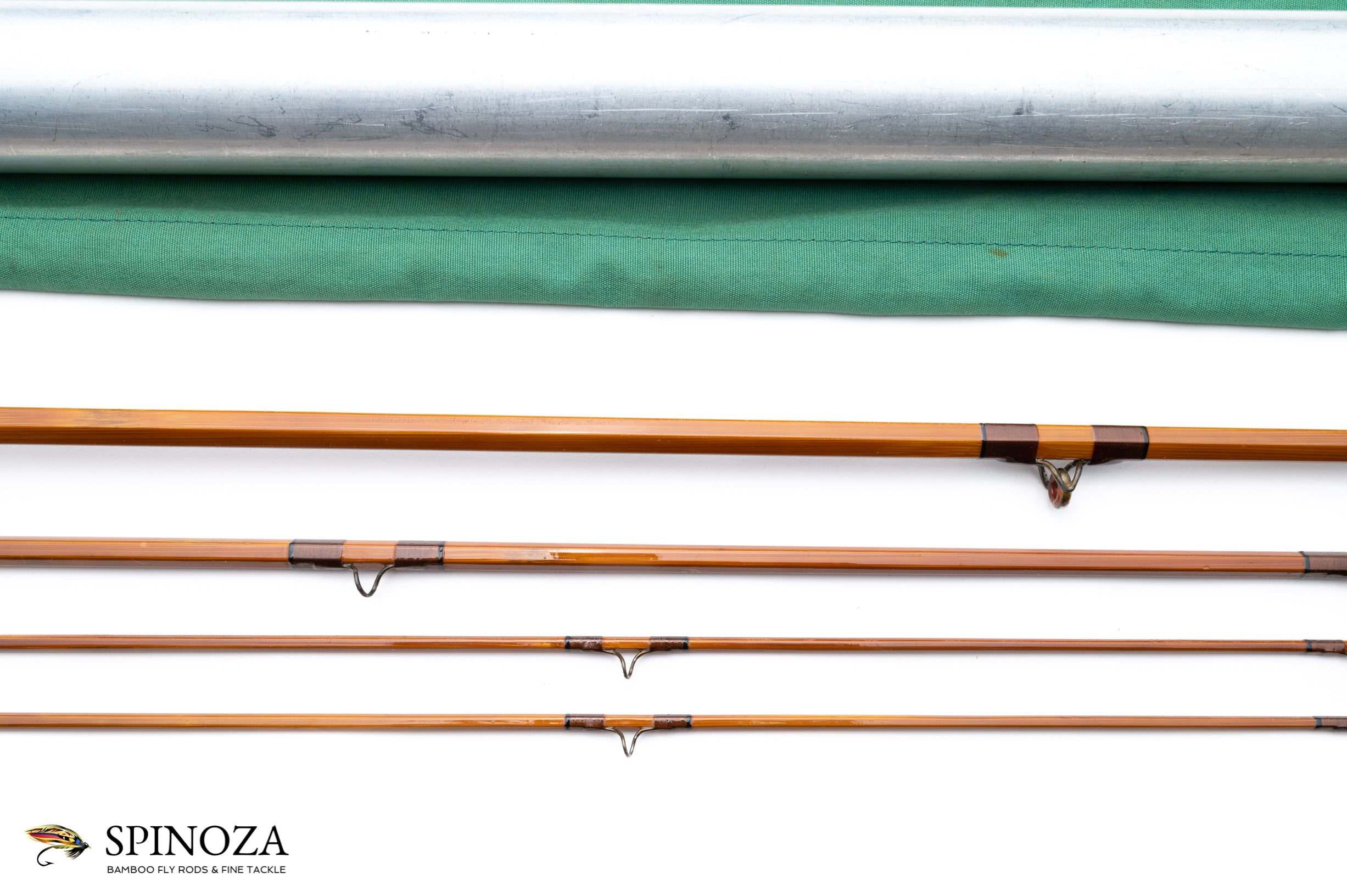 A nice EF Payne bamboo fly rod, 8'6", 3-piece, 2-tips, and built for a #5 or #6. 4.6 ounces. Powerful medium action. Based on the specs I suspect this is a Model 205, but there is no hang tag to confirm. All original and full length. The ferrule fits are good and the rod is perfectly straight. There is some wear to the inner guides and the varnish is only in fair condition. While not soft to the touch, there is considerable bag imprint, though thankfully no areas of out-and-out bare cane. The wraps are brown with black edges and an extra band of yellow and purple at the keeper and the male ferrules. Agate stripping guide and high arch HSS snake guides. The step ferrules retain 95% of their original oxidation. The 5 1/2" long medium cigar grip has unfortunately been cleaned leaving it somewhat ridgy. The rod is outfitted with a walnut slide band seat retaining 90% of the oxidation. The butt cap is stamped "Payne" "Reg Us Pat Off" and on the reverse "Sold by, HD Folsom Arms Co, New York". The poplin green bag is original but missing the hang tag. The tube is original but missing the felt in the cap.