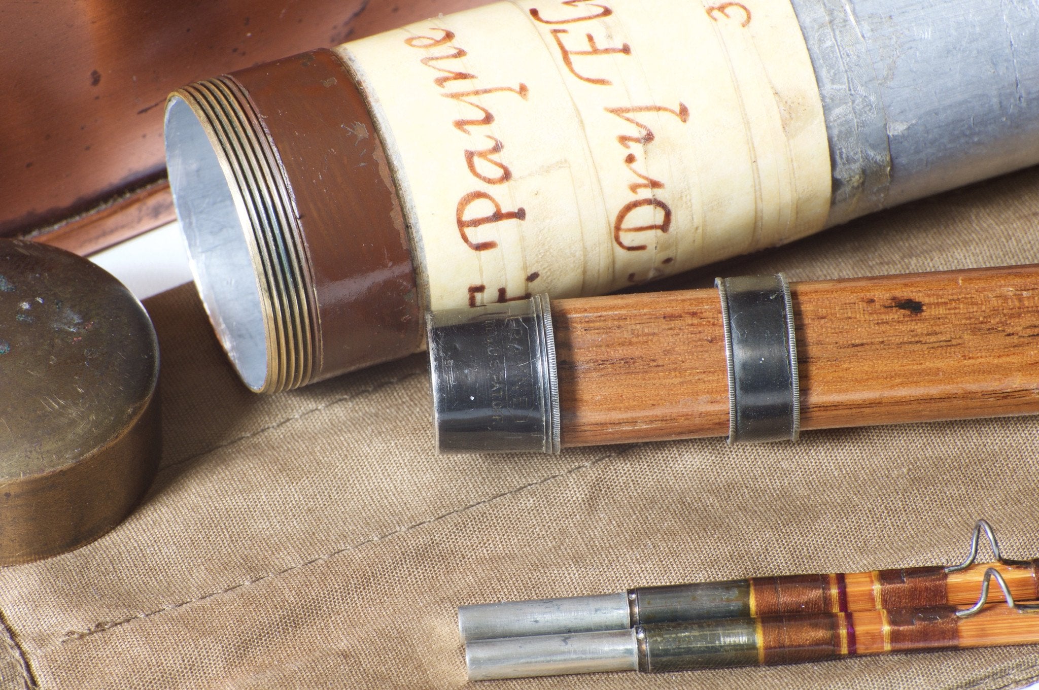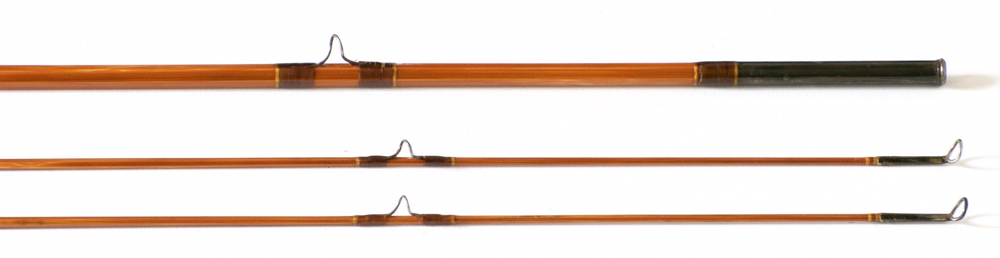 For sale here is a Payne Model 100 bamboo rod in excellent condition. The rod weighs 3 1/4 oz. with cap and ring reel seat over a Spanish cedar spacer. 7 1/2' 2/2, best with a DT4. The reel seat bears the “Payne” trademark stamp as well as the Sold by Abercrombie and Fitch stamp. Red agate stripping guide. The Model 100 is one of Payne’s most popular tapers, with a more medium action as compared to the slightly heavier Model 101 which was a faster action rod. All sections are full length and straight. The size 12/64 ferrule fit is perfect. Complete with original bag and tube. Steve Blake rewrapped the hook-keeper silks but it's difficult to notice.