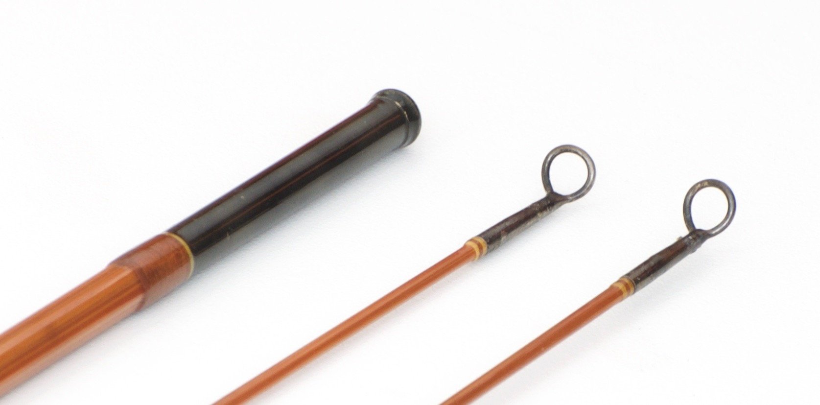 Chestnut silks tipped with gold and gold and purple tipping at the winding check and male ferrules. Crimson-colored agate stripping guide. Bronzed ring hook keeper. The reverse half wells grip measures 6" with only the slightest of handling marks. Bright aluminum up-locking reel seat over a Spanish cedar spacer. The locking ring features the Payne stamp. The blued nickel silver ferrules measure 12/64 with an excellent fit. The rod weighs an even 4 oz. Medium fast dry-fly action. Original bag and tube included.
