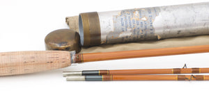 The rod features moderately tempered cane with chestnut wraps and gold tipping. Gold and purple tipping at the winding check and male ferrules. Blued hardware throughout. The original reverse twist English-style guides were retained during the restoration. Ring hook keeper over the gradually and mildly swelled butt. The original cigar grip measures 6" in length and has had plastic shrink-wrap placed over it for protection. Classic cap and ring reel seat over a mortised Spanish cedar spacer. The reel seat bears the “Payne” trademark stamp as well as the "Made for Abercrombie & Fitch Co." stamp. The step-down ferrules have retained an excellent fit and include an original ferrule plug. The rod weighs in at 4.15 oz. The Model 102 is a scarce one with a light dry fly action.