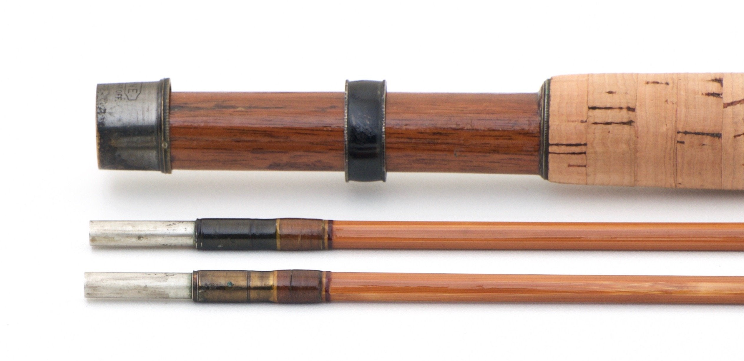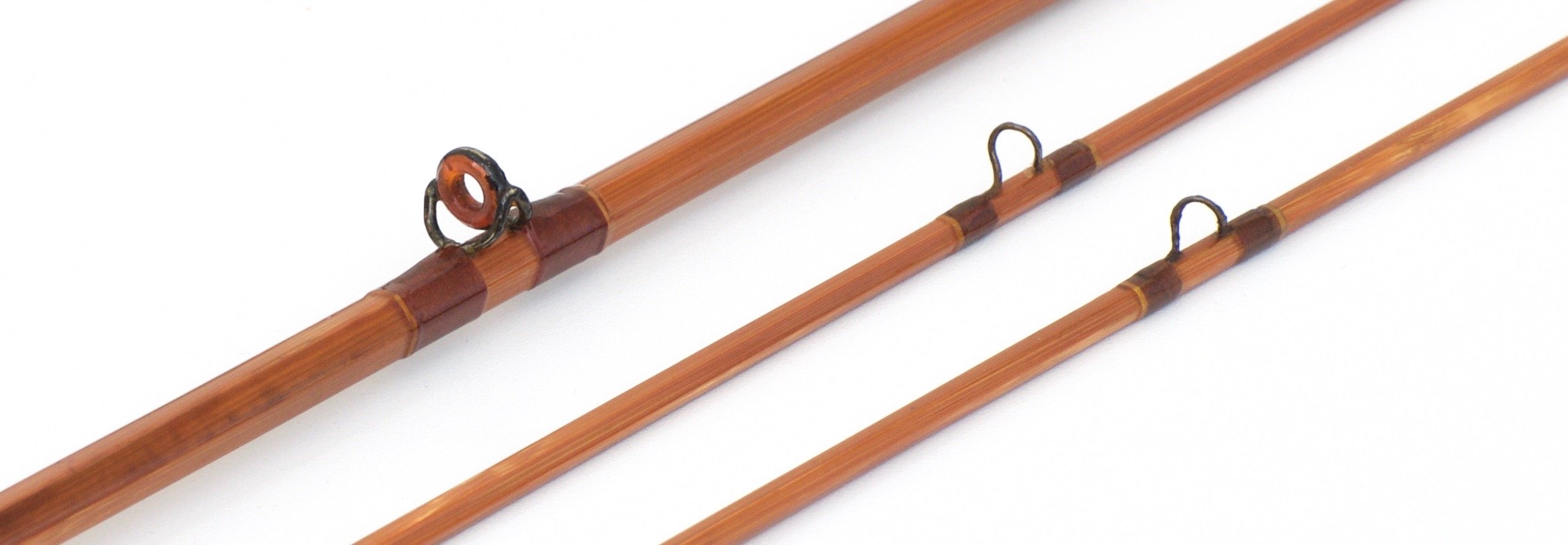 For sale here is a Payne Model 102H bamboo fly rod -- 8' 2/2 5wt. The rod is in excellent restored condition. The restoration appears to have been done quite a while ago by a very competent practitioner. The rods does show slight evidence of use post-restoration. The reel seat bears the “Payne” trademark stamp. The Model 102H is a scarce model with a great dry-fly action. Handsome agate stripping guide. The grip is 5 7/8" in length and slightly ridged. Skeleton reel seat over a varnished Spanish cedar spacer. The butt cap displays wear around the edge. The ferrule fit is buttery smooth. The rod weighs an even 4 oz. Complete with original bag and tube. The hang tag remains intact and clearly legible.