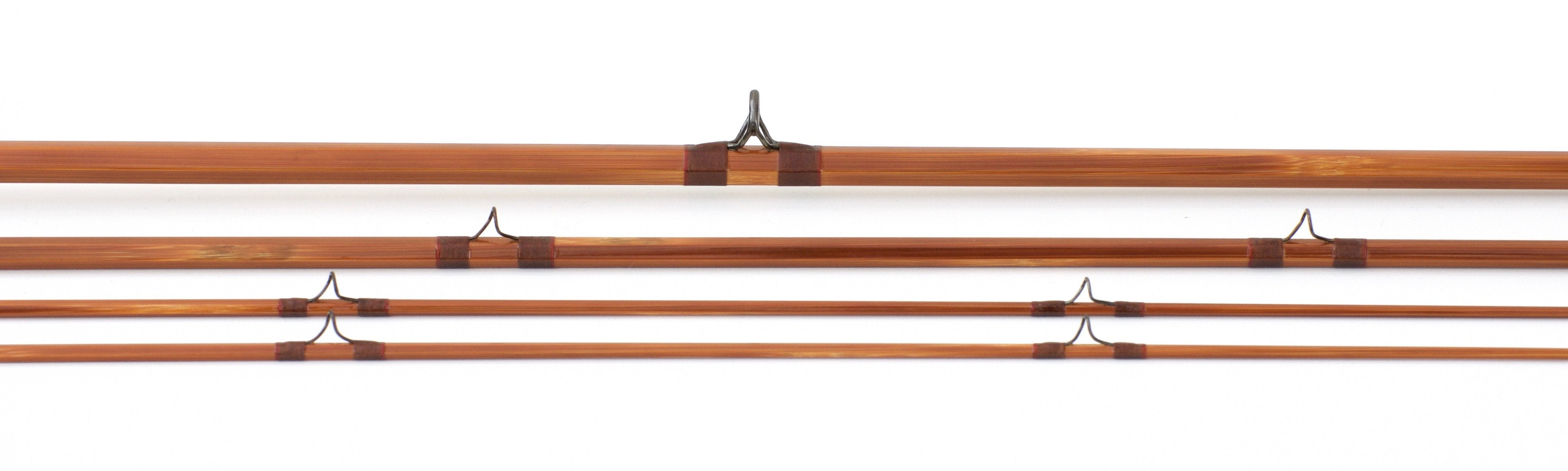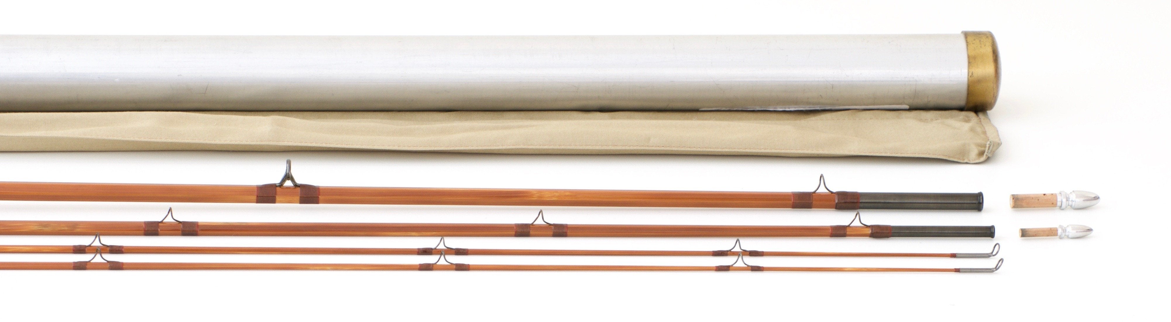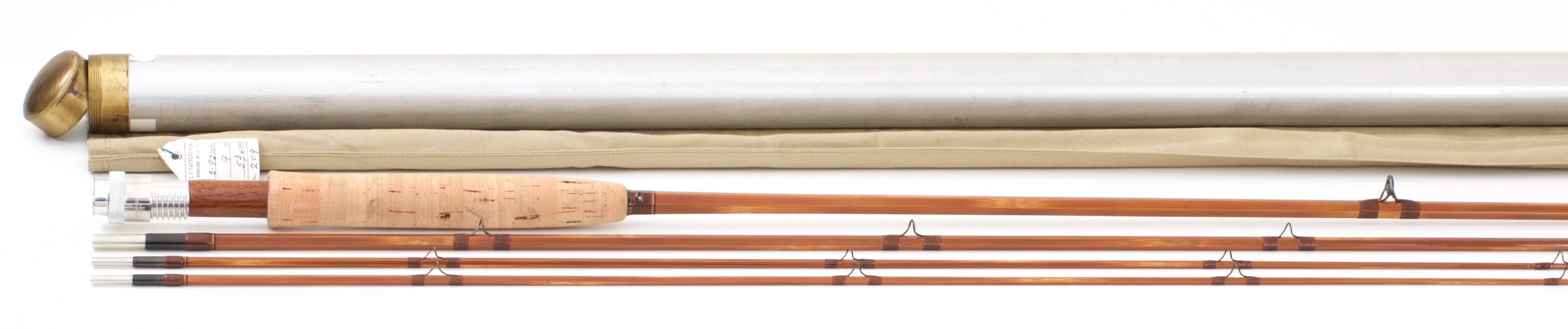 For sale here is a very scarce E.F. Payne Model 209 -- 9′ 3/2 dry fly bamboo rod for a six weight line. Near mint and original condition. Made for and sold by Abercrombie and Fitch in the 1960s. Wraps are chestnut brown with red, with red, gold, and purple at the winding check and male ferrules. Handsome swelled butt. Grip shows only light handling marks. The uplocking reel seat remains in pristine condition. Stamp on the locking ring reads, "Made for Abercrombie and Fitch New York". The ferrules are size 11/64 and 17/64 with a perfect fit. Ferrule plugs are included. The rod weighs 5.70 oz. A very powerful caster. Includes original bag with pristine hang tag intact as well as the original rod tube.