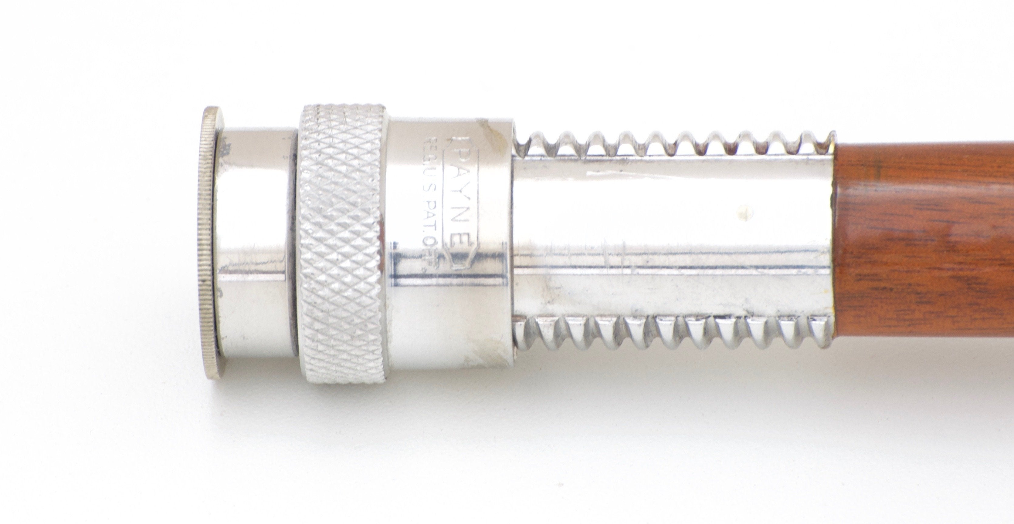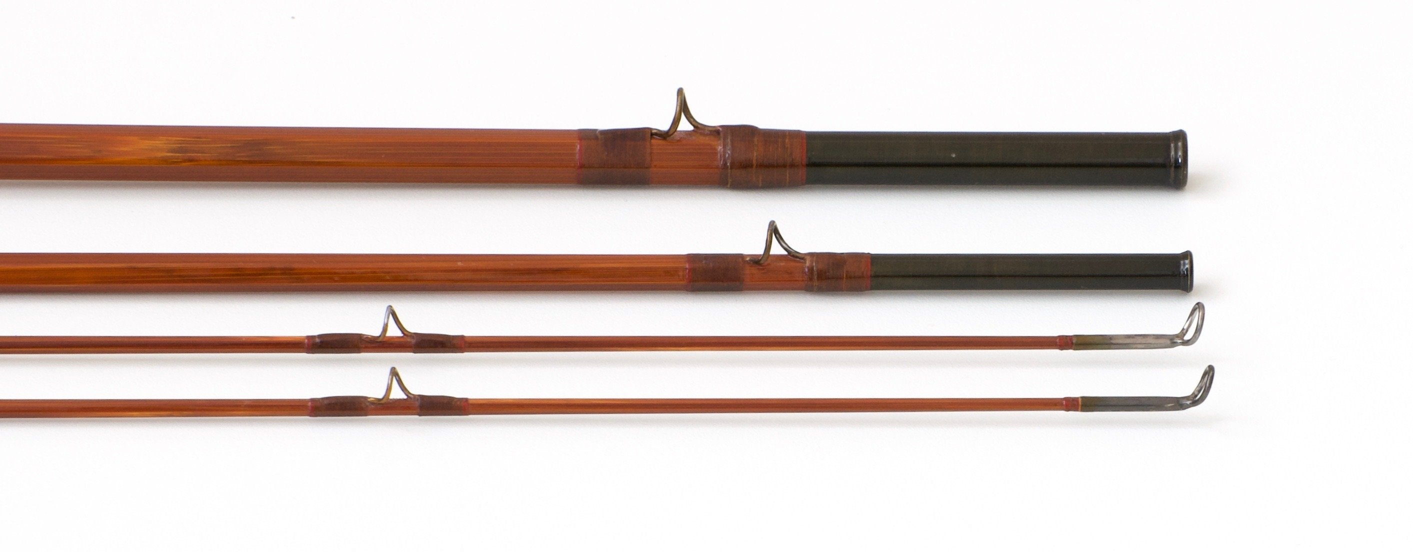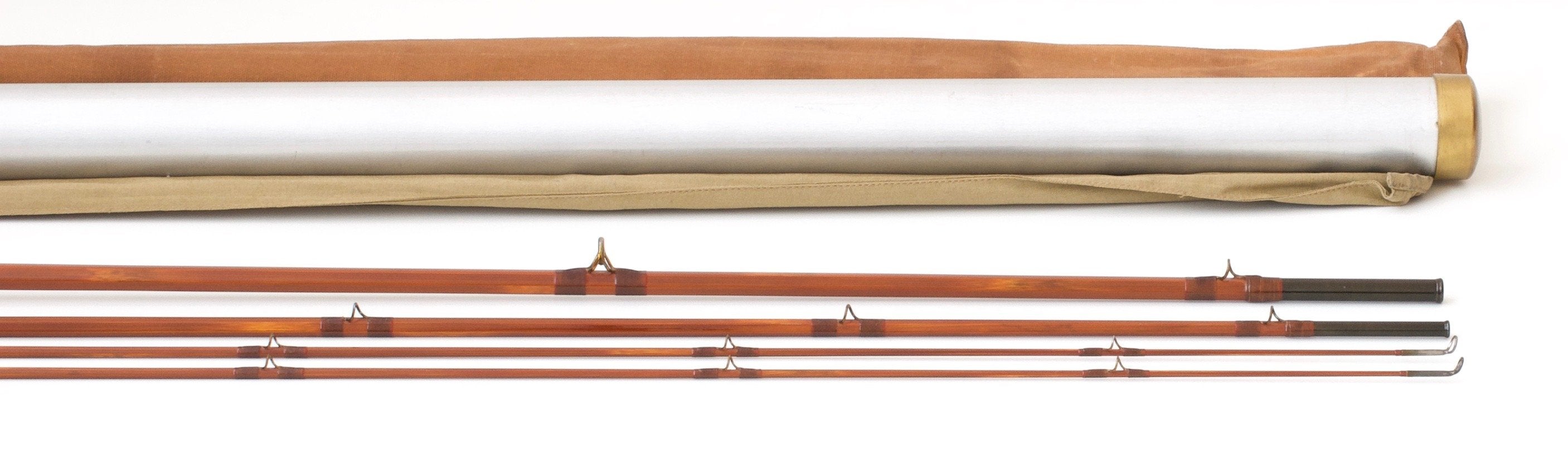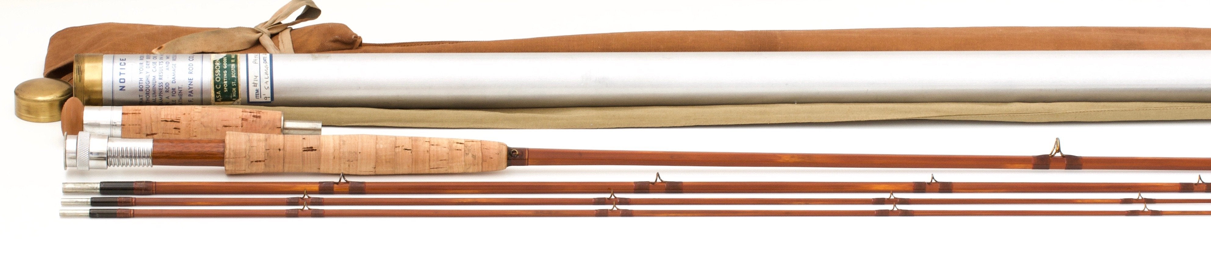 For sale here is a E.F. Payne Model 400 -- 9′ 3/2 light salmon rod for a #8 line. Original and excellent+ overall condition. This rod features beautiful dark cane, has an uplocking screw-lock reel seat with Payne's standard Spanish cedar spacer, and a 6" detachable extension handle with detachable rubber button. Wraps are beige with red tipping with additional wraps at the keeper and male ferrules. Comes with the original Payne rod bag and rod tube (and canvas tube cover with separate compartment for the handle extension). The label on the tube remains in excellent condition. The rod weighs 6 7/8 oz. A delightful Payne salmon rod in amazing condition!