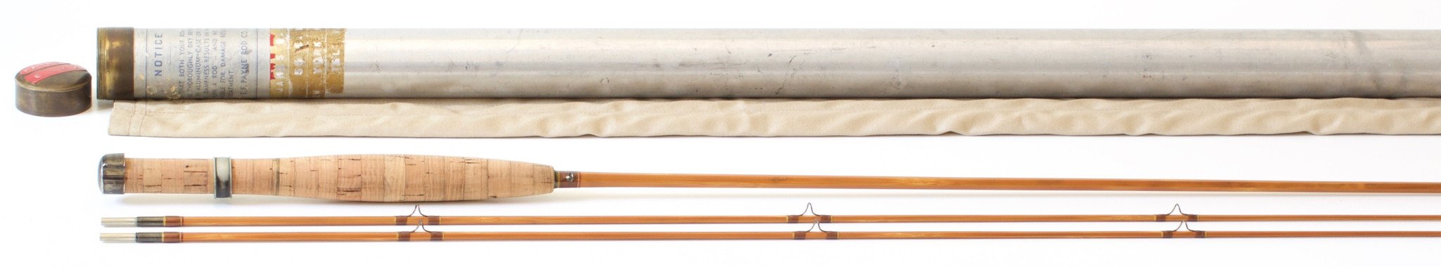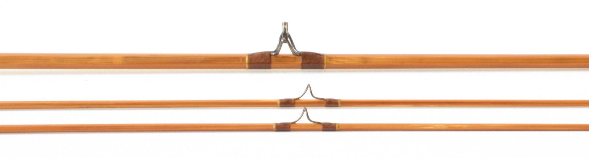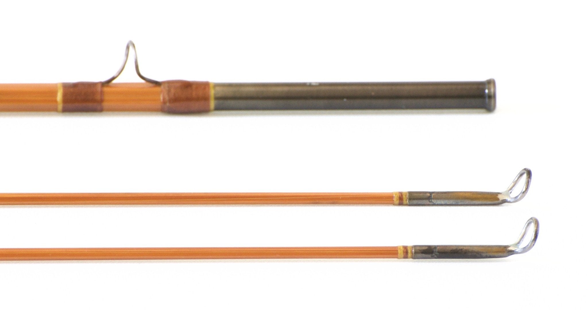 For sale here is a Payne Model 96 in excellent original condition. 6 1/2 feet in length with two sections and two tips. The rod weighs 2.6 oz. Oxidized cap and ring reel seat over cork. Java brown silks tipped yellow with additional purple tipping at winding check and male ferrules. All sections are full length and straight and the 9/64 ferrule fit is buttery smooth. Nice medium fast dry fly action. Complete with original bag and tube. Made between 1963 and 1968 before Jim Payne's passing.