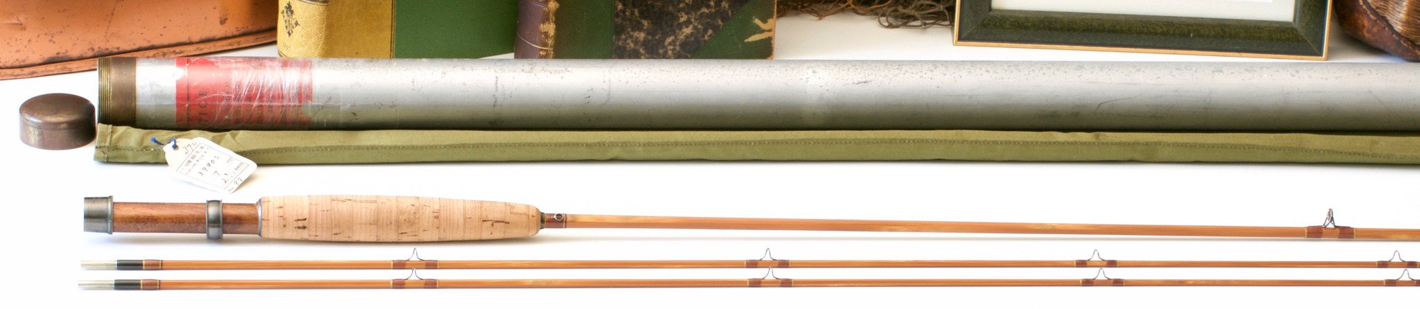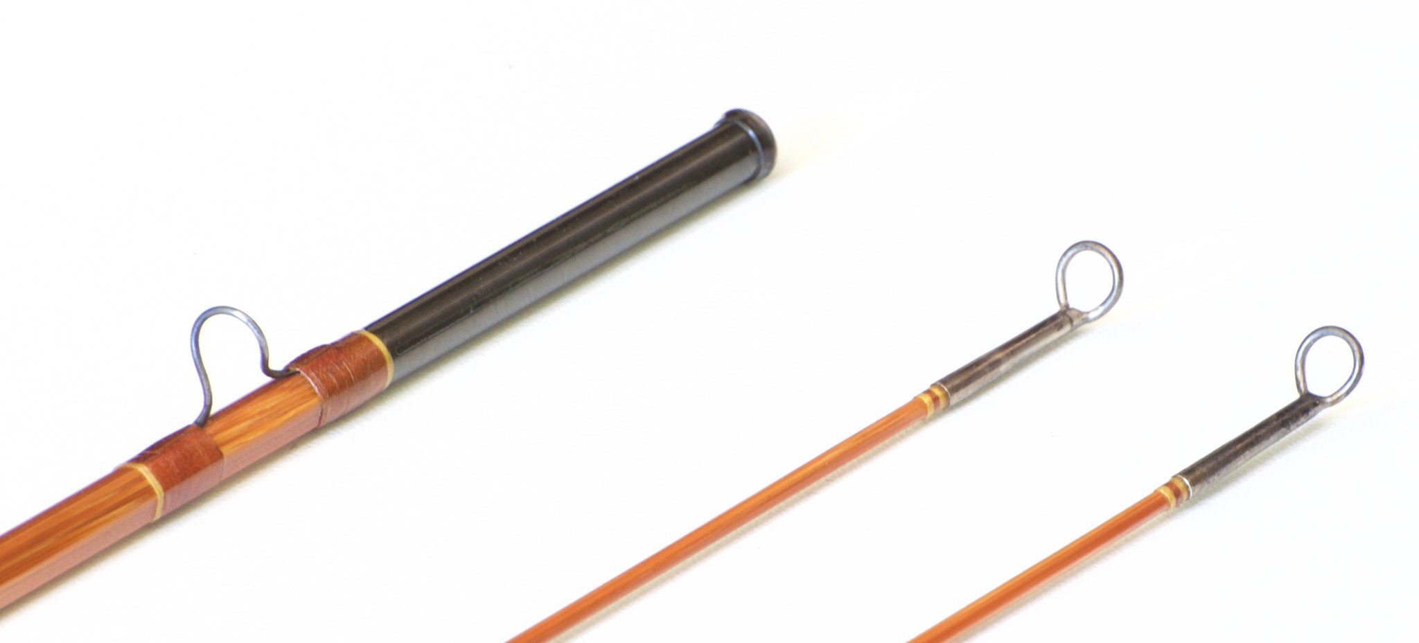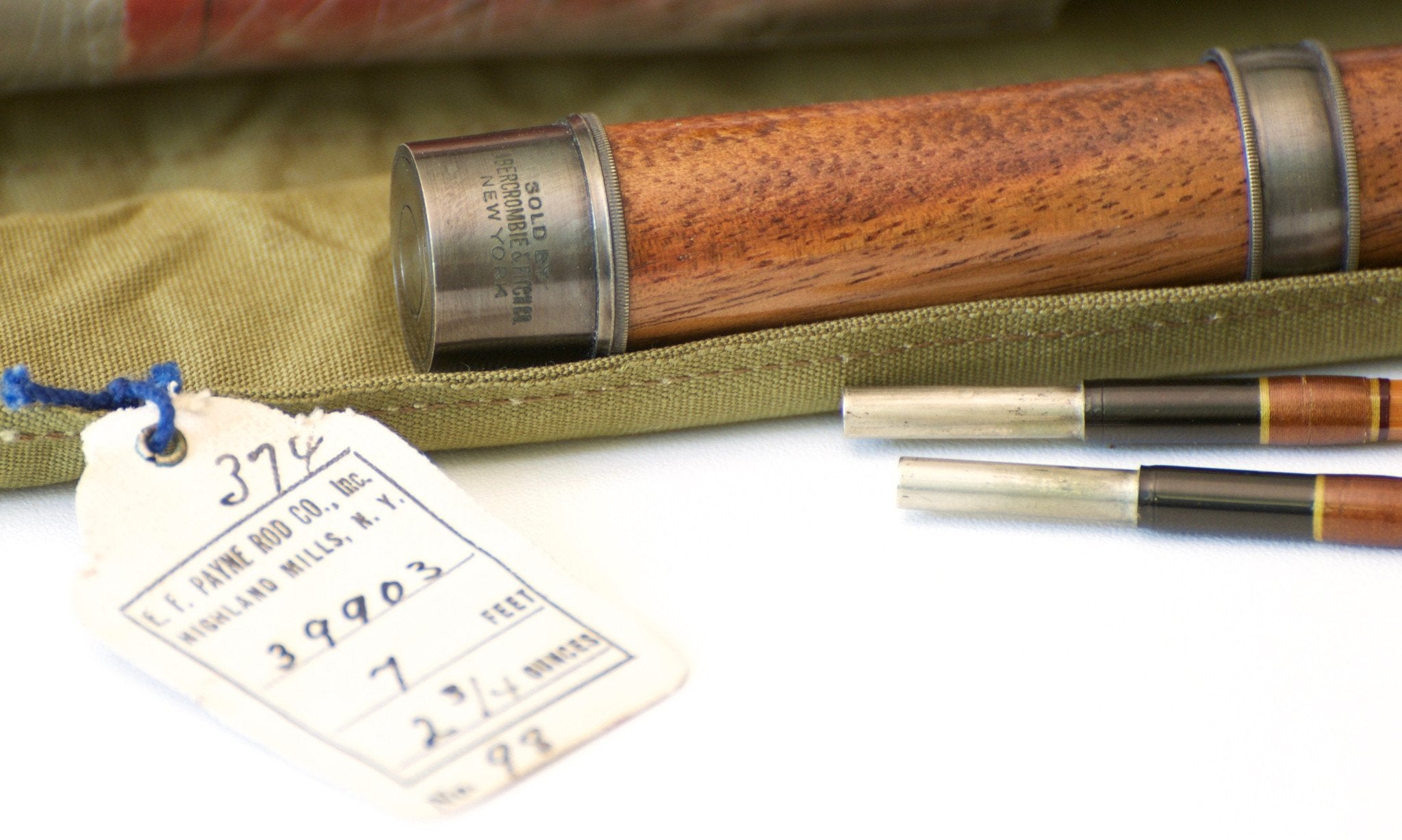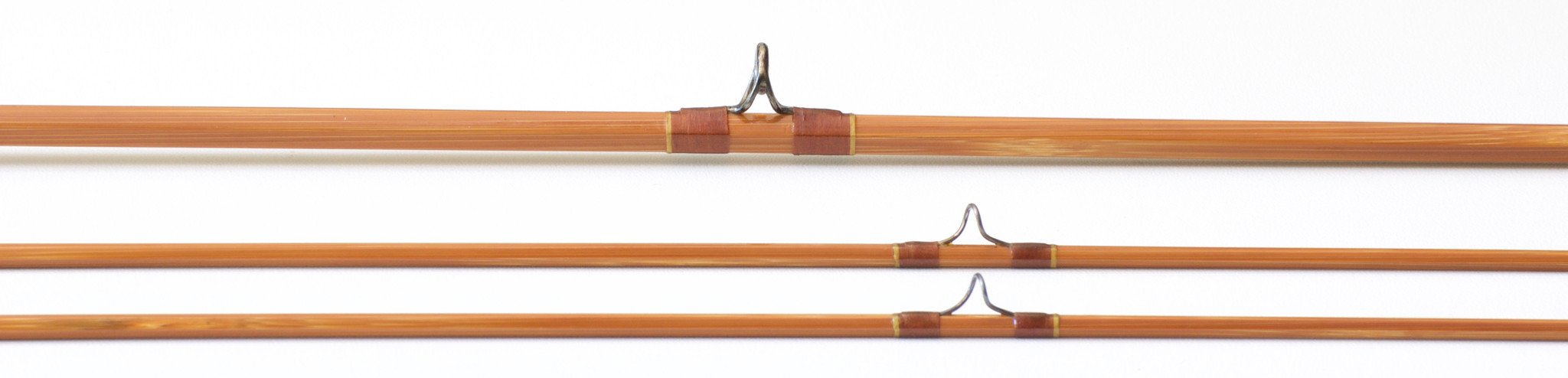 For sale here is a Payne Model 98 in excellent plus condition. The rod weighs 2 3/4 oz. 7' 2/2 for a 4 weight line. All sections are full length and straight. The rod's varnish had melted down so the prior owner stripped the original varnish and brushed on one new coat. Very nicely done. The silks, oxidized hardware and guides are 100% original, as is the grip. Chestnut brown wraps with gold tipping. Browntone cane. Cigar grip in excellent condition. Cap and ring reel seat over spanish cedar. "Sold By Abercrombie & Fitch Co. New York" stamped on butt cap. The rod has a very smooth medium action. Ferrules are size 11/64 and the fit is perfect. Comes with original bag with hang tag and original tube with label. A beautiful example of perhaps the most popular seven foot bamboo rod ever made!