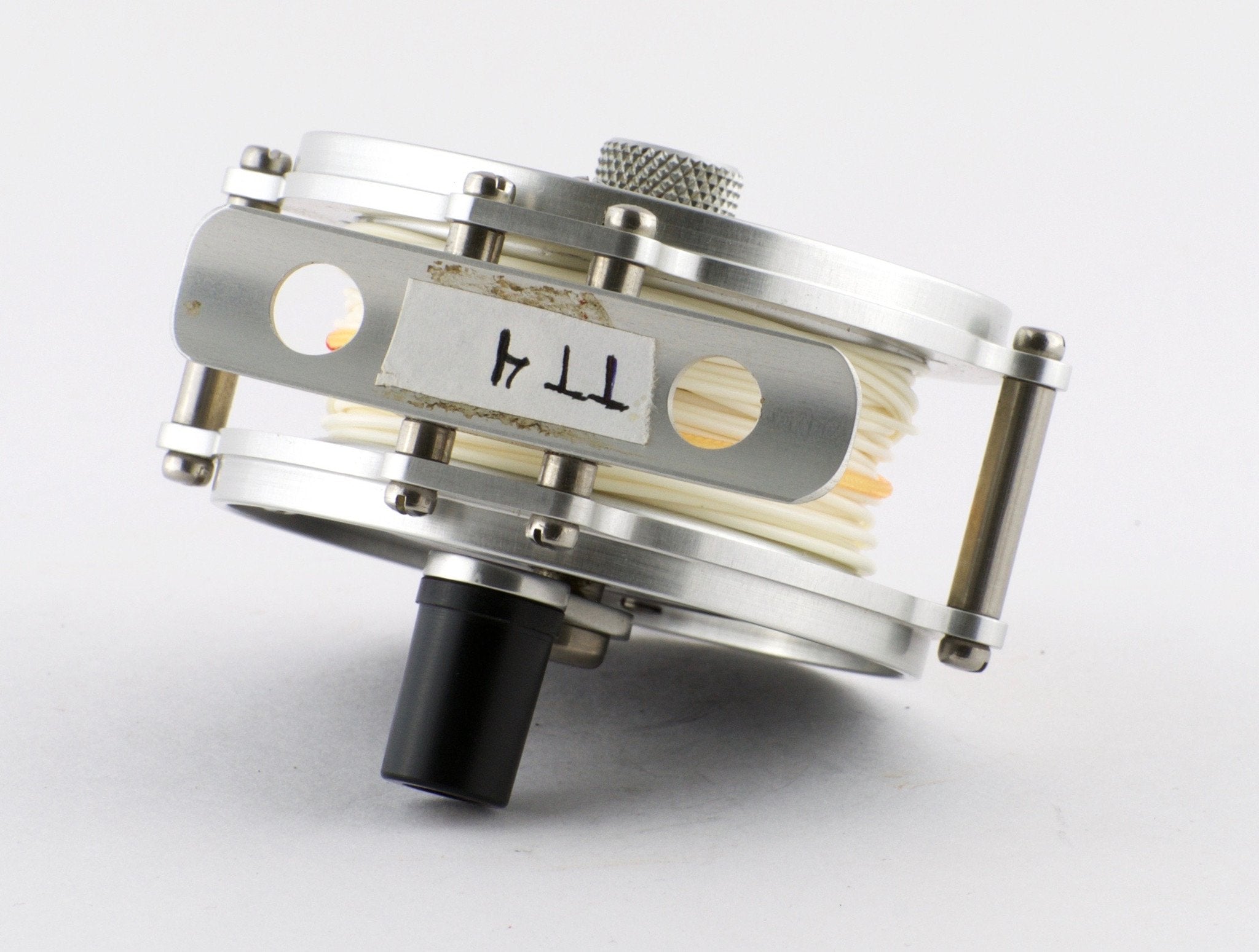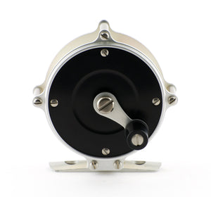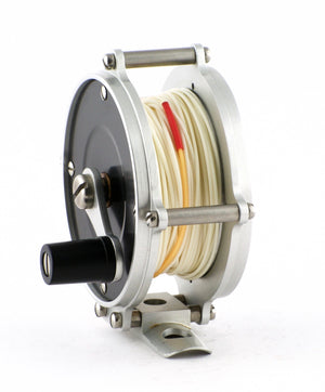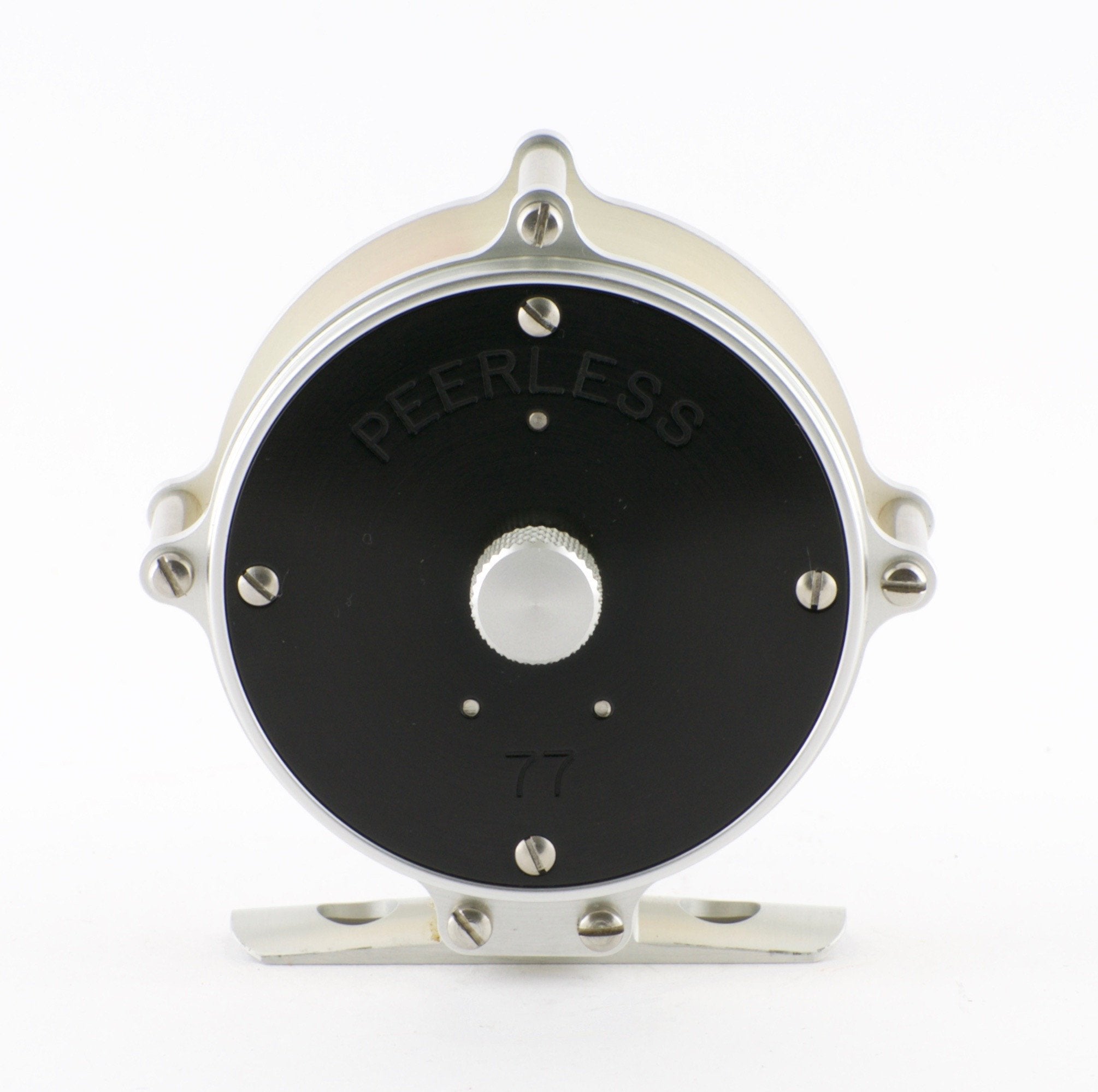 For sale here is a Peerless 77 raised pillar fly reel innear mint+ condition. The only marks are insignificant ones on the foot from being mounted on a rod. Left hand retrieve but reversible to right if desired. Comes with original Peerless zippered pouch, box, and paperwork. 2 1/2" diameter (without the pillars). The like new Wulff Triangle Taper 4 line is included with the sale.